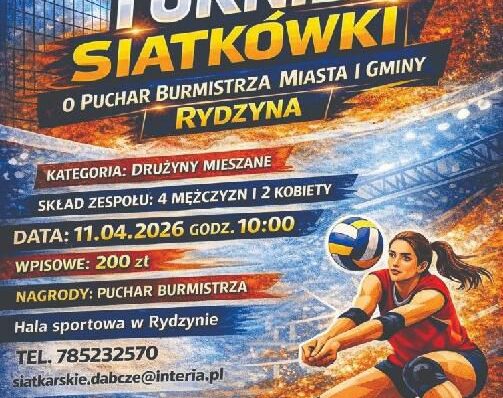 🏐 Turniej Siatkówki o Puchar Burmistrza Miasta i Gminy Rydzyna Już 11 kwietnia 2026 roku w hali sportowej w Rydzynie odbędzie się Turniej Siatkówki o Puchar Burmistrza Miasta