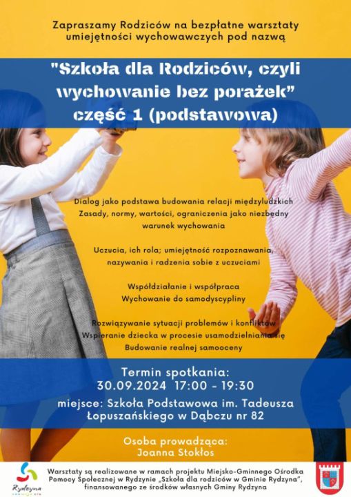 W minionym tygodniu w gminie Rydzyna odbyły się bezpłatne warsztaty dla rodziców zatytułowane "Szkoła dla rodziców, czyli wychowanie bez porażek". W ramach projektu zorganizowano trzy spotkania, które miały na celu poprawę umiejętności wychowawczych i wzmocnienie relacji między rodzicami a dziećmi. Warsztaty prowadzone były przez doświadczonych specjalistów w różnych miejscowościach gminy: w Kaczkowie, Dąbczu i Rydzynie.