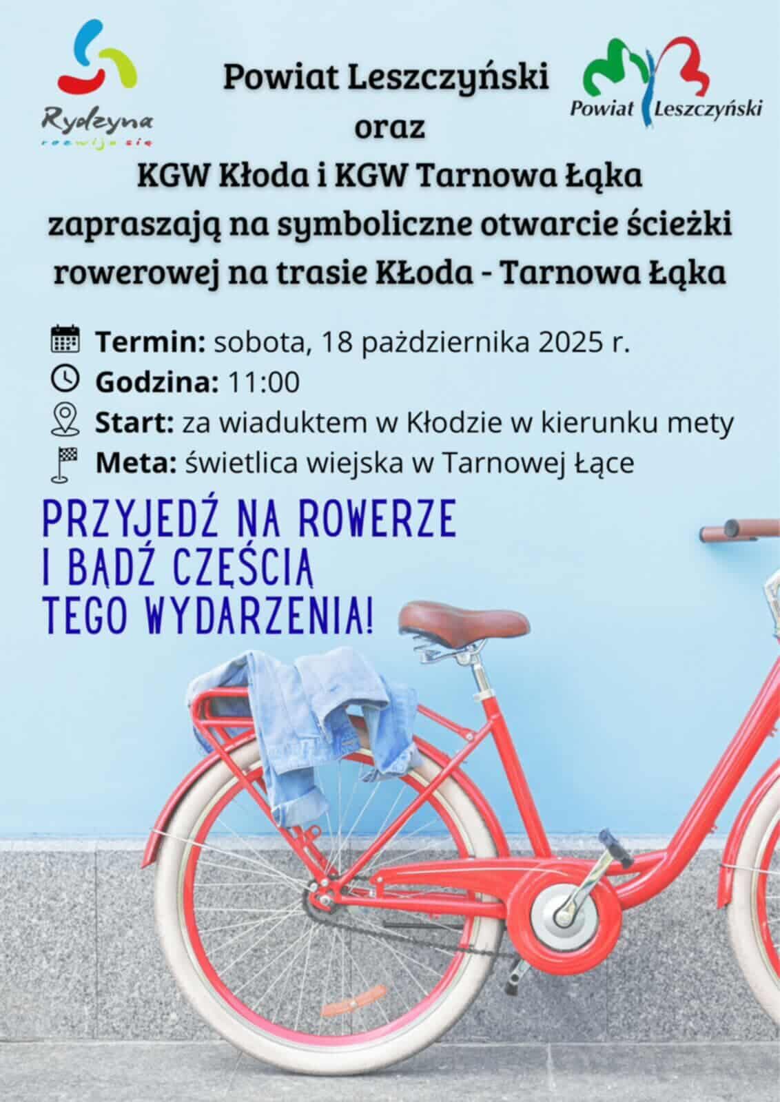 Powiat Leszczyński wraz z Kołami Gospodyń Wiejskich z Kłody i Tarnowej Łąki zapraszają mieszkańców na symboliczne otwarcie ścieżki rowerowej na trasie Kłoda – Tarnowa Łąka, które odbędzie się w sobotę, 18 października 2025 roku o godzinie 11:00.