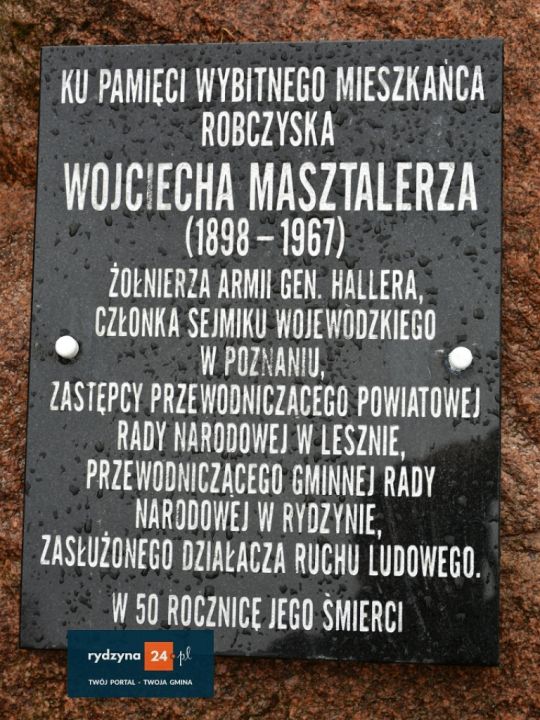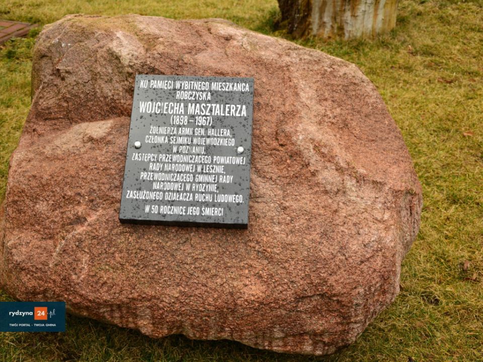 Wojciech Masztalerz miał cztery siostry i trzech braci. Dwaj bracia zginęli podczas pierwszej wojny światowej. Wojciech przeżył działania wojenne, w których zresztą aktywnie uczestniczył (jako żołnierz Armii Hallera) i po wojnie mógł realizować się społeczno – politycznie. Pełnił funkcje: członka Sejmiku Wojewódzkiego w Poznaniu, zastępcy przewodniczącego Powiatowej Rady Narodowej w Lesznie oraz przewodniczącego Gminnej Rady Narodowej w Rydzynie. 50 rocznica jego śmierci stała się pretekstem do uczczenia jego pamięci. Miejscowość, w której pojawił się kamień, jest nieprzypadkowa – Wojciech właściwie przez całe swoje życie związany był z Robczyskiem.