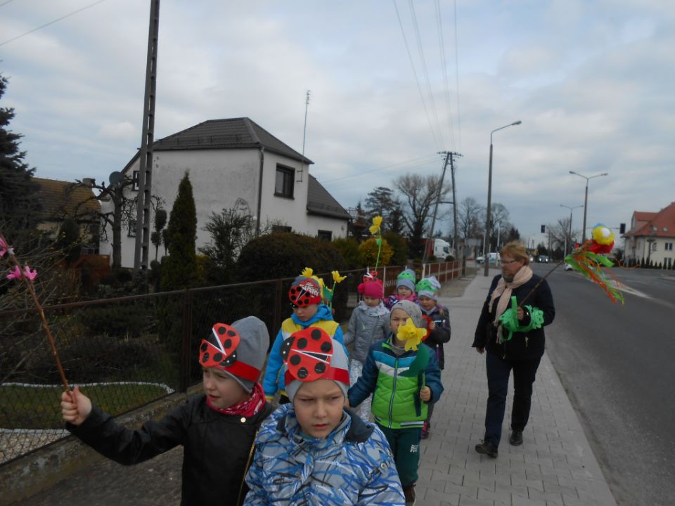 Po zabawie w sali wyruszyliśmy  barwnym pochodem na spacer  trzymając w rękach   Marzannę, instrumenty perkusyjne i kolorowe kwiaty. W ten sposób wszystkie dzieci chciały wyrazić swoją radość z przyjścia nowej pory roku. Głośnymi okrzykami: ,,Precz zimo zła” i wesołą zabawą  pożegnały  zimę i powitały długo oczekiwaną wiosnę.