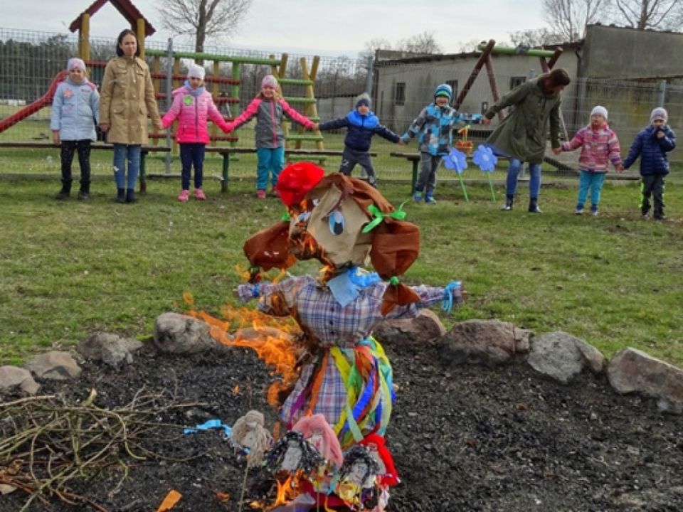 Dzieci spotkały się, by pożegnać zimę przy dźwiękach muzyki. Najpierw spaliły Marzannę.