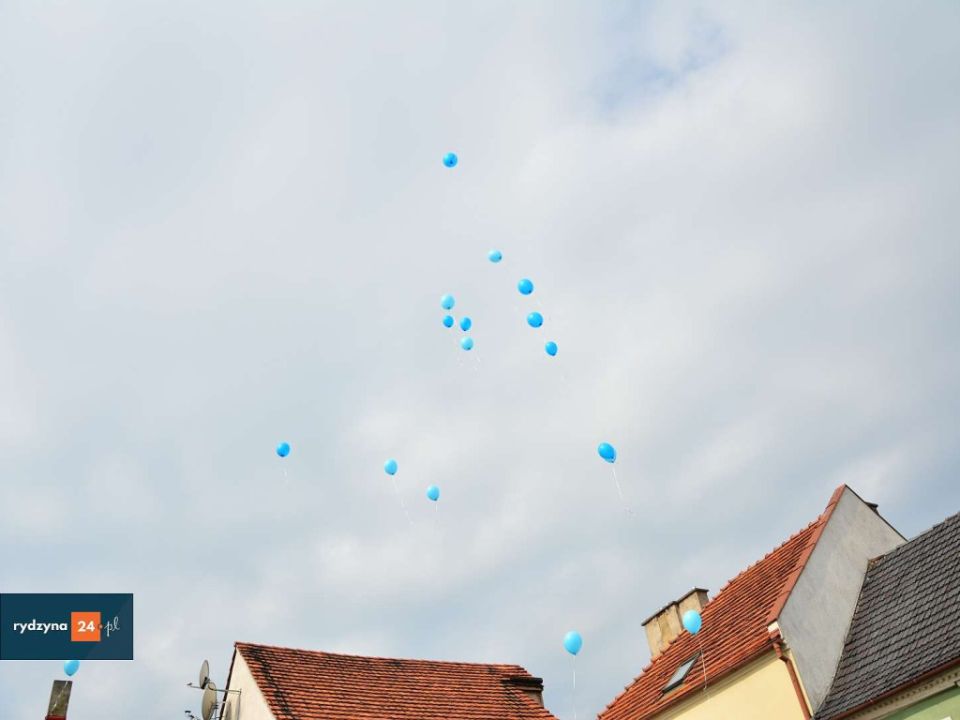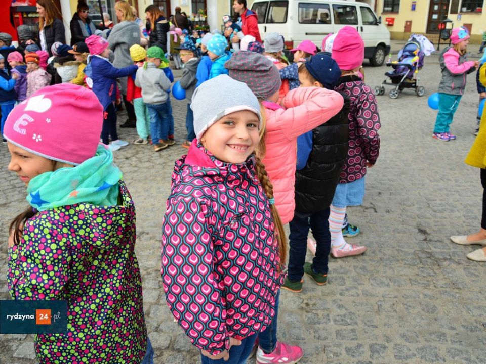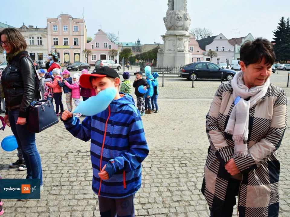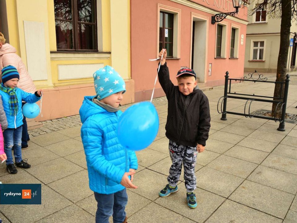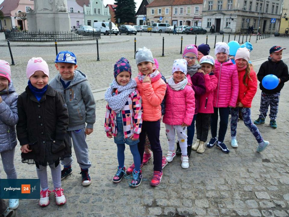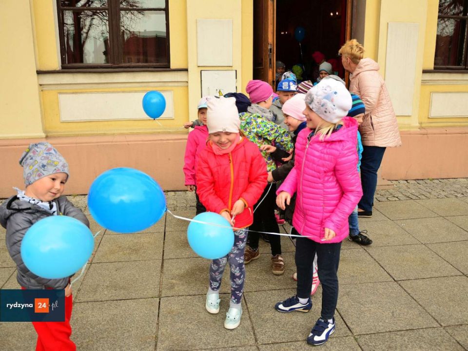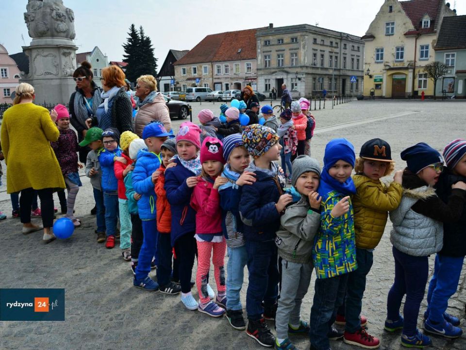 Po obejrzeniu przedstawienia dzieci przeszły z Rydzyńskiego Ośrodka Kultury na Rynek. Tam wypuściły w niebo niebieskie balony.