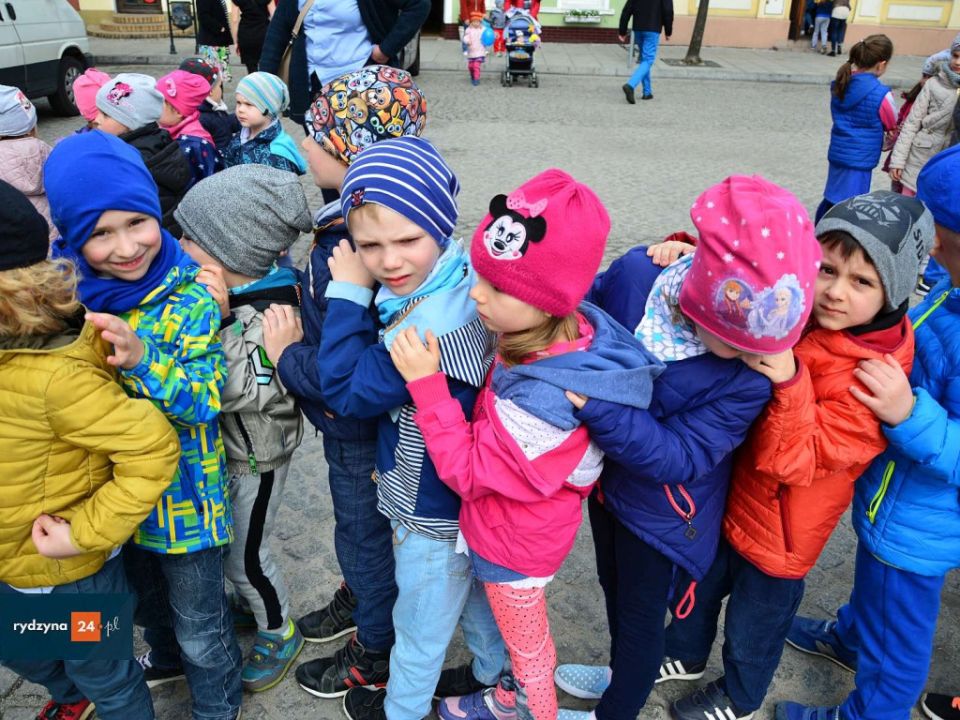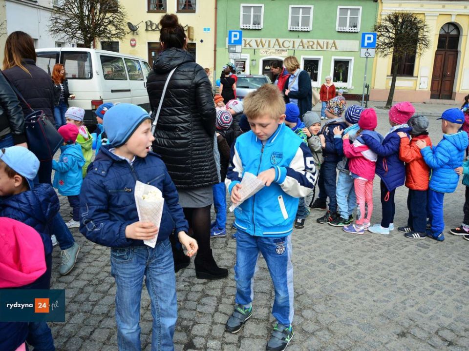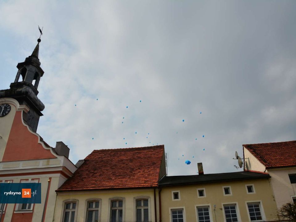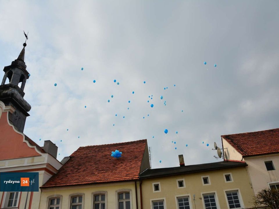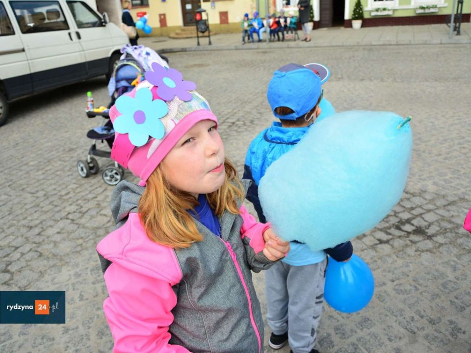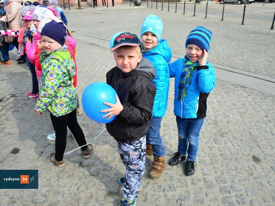 Po obejrzeniu przedstawienia dzieci przeszły z Rydzyńskiego Ośrodka Kultury na Rynek. Tam wypuściły w niebo niebieskie balony.