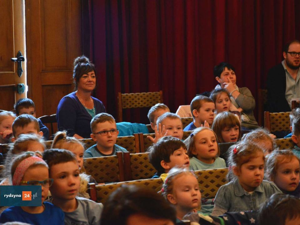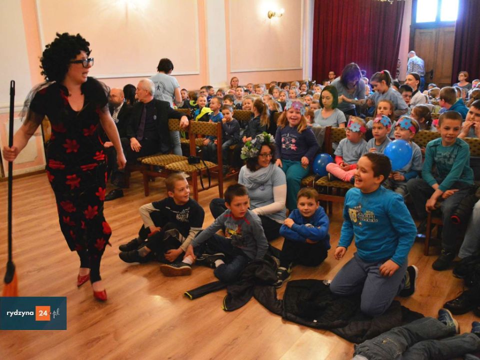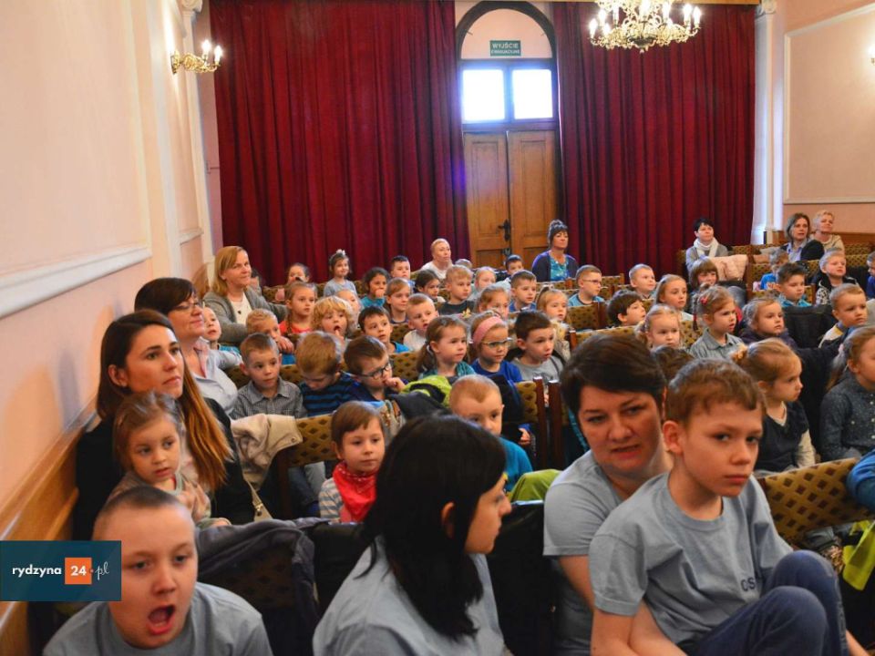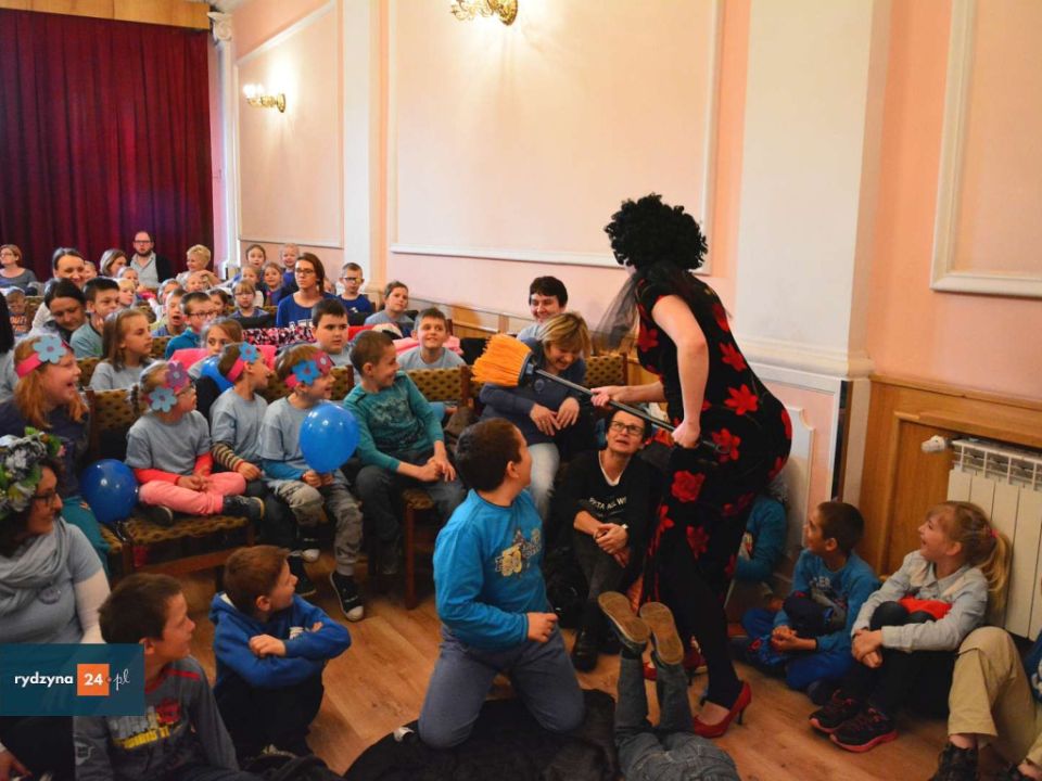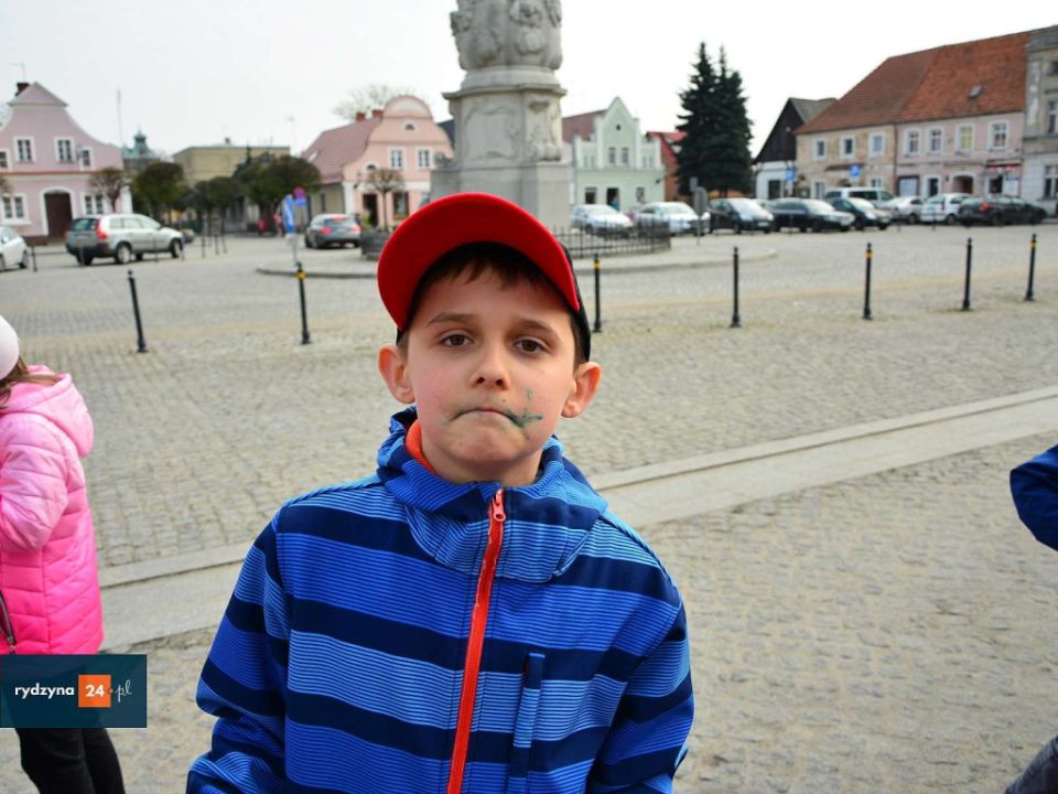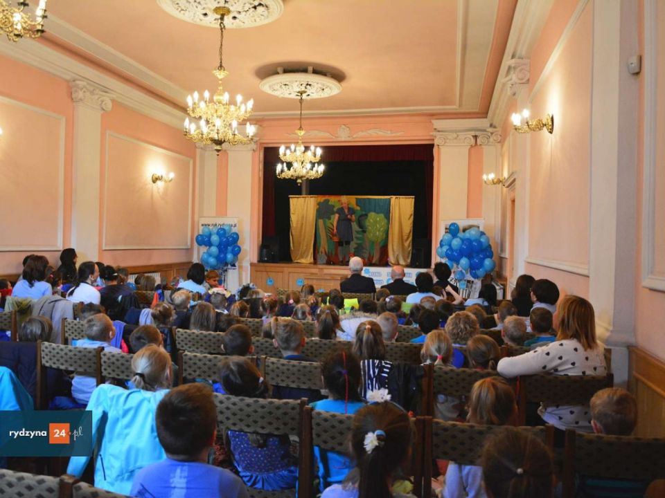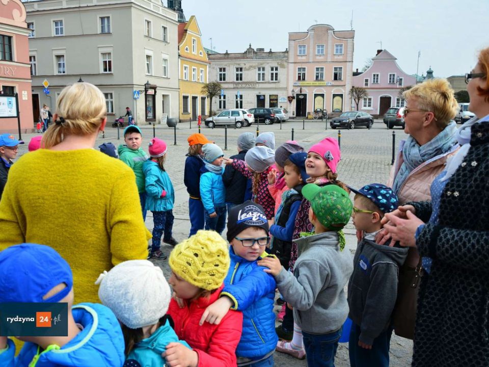 Po obejrzeniu przedstawienia dzieci przeszły z Rydzyńskiego Ośrodka Kultury na Rynek. Tam wypuściły w niebo niebieskie balony.