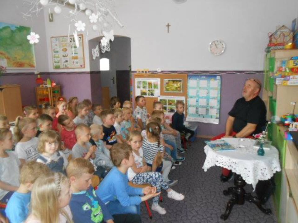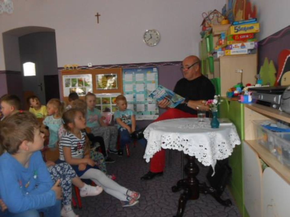 Gość zapoznał przedszkolaków z tomem wierszy dla dzieci ze swojej książki pt., „W leśnej operze”. W utworach dominuje motyw przyrody podpatrywanej i prezentowanej przez autora z odrobiną humoru. Dzieci mogły dowiedzieć się, co znaczy ,,być poetą”.