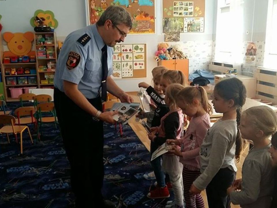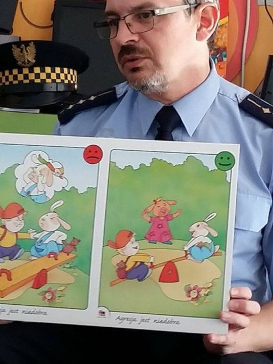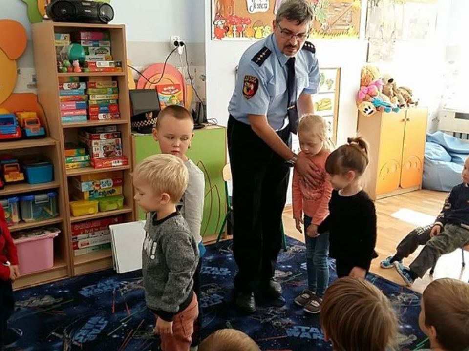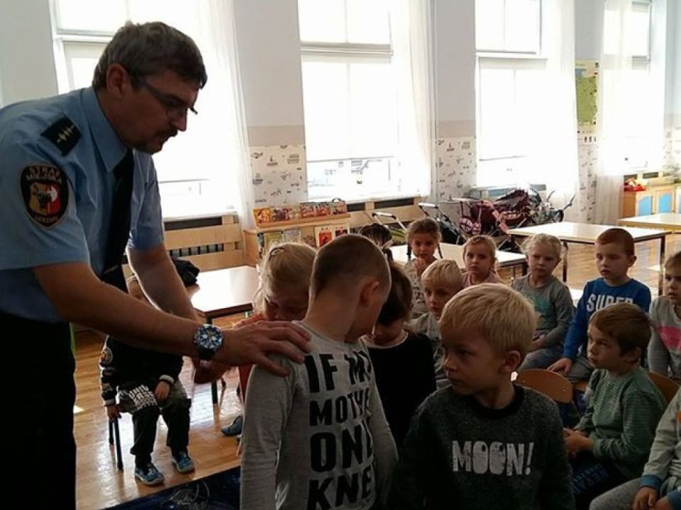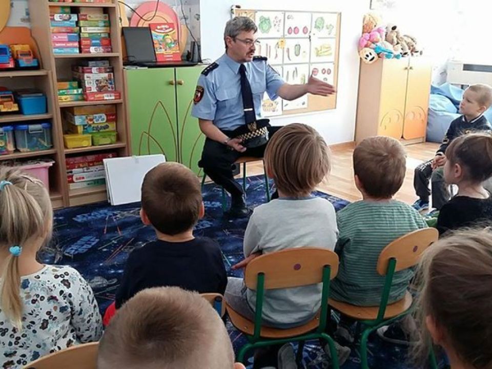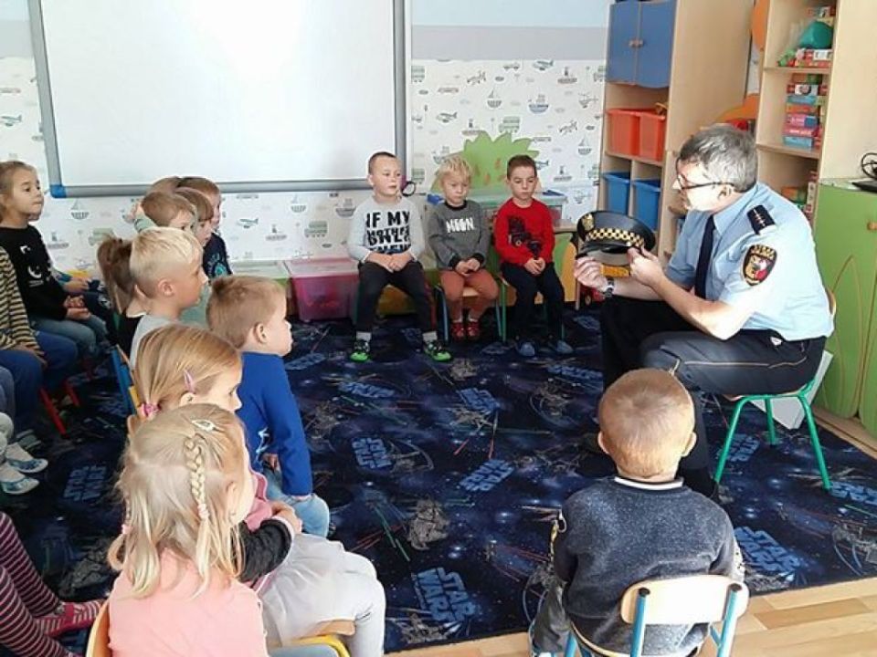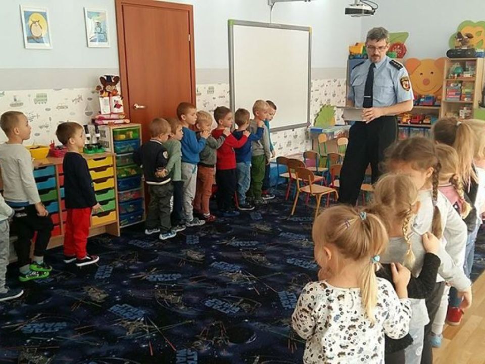 Starszy inspektor pan Rafał Pędziwiatr ze straży miejskiej z Leszna dnia 9 października przeprowadził w przedszkolu w Rydzynie zajęcia profilaktyczne dotyczące bezpieczeństwa.