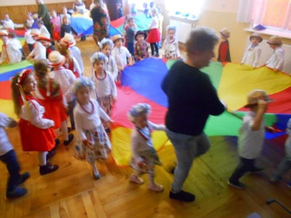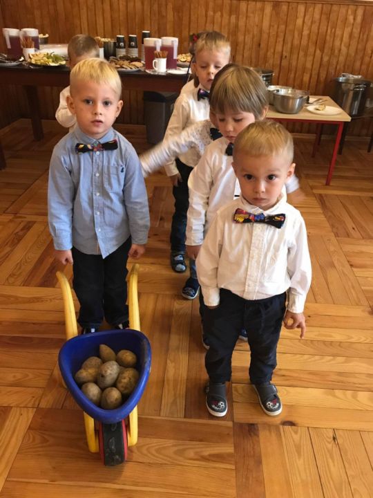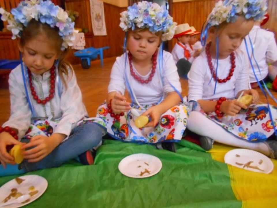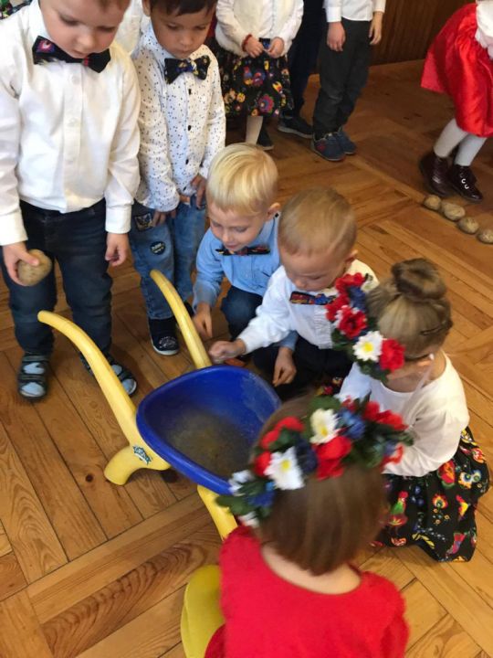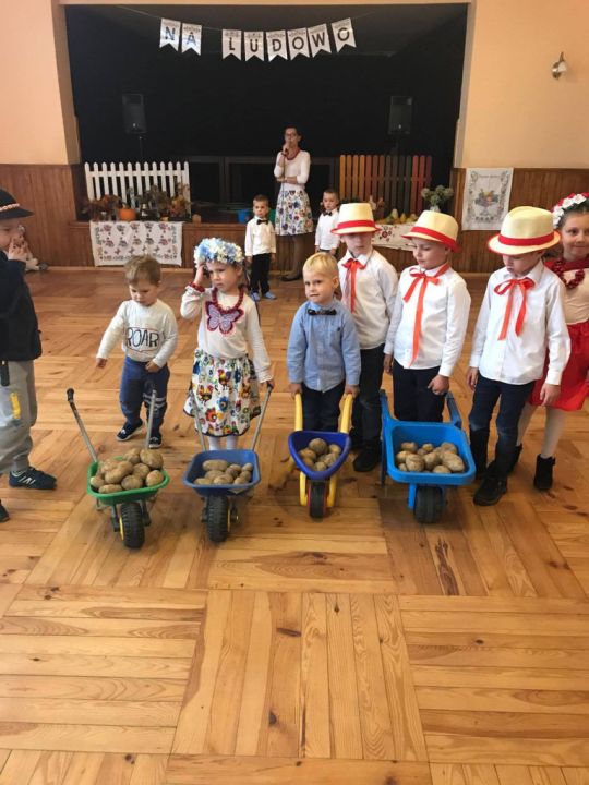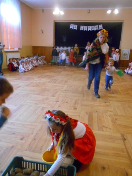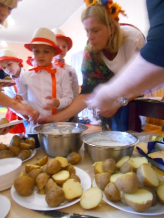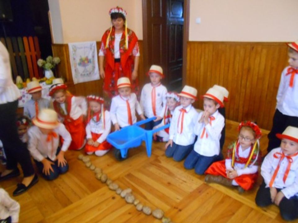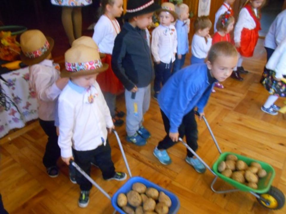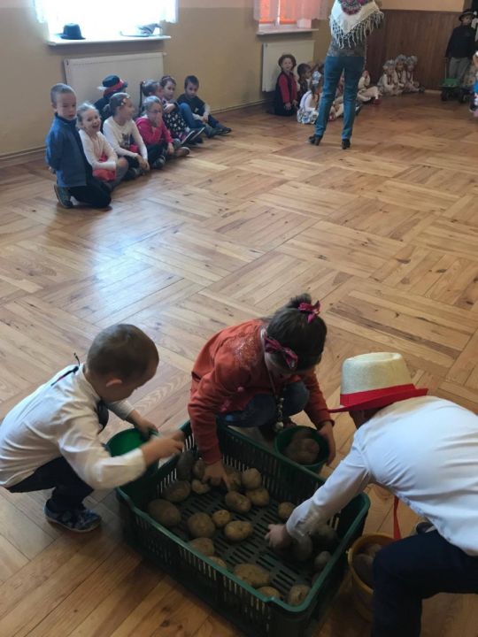 Dzieci dowiedziały się, jakie potrawy przygotowuje się z ziemniaków, poznały gwarowe nazwy ziemniaka. Wzięły udział w konkursach sprawnościowych, między innymi w: sadzeniu ziemniaków, zbieraniu w wiaderka, sztafecie z ziemniakiem na łopatce czy wyścigach taczek wypełnionych pyrkami. Emocjonujące konkurencje sprawnościowe przeplatane były tańcami i zabawami ludowymi. Pani Maria od rana gotowała pyry w mundurkach i przygotowała dla nas pyszną gzikę, którą delektowaliśmy się na zakończenie spotkania, a po zmaganiach apetyt dzieciom dopisywał.