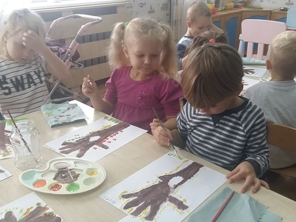 Dzieci odrysowywały dłonie i tworzyły z nich jesienne drzewa – zupełnie samodzielnie /prace można podziwiać na naszej gazetce – są piękne:)) następnie przedszkolacy wyruszyli na spacerek w poszukiwaniu drzewa w jesiennej szacie.