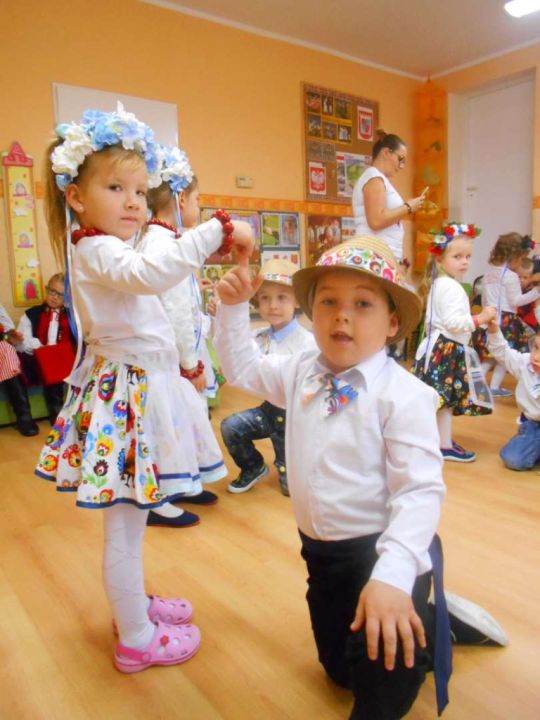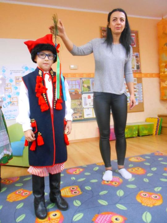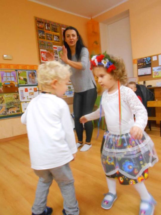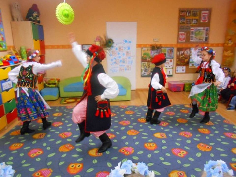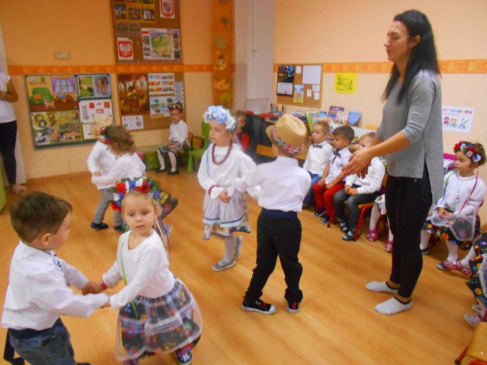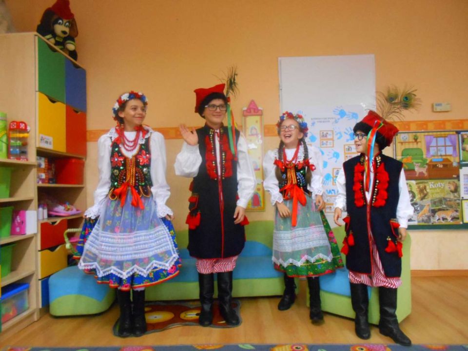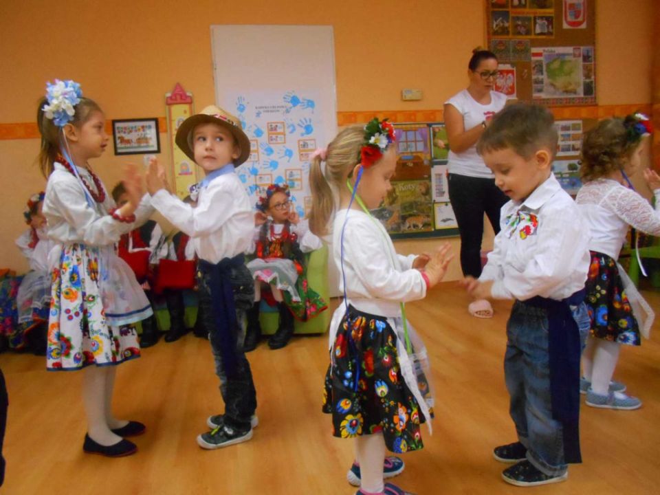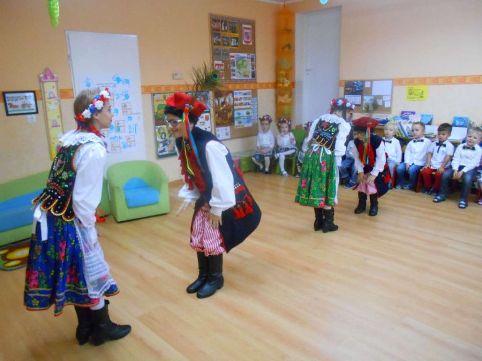 W ramach podejmowania różnych form aktywności rozbudzających zainteresowania tradycją, kulturą swojego miasta i okolic, a także w ramach współpracy ze środowiskiem lokalnym odwiedziła nas dzisiaj pani Patrycja Maciejewska, instruktorka tańca ze swoimi podopiecznymi: Kają, Julką, Kajtkiem i Mateuszem. Pani Patrycja opowiedziała dzieciom o Zespole Tańca Ludowego Moraczewo. Przedszkolacy zapoznali się szczegółowo z elementami krakowskiego stroju ludowego. Tancerze zaprezentowali nam krakowiaka, a my wiemy, jak nazywają się poszczególne figury: obroty, hołupce, krzesany, porębiańska i że krokiem podstawowym tego tańca jest cwał. Przedszkolacy pod okiem pani instruktorki uczyli się klepanego. Na zakończenie wszyscy otrzymali tematyczną kolorowankę.