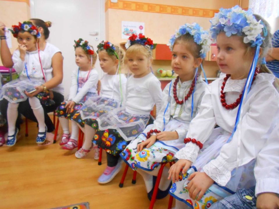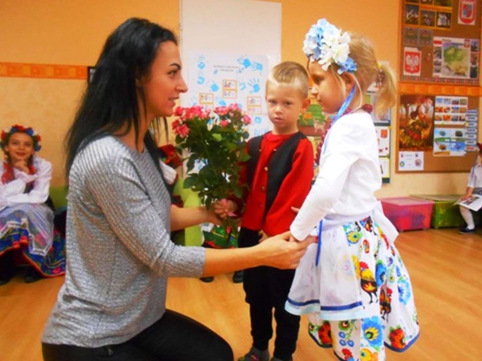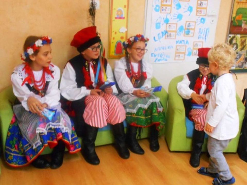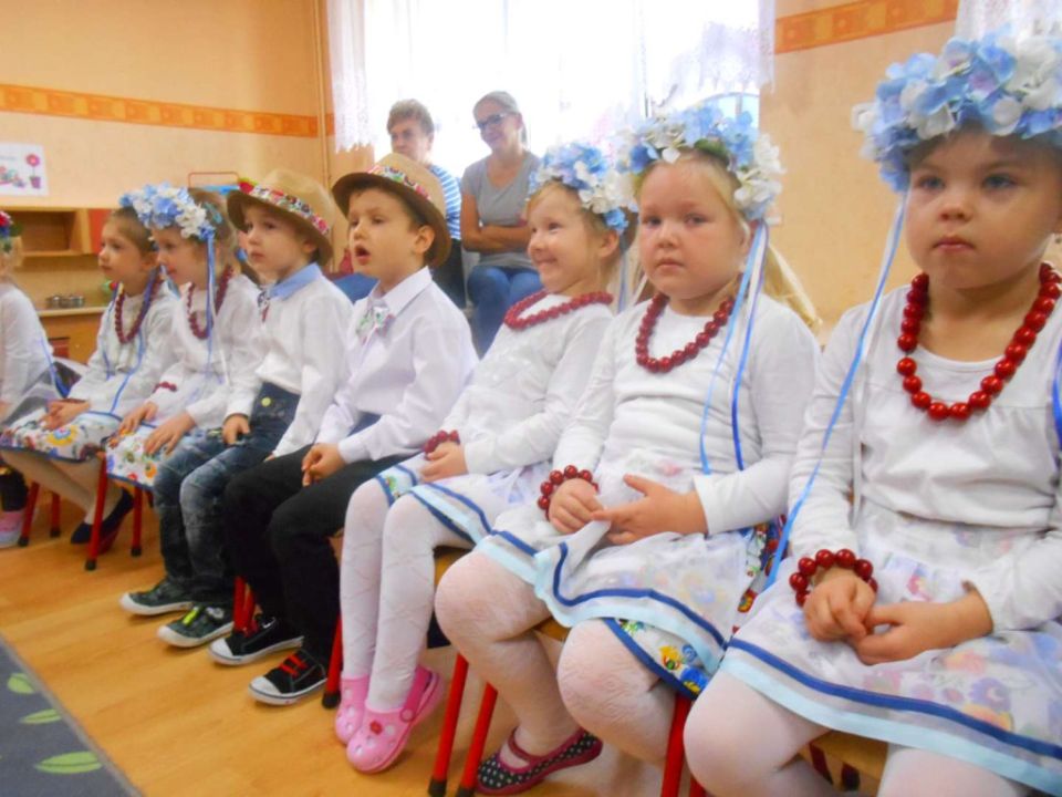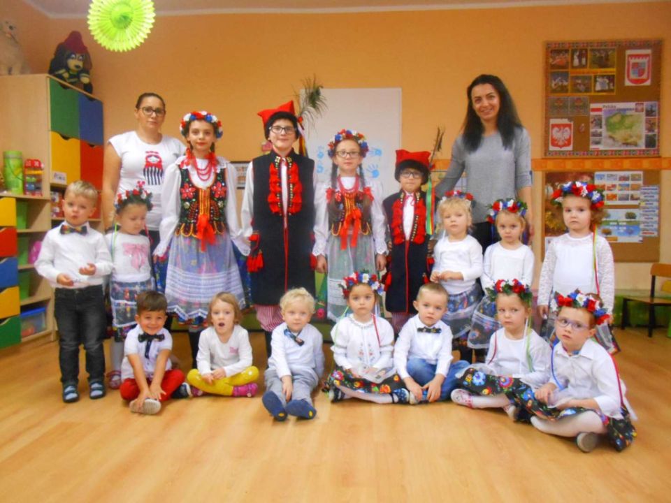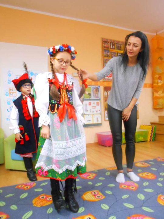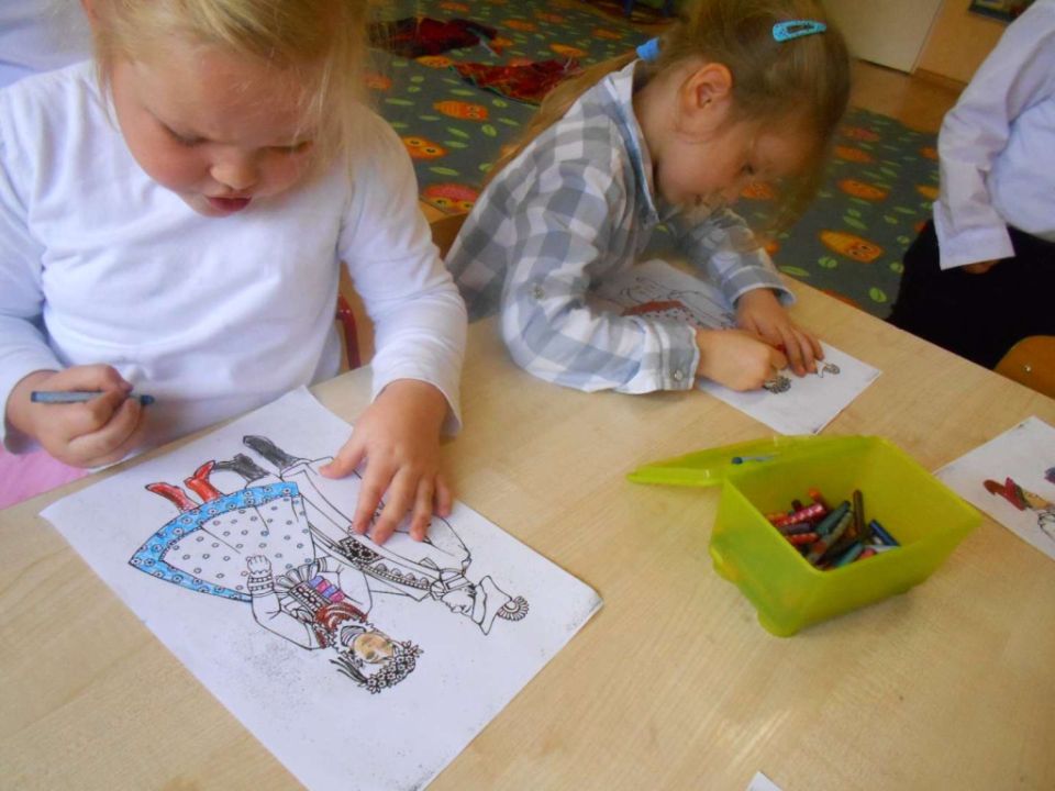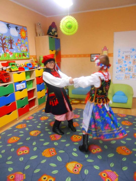 W ramach podejmowania różnych form aktywności rozbudzających zainteresowania tradycją, kulturą swojego miasta i okolic, a także w ramach współpracy ze środowiskiem lokalnym odwiedziła nas dzisiaj pani Patrycja Maciejewska, instruktorka tańca ze swoimi podopiecznymi: Kają, Julką, Kajtkiem i Mateuszem. Pani Patrycja opowiedziała dzieciom o Zespole Tańca Ludowego Moraczewo. Przedszkolacy zapoznali się szczegółowo z elementami krakowskiego stroju ludowego. Tancerze zaprezentowali nam krakowiaka, a my wiemy, jak nazywają się poszczególne figury: obroty, hołupce, krzesany, porębiańska i że krokiem podstawowym tego tańca jest cwał. Przedszkolacy pod okiem pani instruktorki uczyli się klepanego. Na zakończenie wszyscy otrzymali tematyczną kolorowankę.