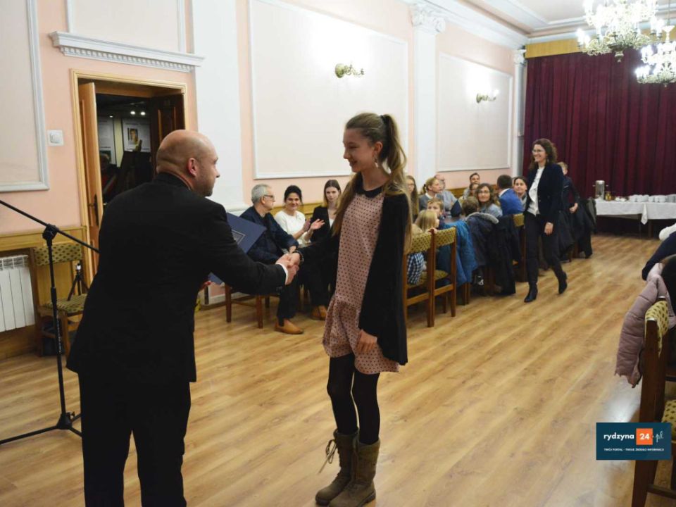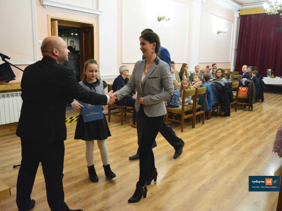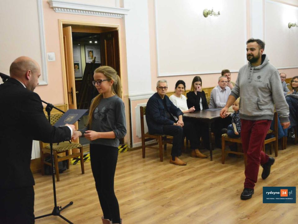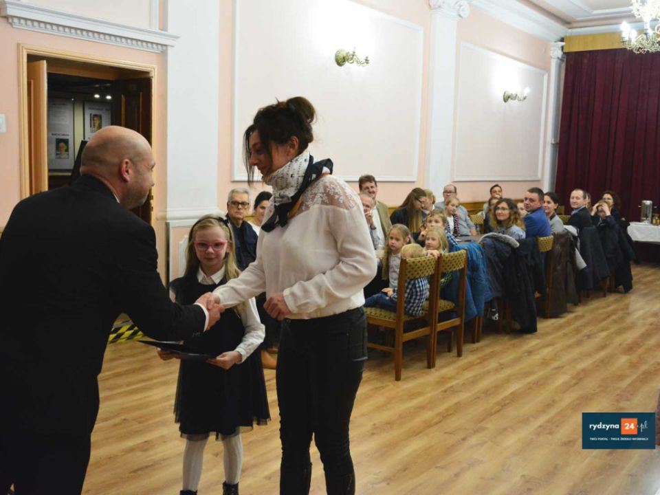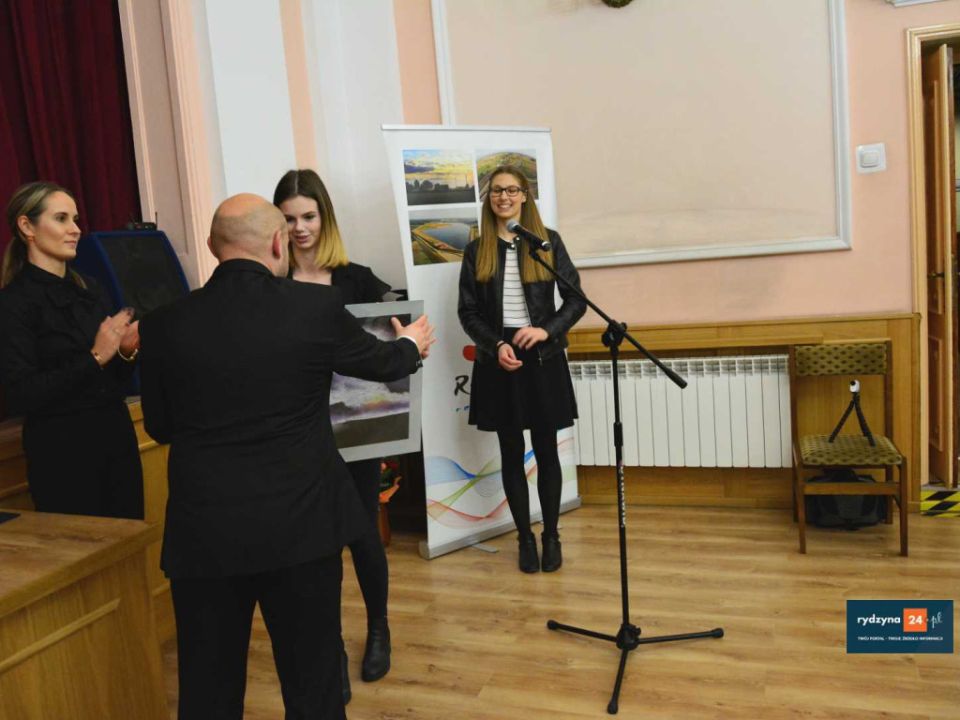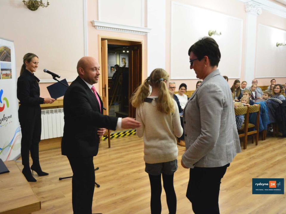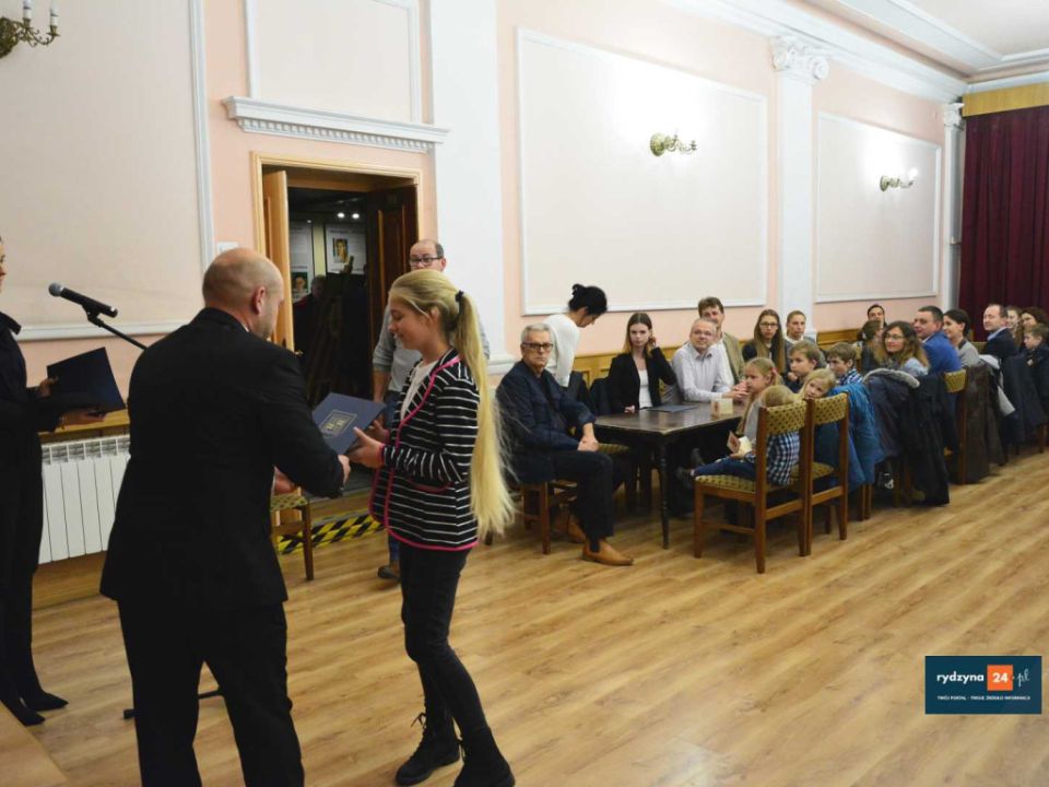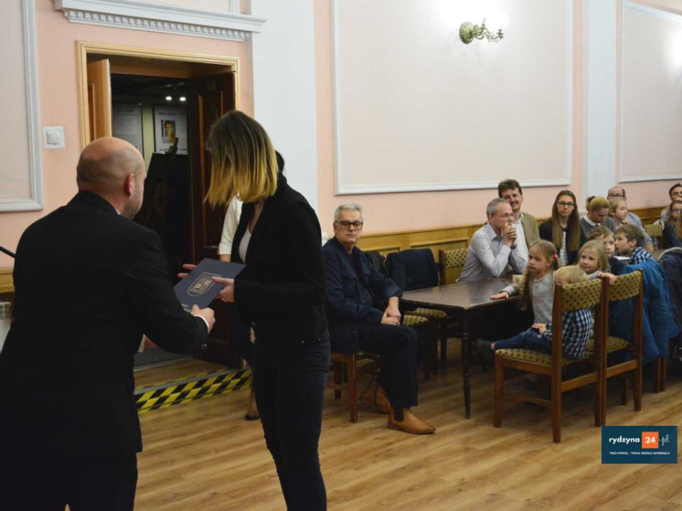 W sali Rydzyńskiego Ośrodka Kultury Burmistrz MiG Rydzyna wręczył podziękowania laureatom ogólnopolskich konkursów plastycznych.