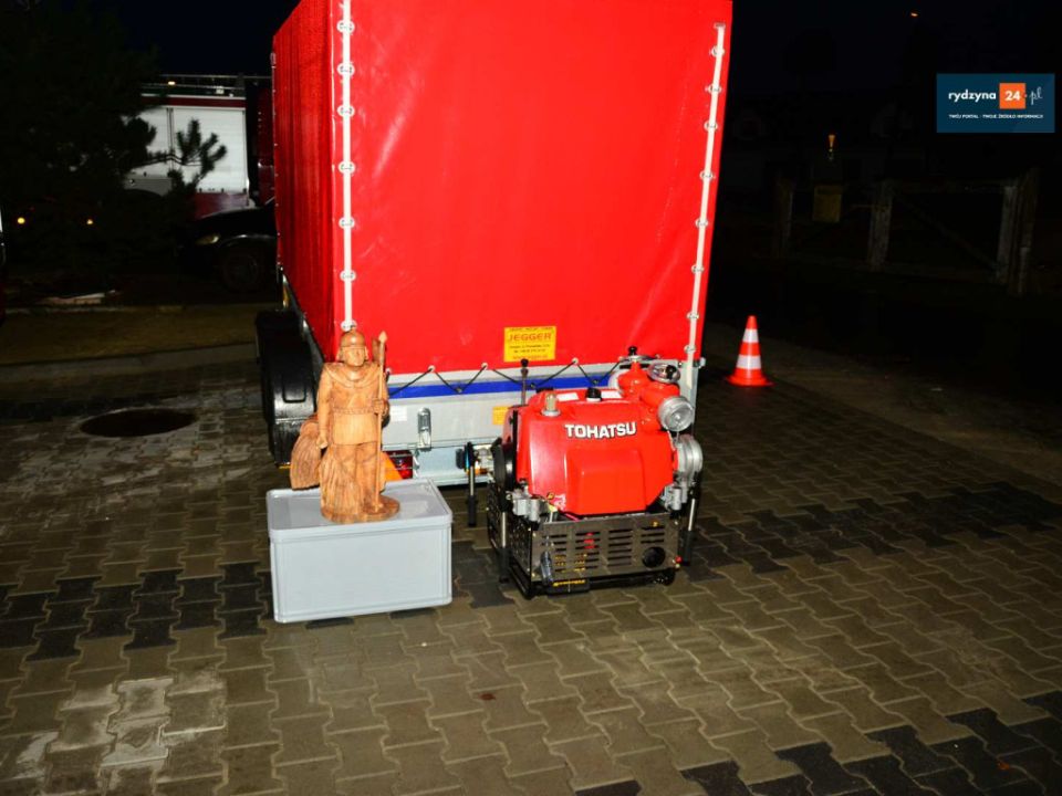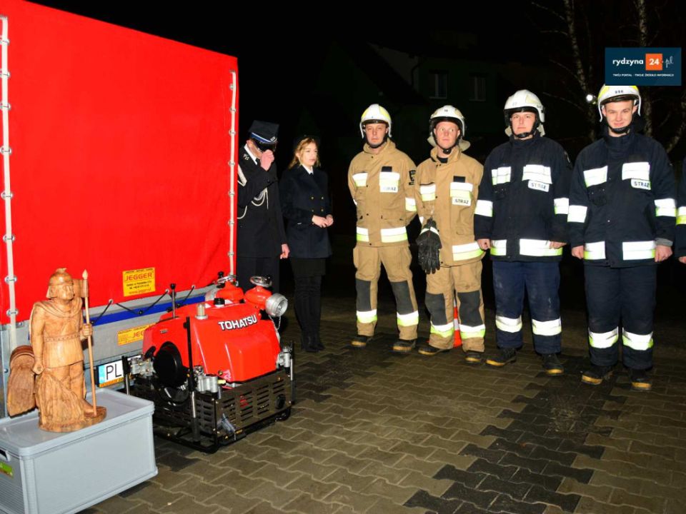 Dzięki wsparciu Gminy Rydzyna oraz Starostwa Powiatowego w Lesznie możliwe było również dokonanie zakupu przyczepy do transportu sprzętu oraz pompy pożarniczej M 16/8 marki Tohatsu. Łączna wartość sprzętu, który trafił do rąk rydzyńskich strażaków to kwota ok. 250 000 zł.