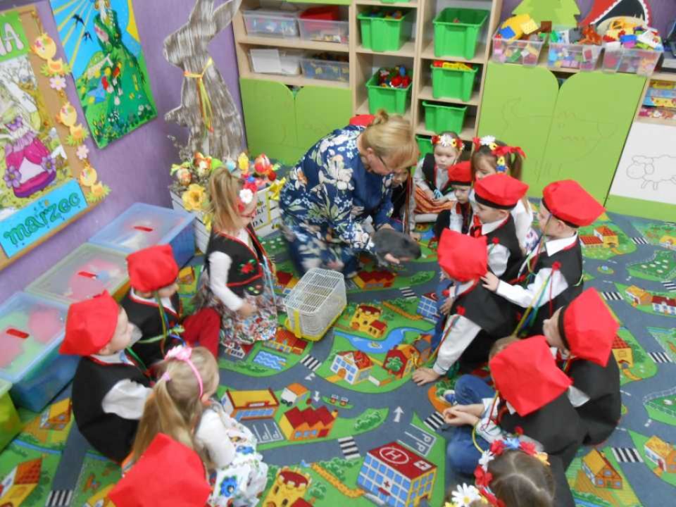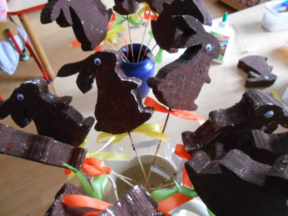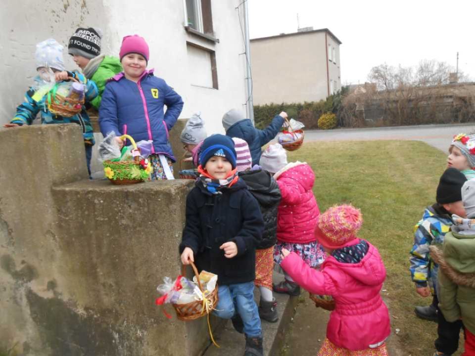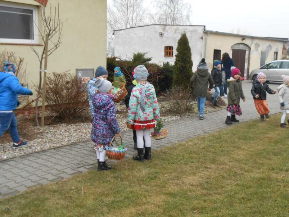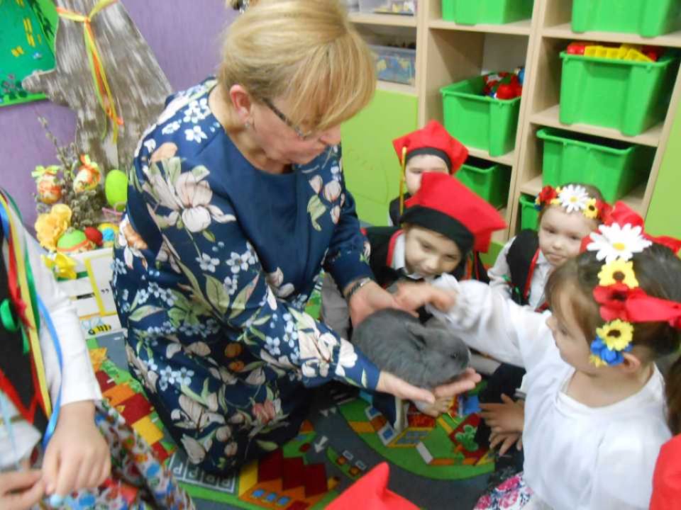 Każdego roku, tuż przed świętami wielkanocnymi nasze przedszkole odwiedza zajączek wielkanocny. Przychodzi, a raczej kica z prezentami dla dzieci i nie zostawia ich ot tak, po prostu. Dzieci śpiewają piosenki o zajączku, mówią wierszyki okolicznościowe, układają życzenia. Nie lada atrakcją był przyniesiony do przedszkola króliczek Zosi i Marysi J.- Szarek , a także malowanie farbami zajączków styropianowych od mamy Jasi, p. Gosi Sz. . W tym roku wszystkie dzieci martwiły się, czy zajączek dotrze na czas, bo pogoda nam nie sprzyjała. Jednak udało się! Było gwarno i wesoło. Do zobaczenie, zajączku! I dziękujemy za prezenty.