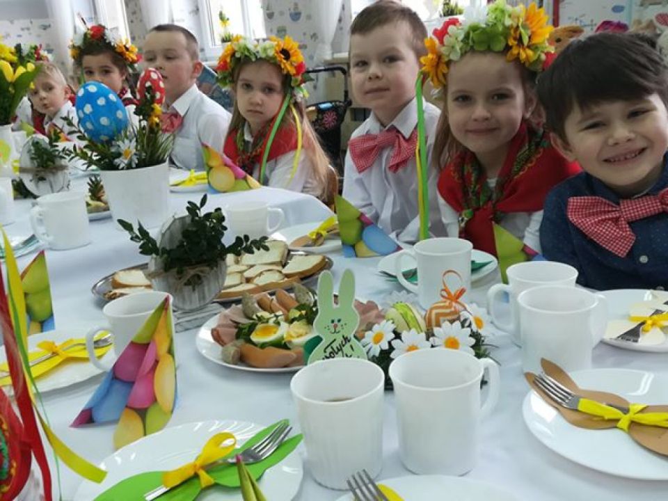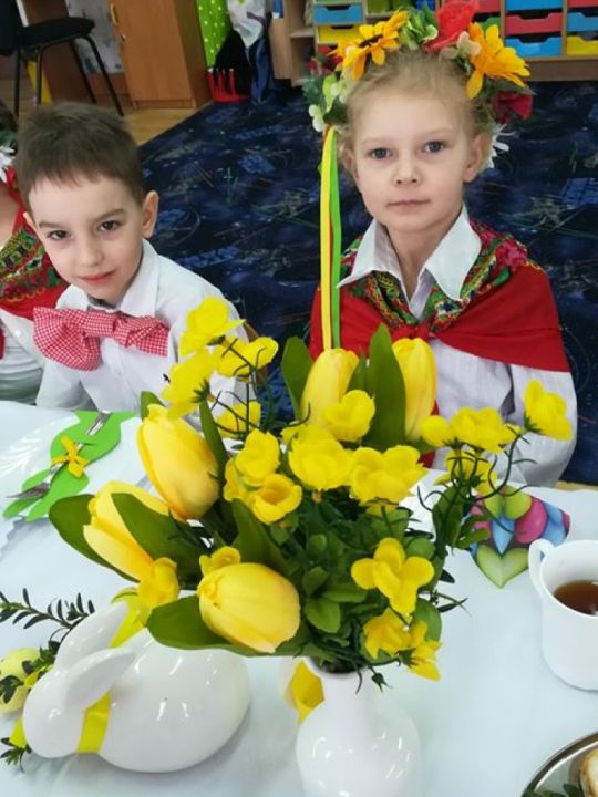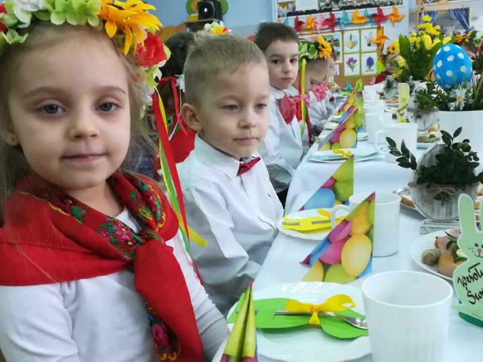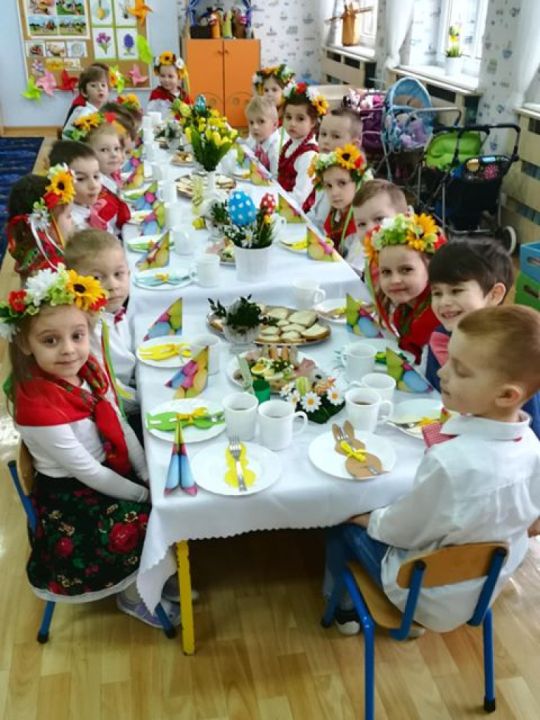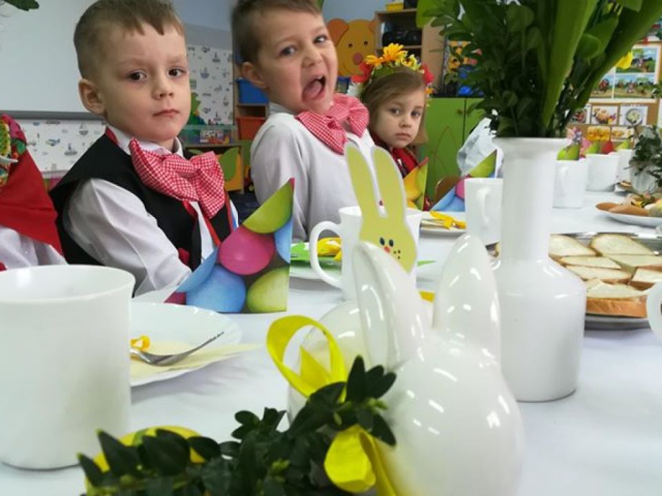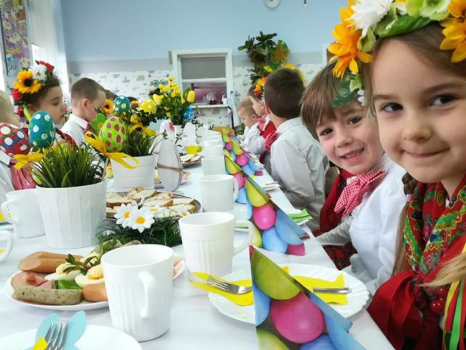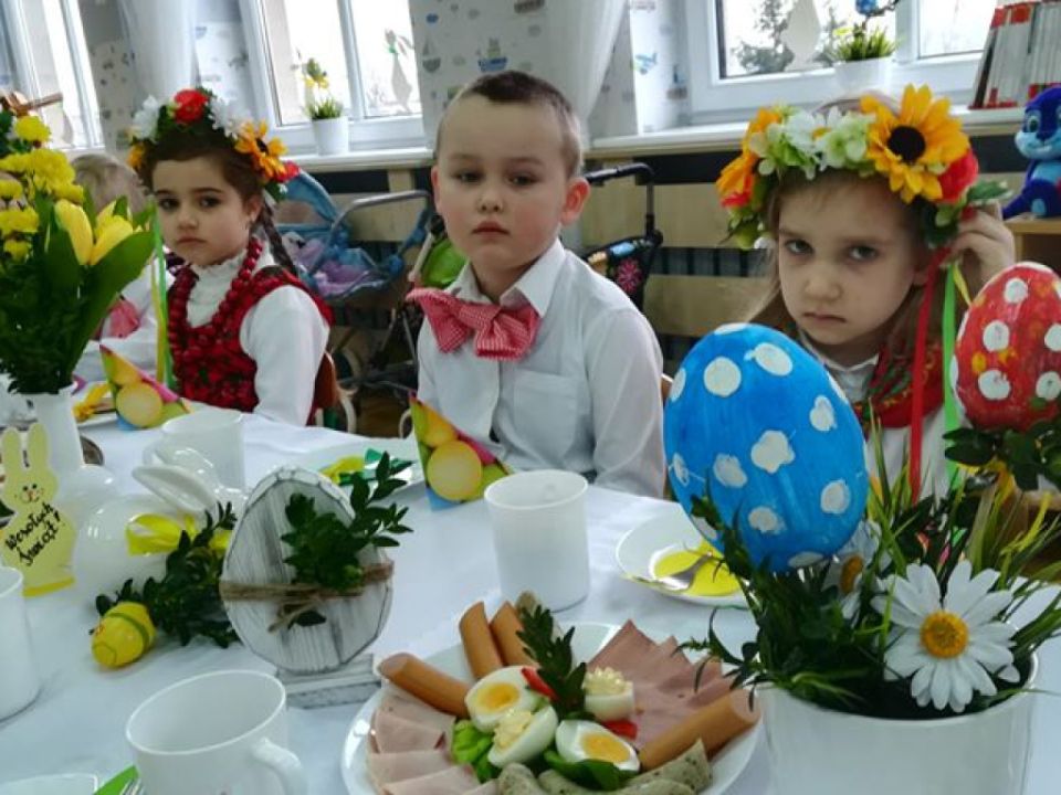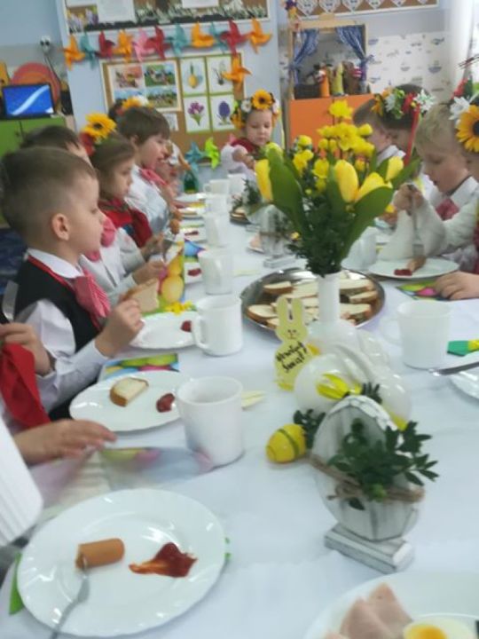 Święta wielkanocne sprzyjają poznawaniu tradycji. Przedszkolaki z grupy Sowy zasiadły do śniadanka w ludowych strojach. Spędziły czas przy dźwiękach wielkanocnych piosenek.