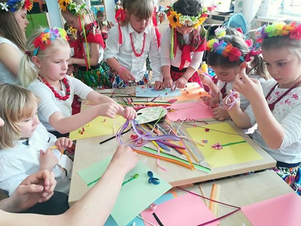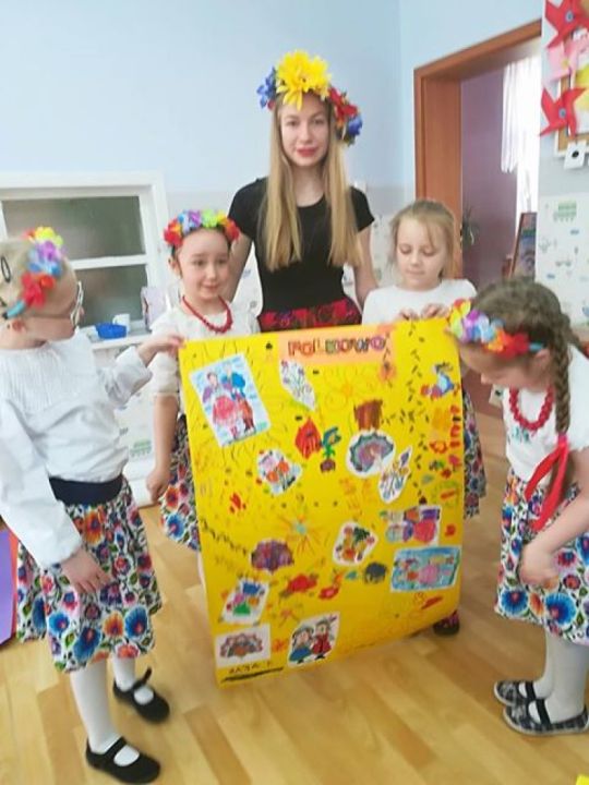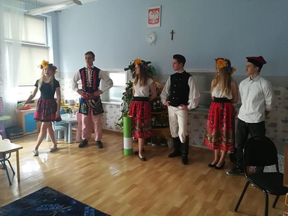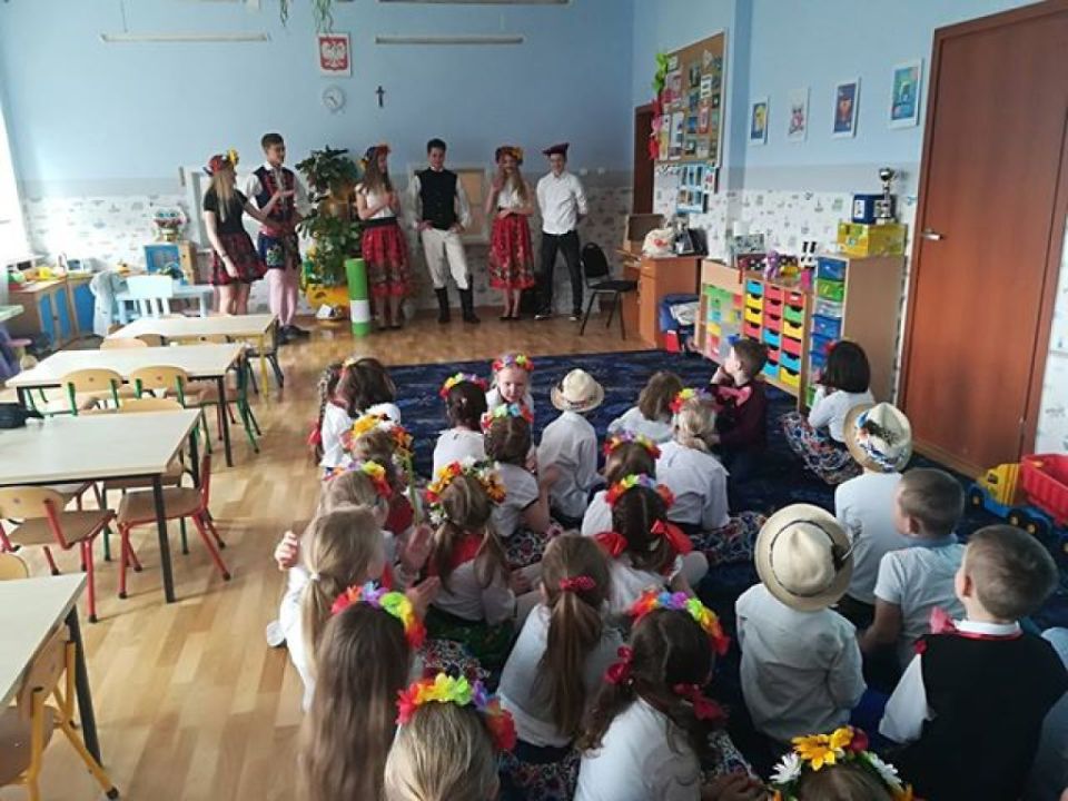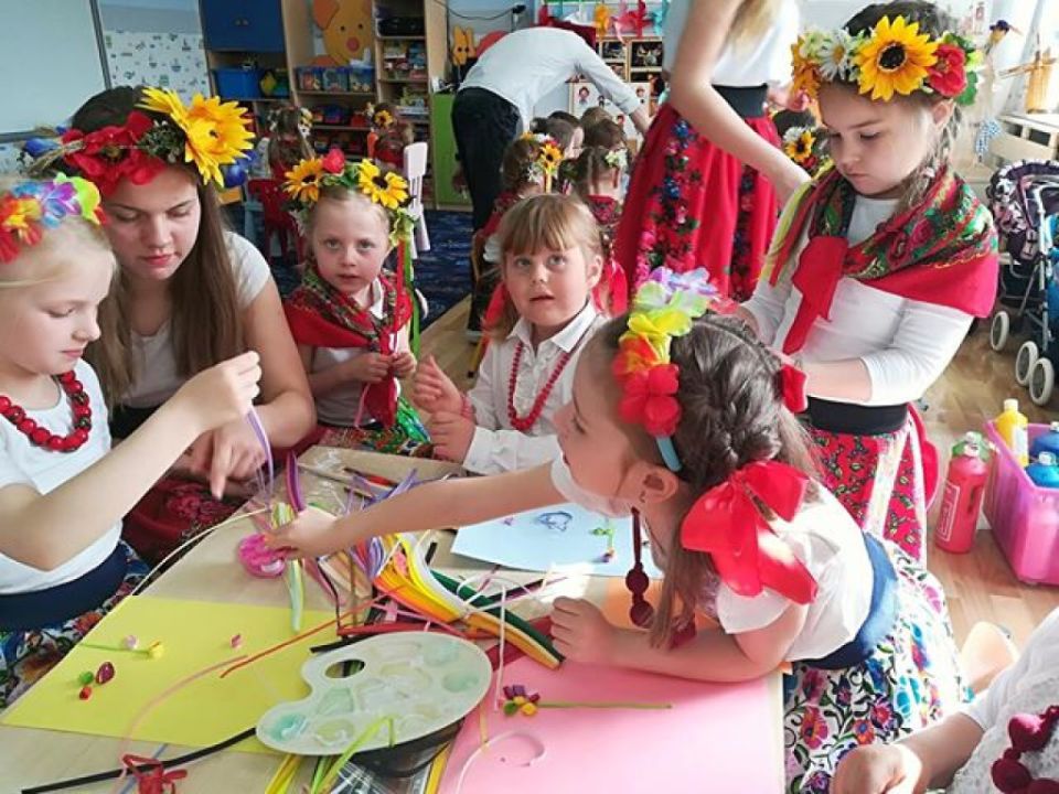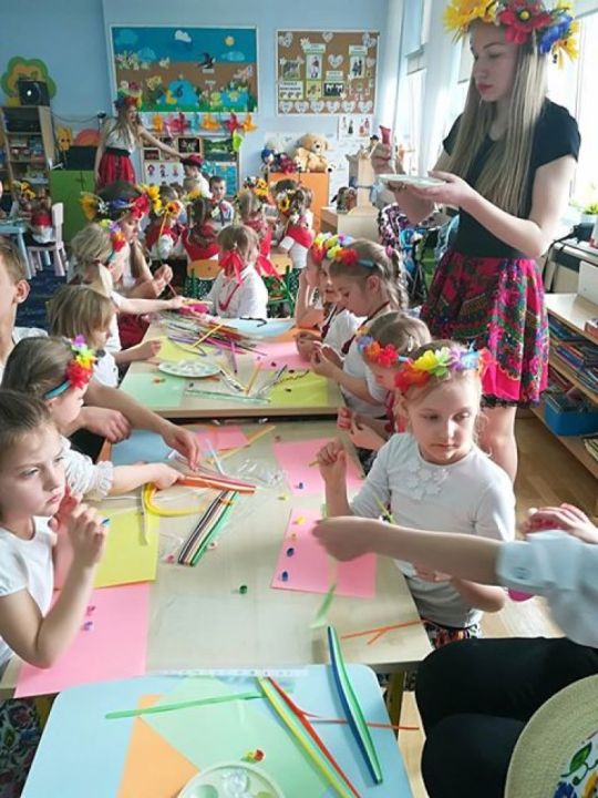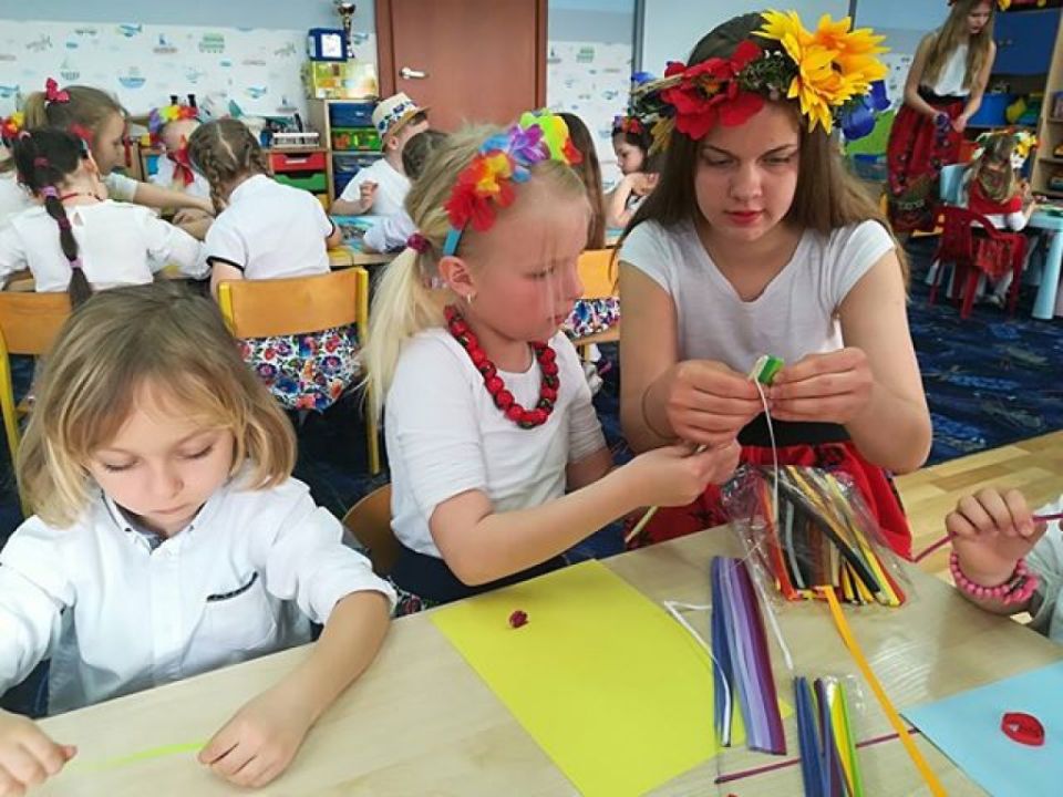 KARnet to projekt skupiający młodzież w sieci Klubów Aktywności Rozmaitych, współfinansowany ze środków Unii Europejskiej w ramach Europejskiego Funduszu Społecznego. Zadaniem klubu jest rozwijanie pasji i zainteresowań młodzieży. Działania w klubie to jedna z ciekawszych i efektywniejszych form edukacji nieformalnej, która nie narzuca sztywnych ram procesu edukacji, jest zorientowana na potrzeby młodzieży, jest dostosowana do indywidualnych preferencji i oparta na metodzie peerlearning, czyli uczenia się rówieśniczego. Młodzież z Rydzyny od kilku już lat, w ramach wolontariatu współpracuje z nauczycielką Beatą Musielak, organizując dla przedszkolaków różnorodne warsztaty, zabawy, zajęcia edukacyjne, pomaga przy organizacji festynów i innych imprez. Tym razem dzięki współpracy KARnetu Rydzyna i Wolontariatu „Zwiastuny” zaprzyjaźniona z przedszkolem młodzież zrealizowała z dziećmi kolejny projekt „Spotkanie z folklorem”. Uczniowie przygotowali wspólnie piękną i ciekawą prezentację, która zawierała krótkie omówienie naszych wielkopolskich tradycji, gwary, obrzędów, zabytków. Dzieci utrwaliły wiadomości na temat potraw wielkopolskich /pyry z gzikiem, plyndze, szagówki, ślepe ryby, kluchy na łachu, rogale Marcińskie…itp./. Utrwaliły również wiadomości na temat koziołków poznańskich i innych wielkopolskich atrakcji, poznały również dalsze tradycje, np. wysłuchały hejnału granego z wieży Mariackiej w Krakowie. Następnie przedszkolacy obejrzeli zatańczony przez Maksymiliana i Alicję taniec ludowy i wszyscy wspólnie zatańczyli w wielkim kole belgijkę, uważnie słuchając instrukcji dotyczących kroków. Ostatnia część warsztatów to działania artystyczne. Dzieci zostały podzielone na zespoły i wykonywały prace z uwzględnieniem stopnia stopnia trudności. Dzieci starsze z gr. Delfinki karbowały paski papieru układając ludowe wzory i tworzyły plakaty o folklorze, młodsze dzieci z gr. Sowy malowały ludowe wzory na szklanych talerzykach i stroje ludowe. Po zakończonej pracy wszyscy zasłużyli na nagrody. Były zakładki, podstawki pod kubek oraz piękne linijki. Wspólne zdjęcie uwieńczyło przepiękne i niezwykle twórcze zajęcia. Dziękujemy serdecznie uczniom klasy III – Alicji Siecla, Danieli John, Maksymilianowi Paszek, Wiktorowi Banaszak i Zofii Bańkowiak. Następny projekt już wkrótce /opiszemy na pewno!!!