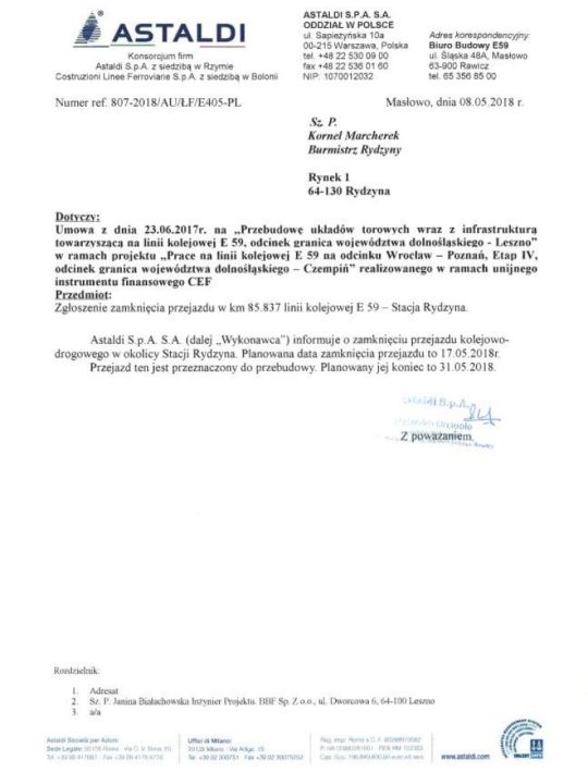 Firma Astaldi wykonująca przebudowę linii kolejowej informuje o zamknięciu przejazdu kolejowo-drogowego w okolicy stacji Rydzyna.