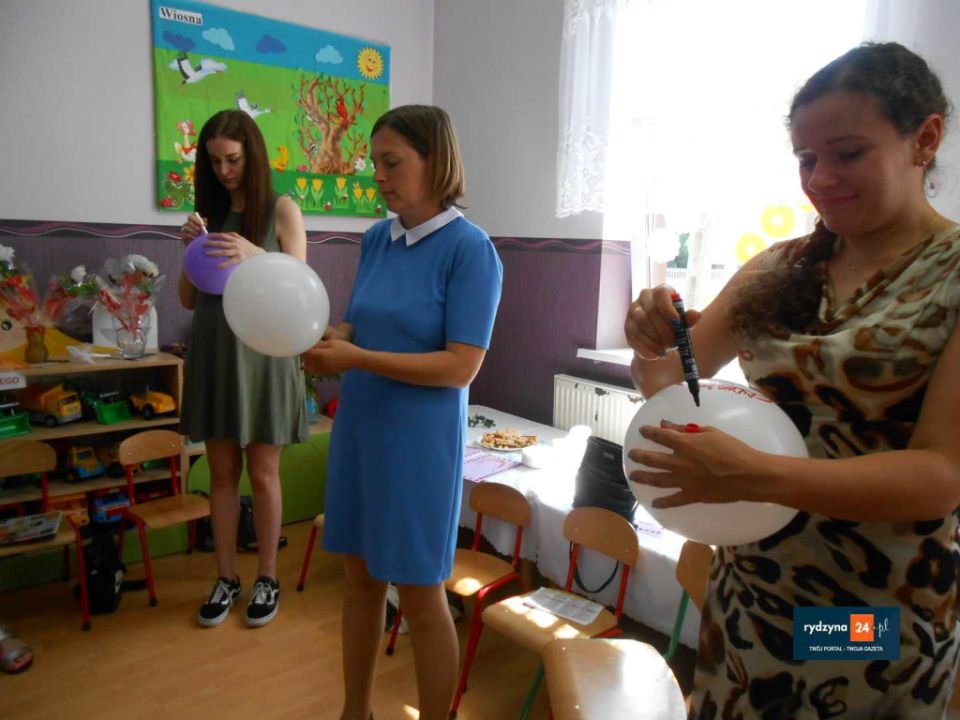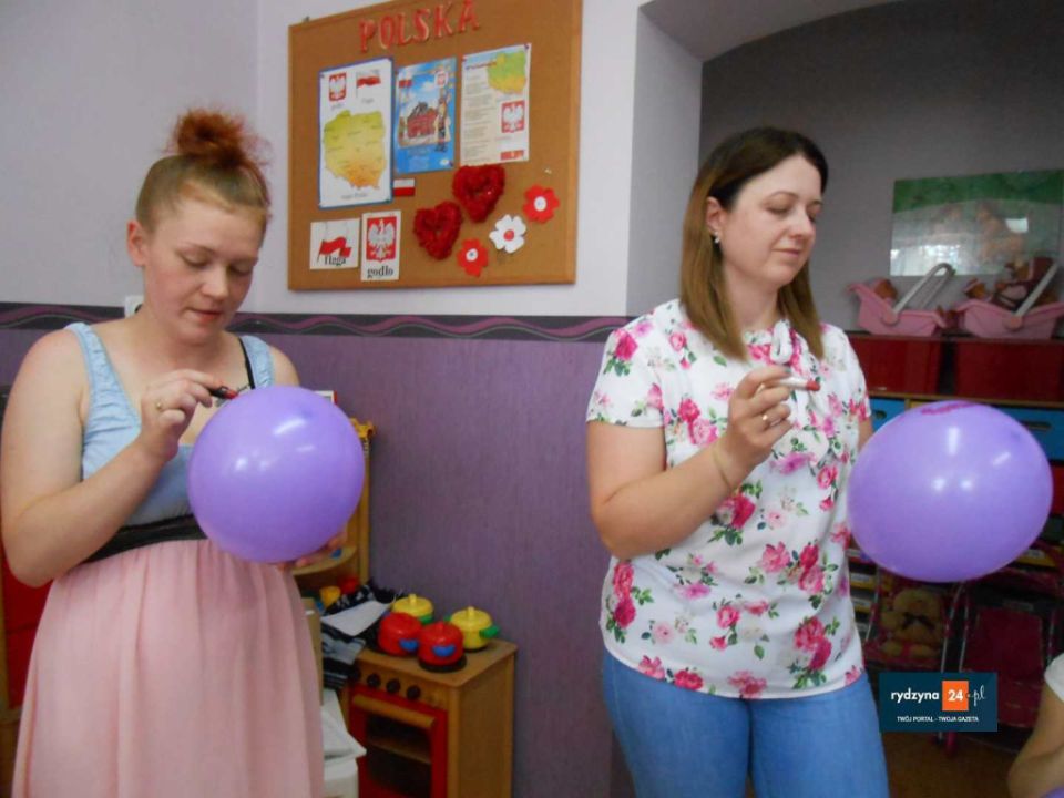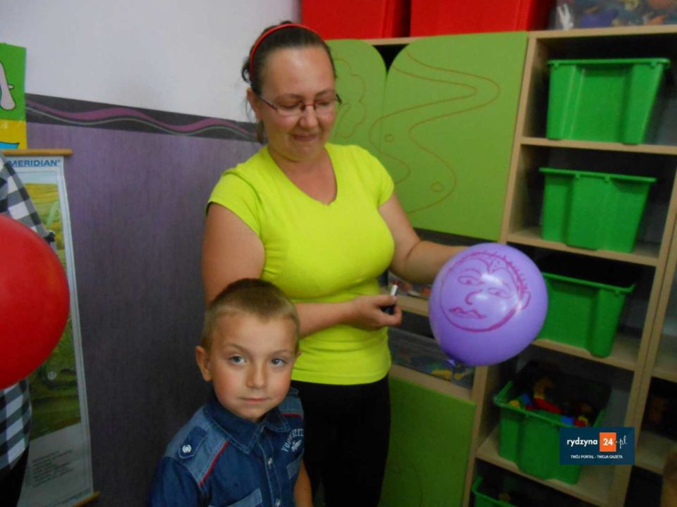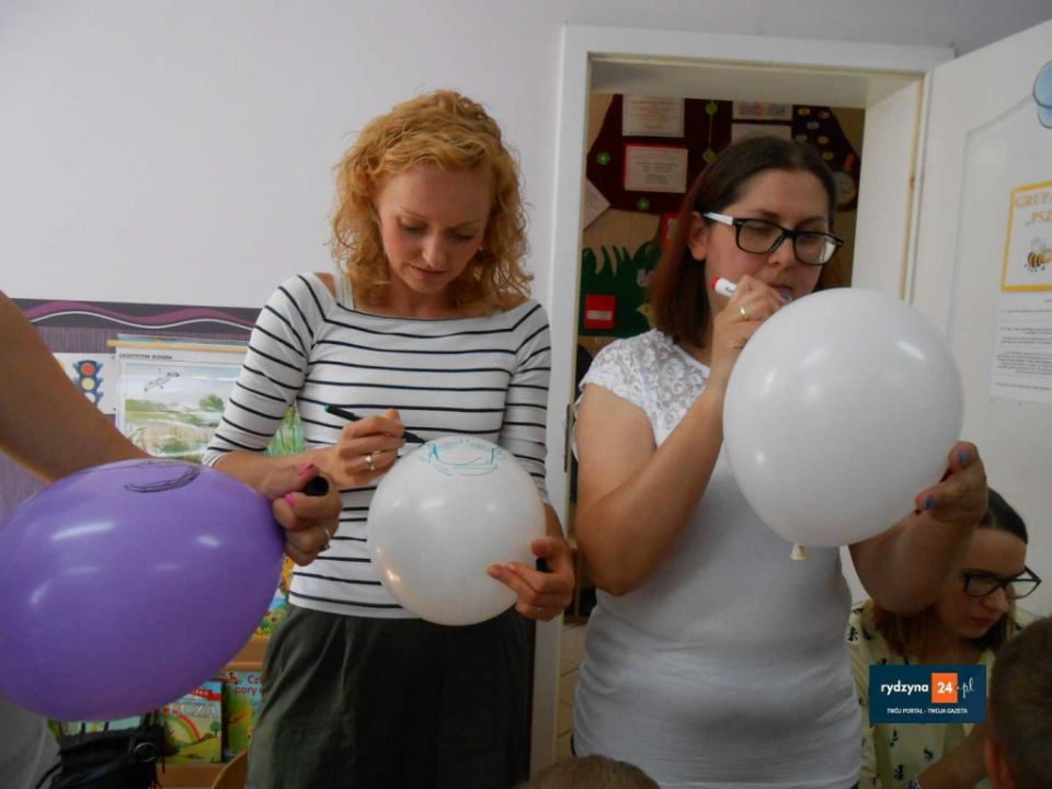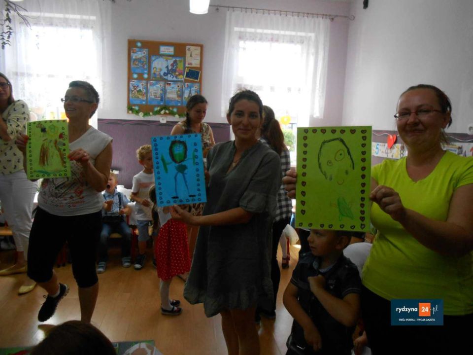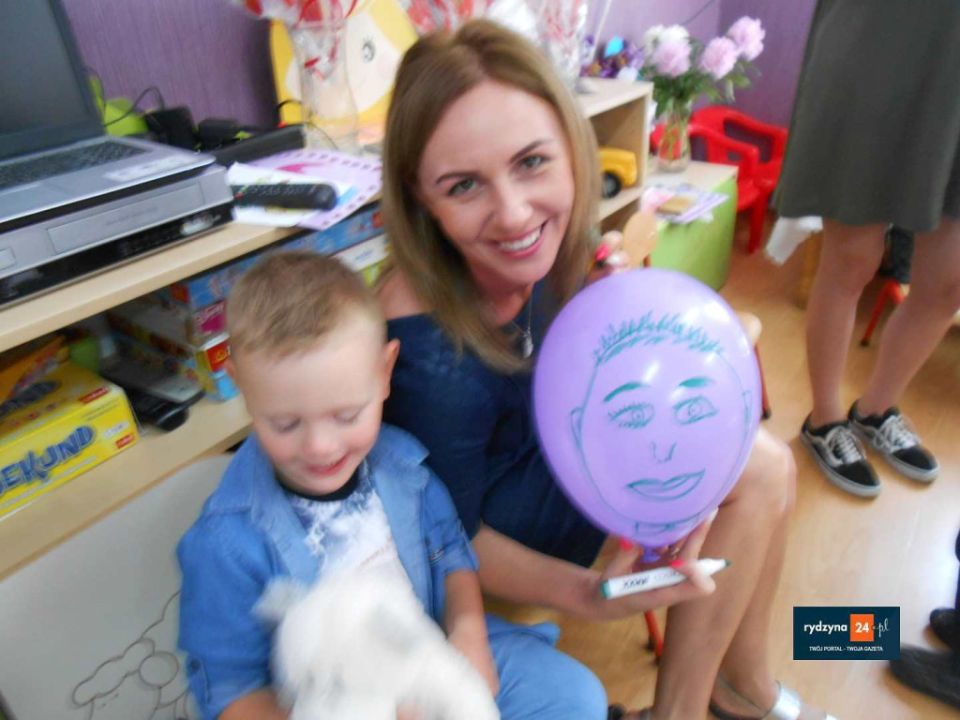 Na zakończenie wszyscy uczestnicy bawili się wesoło przy piosenkach Zuch, Ciułała , Krasnoludek, który szedł wąską ścieżką i wykonywał przy tym bardzo śmieszne ruchy. Na koniec to mamy rysowały na balonie portret swojego dziecka. Spotkanie przy kawie i ciastku  pokazało, że zabawa integruje ludzi w każdym wieku i sprzyja budowaniu pozytywnych emocji, które na pewno na długą zapadną w pamięci przedszkolaków oraz ich rodziców.