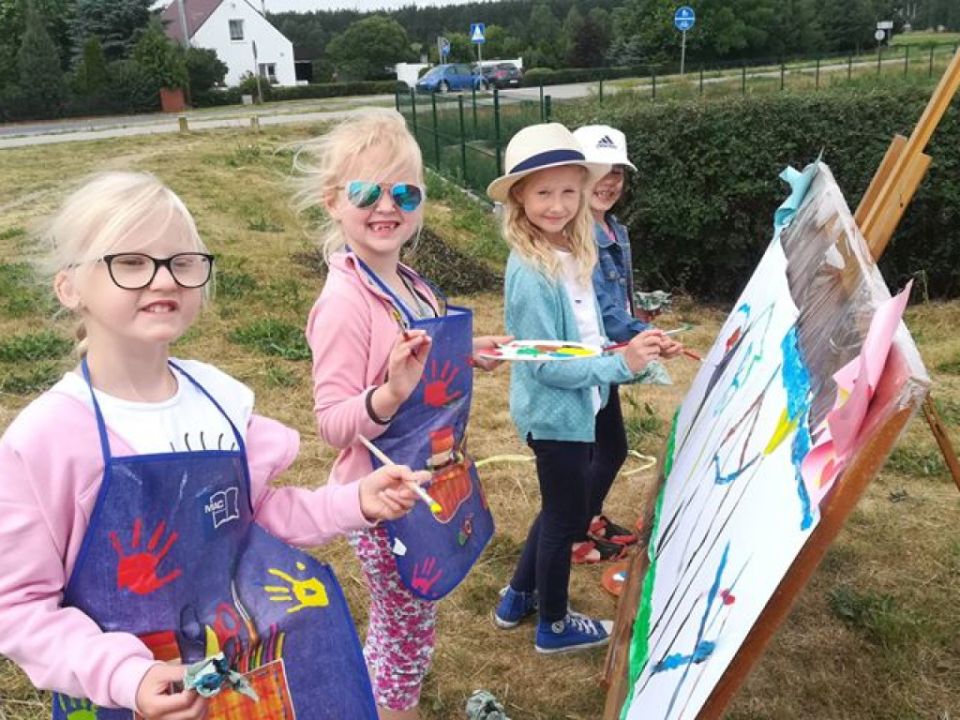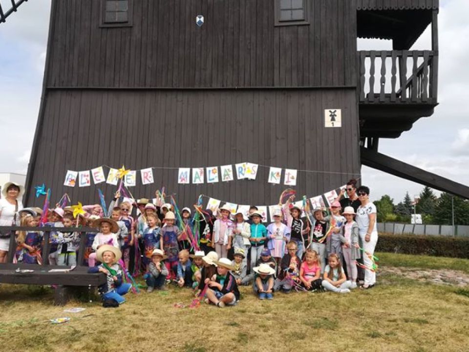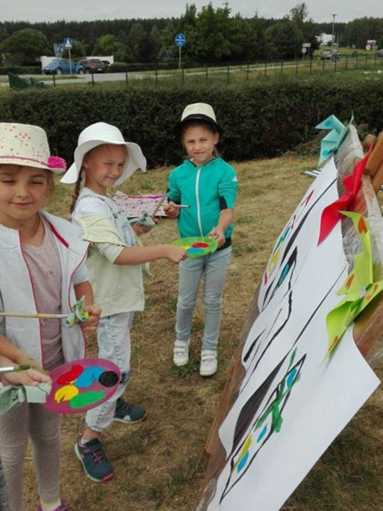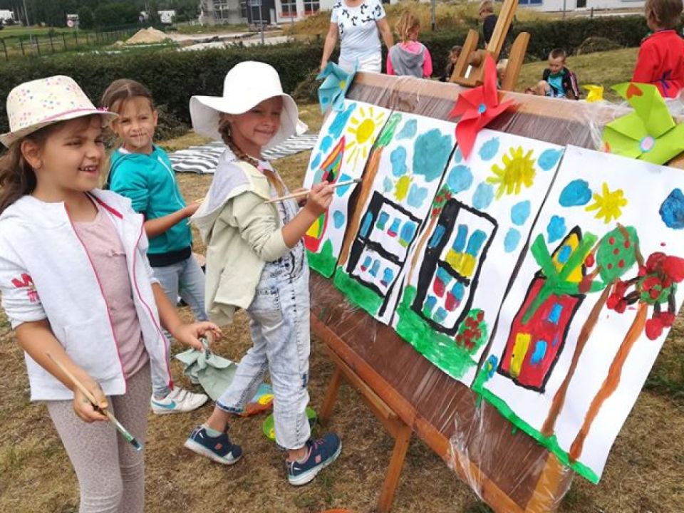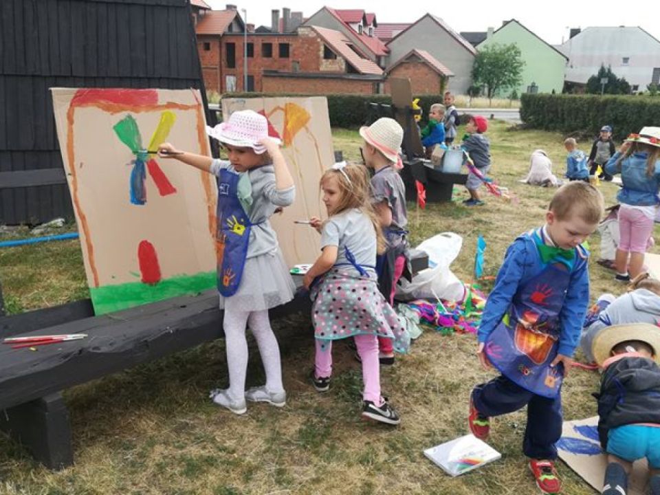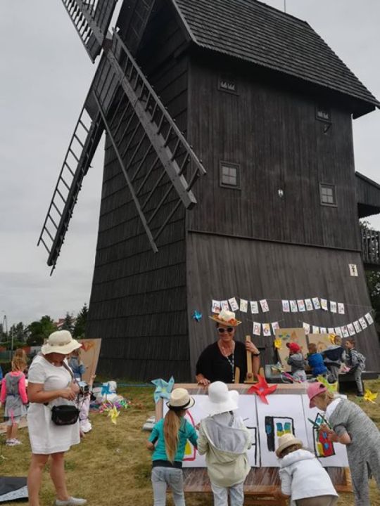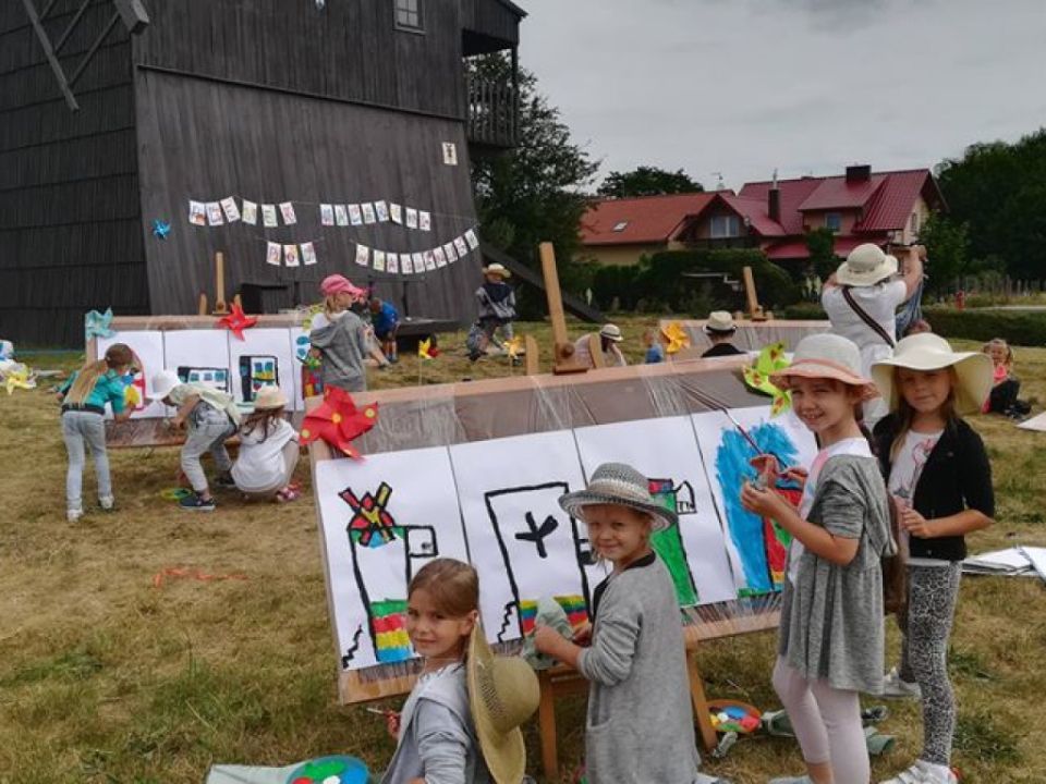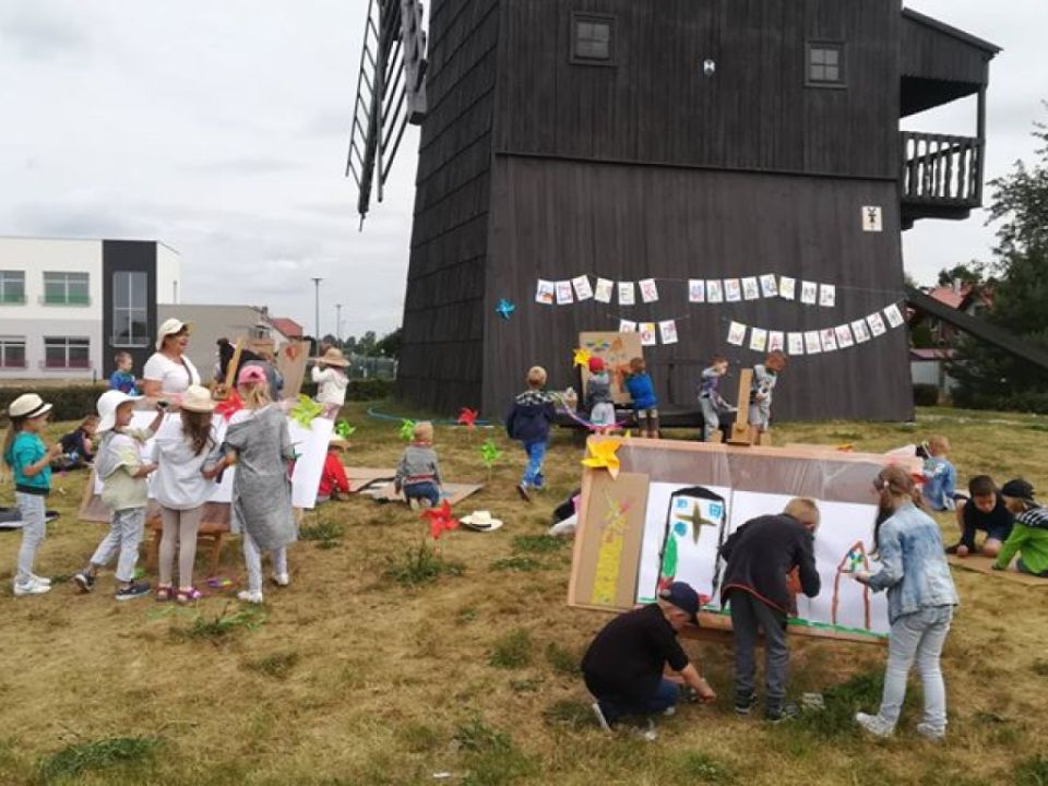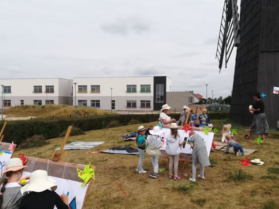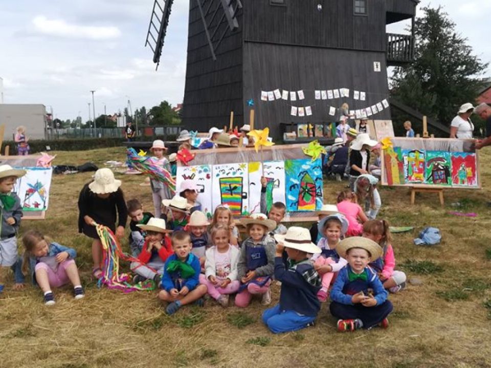 Dzieci wcieliły się w prawdziwych artystów, a na powietrzu i to pod tak pięknym, zabytkowym obiektem jakim jest nasz wiatrak Józef były bardzo szczęśliwe, bo obiekt do malowania stał wprost przed nimi, a pogoda sprzyjała jak nigdy, słoneczko nie za bardzo prażyło, a wiatr owiewał zadowolone buźki. Obok wiatraka stoi też nasz nowy budynek, który również został uwieczniony na niektórych pracach.