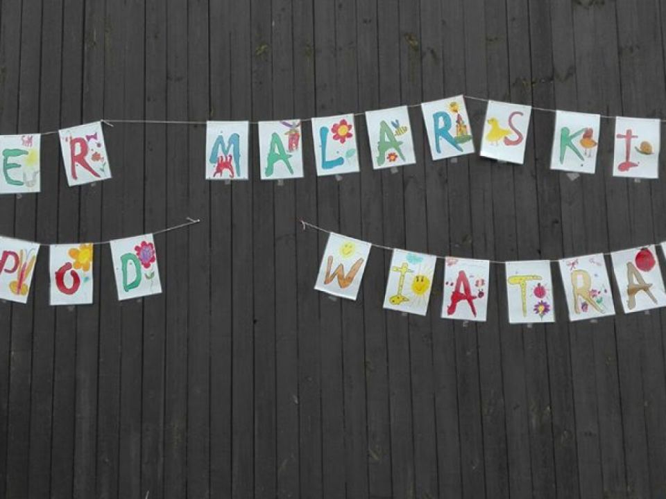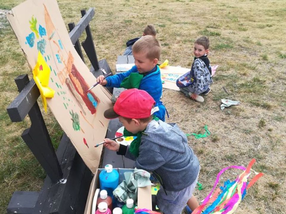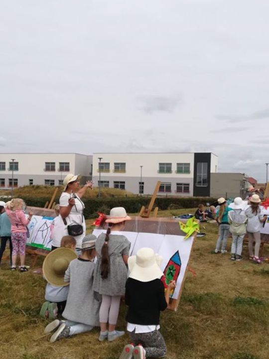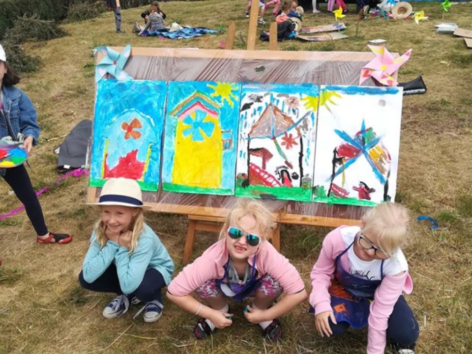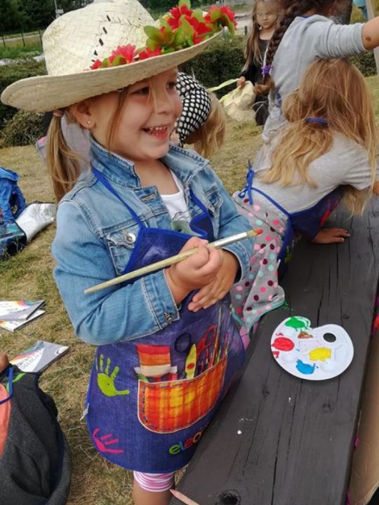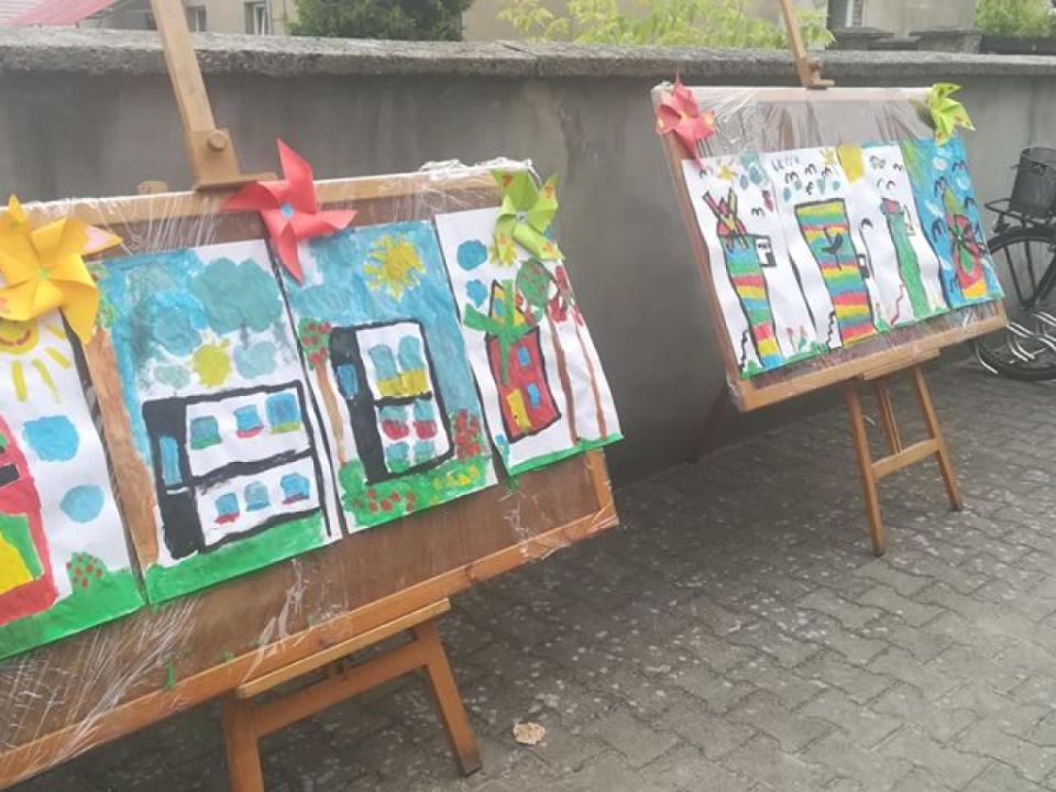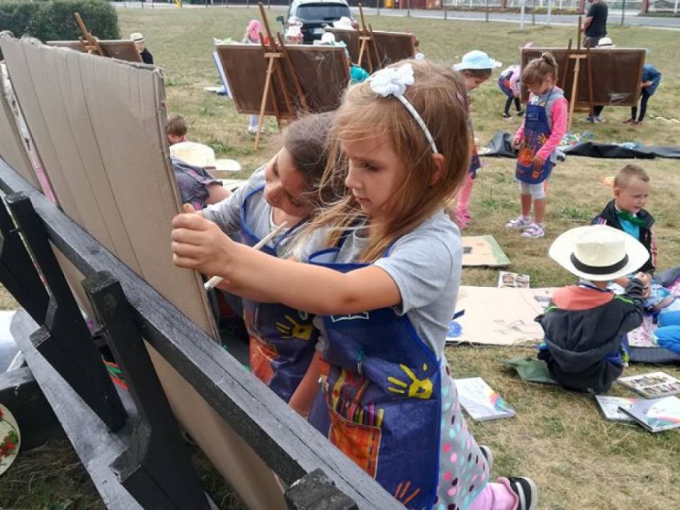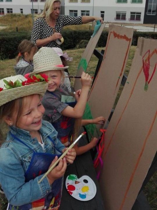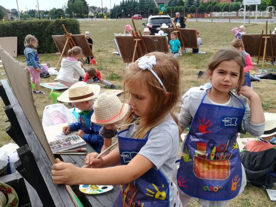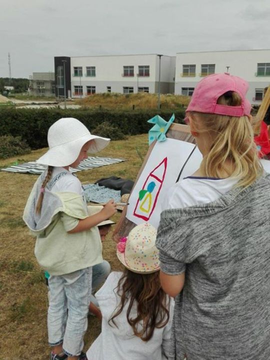 Dzieci wcieliły się w prawdziwych artystów, a na powietrzu i to pod tak pięknym, zabytkowym obiektem jakim jest nasz wiatrak Józef były bardzo szczęśliwe, bo obiekt do malowania stał wprost przed nimi, a pogoda sprzyjała jak nigdy, słoneczko nie za bardzo prażyło, a wiatr owiewał zadowolone buźki. Obok wiatraka stoi też nasz nowy budynek, który również został uwieczniony na niektórych pracach.