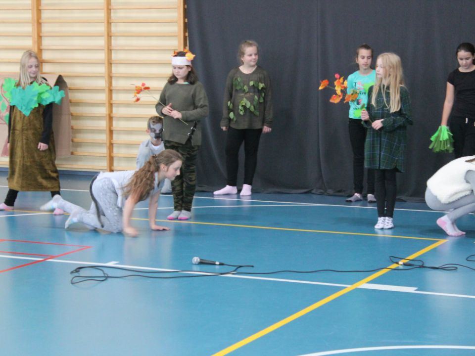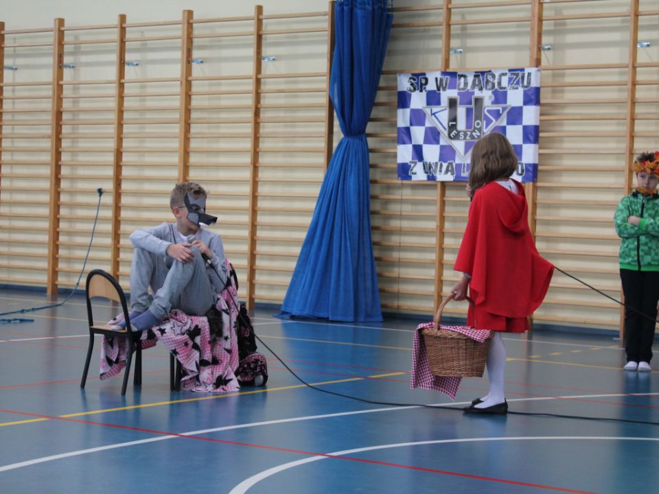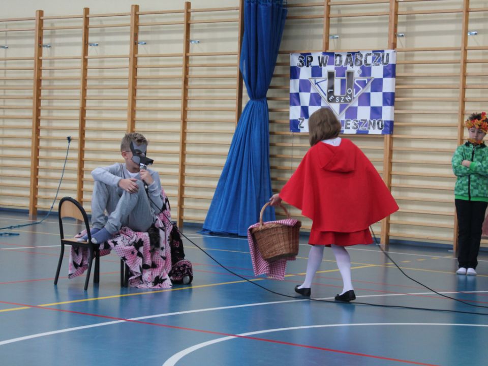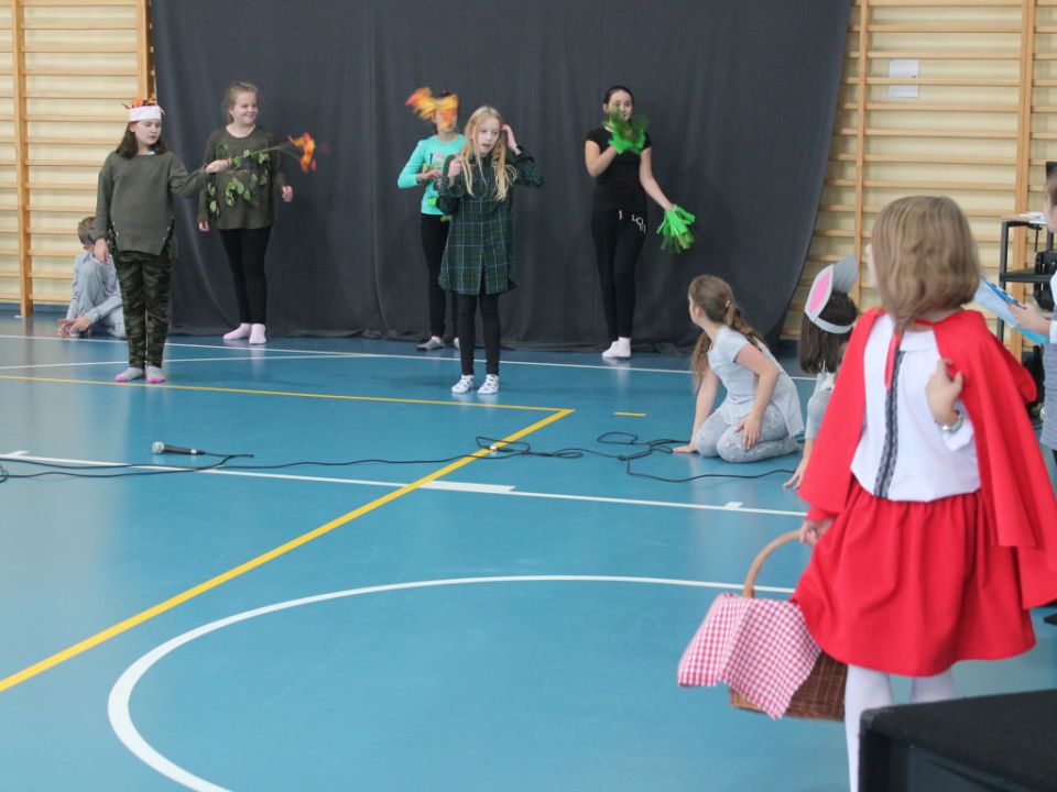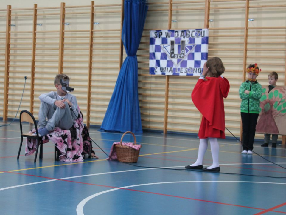 Przedstawienie odbyło się na czwartej godzinie lekcyjnej. Czwartoklasiści wcześniej przygotowali staranne zaproszenia dla uczniów klas I-IV wraz z nauczycielami. Gdy goście pojawili się na sali gimnastycznej, rozpoczął się występ. Cała klasa zaangażowała się, a odtwórcy głównych ról: Czerwony Kapturek (Julia Matysiak) i Wilk (Maciej Kajzer) poradzili sobie bez zarzutu.