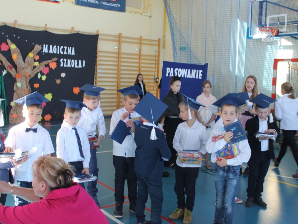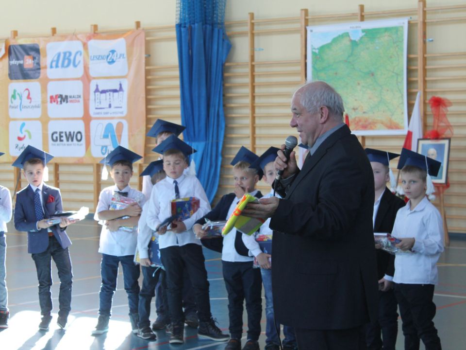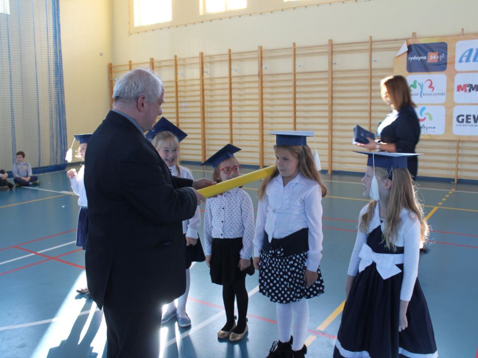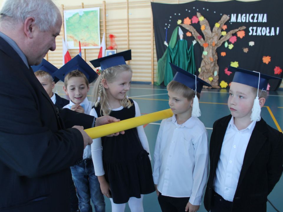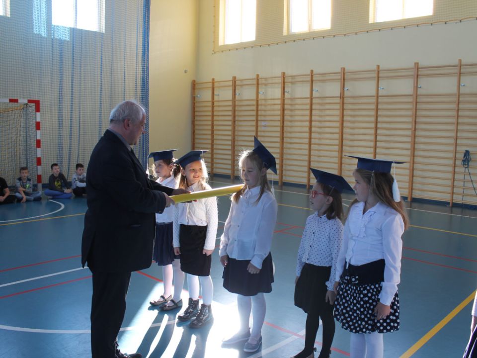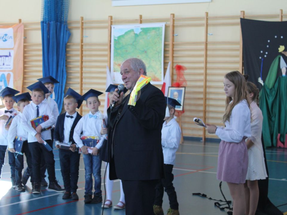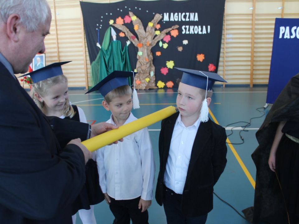 Po programie artystycznym Dyrektor Szkoły Wojciech Jędrzejczak uroczyście pasował uczniów. Dzieci otrzymały również pamiątkowe dyplomy. Na zakończenie Burmistrz Kornel Malcherek podarował dzieciom słodkie upominki.