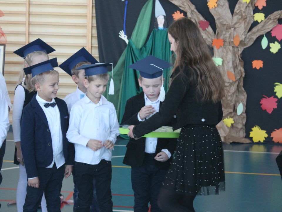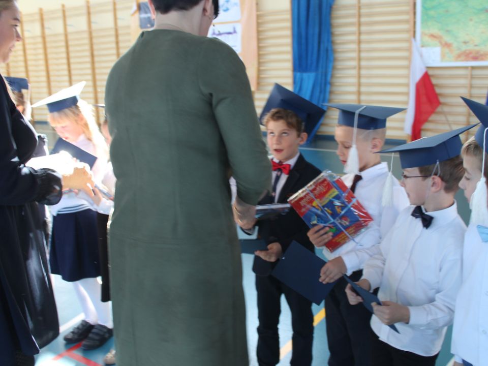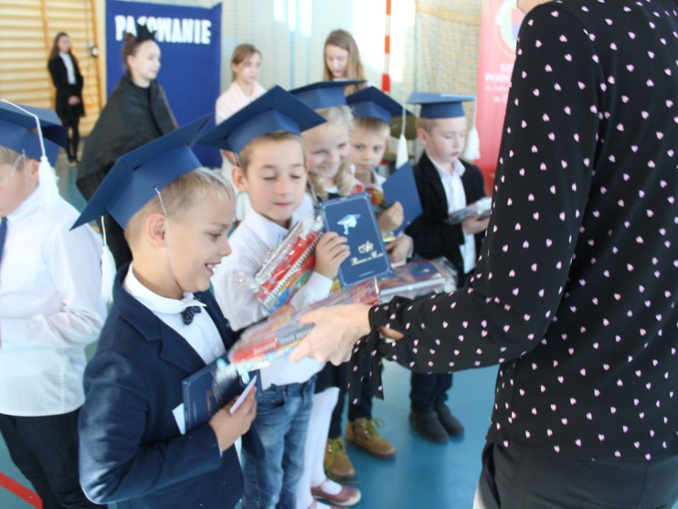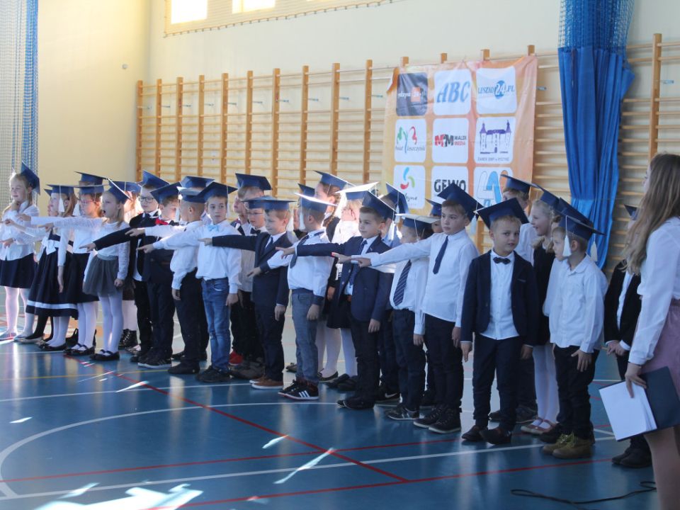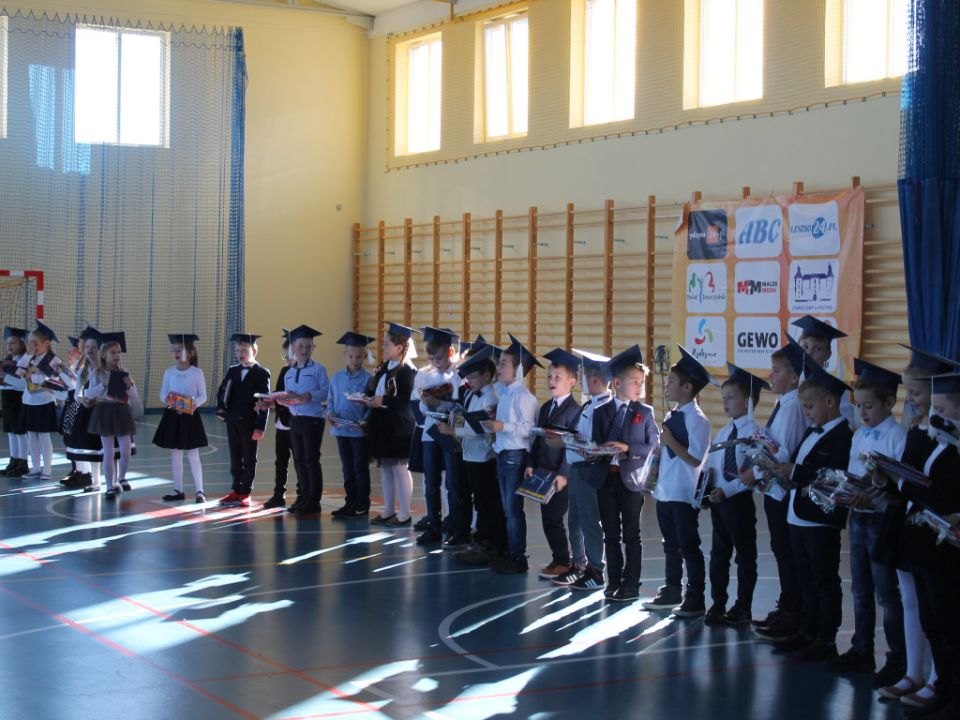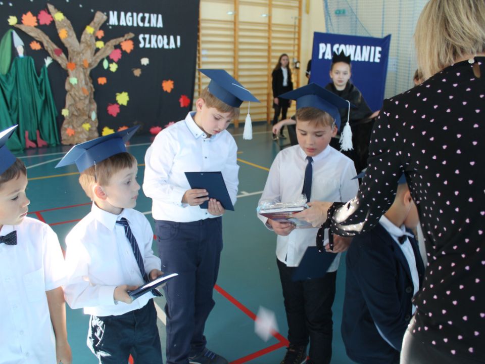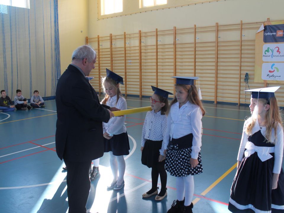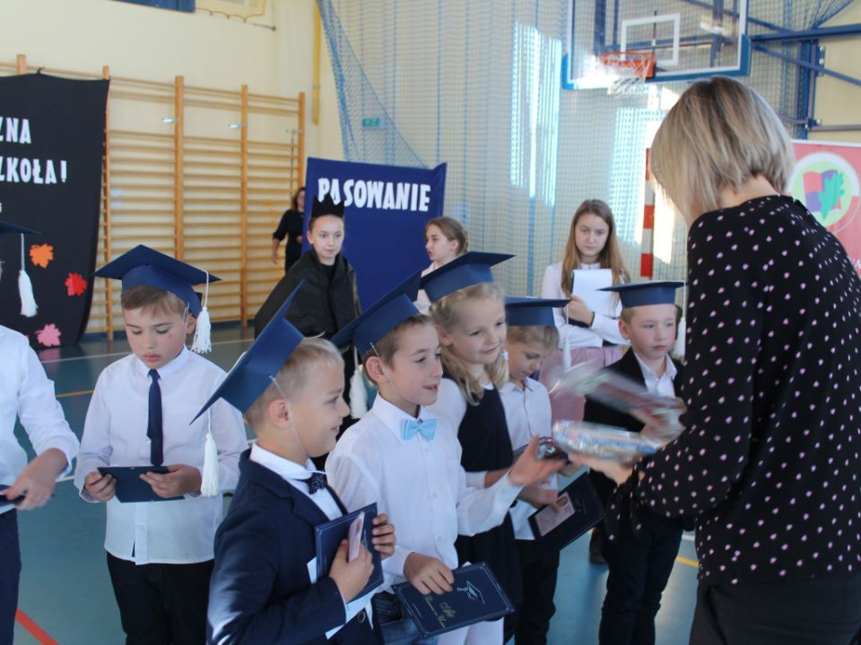 Po programie artystycznym Dyrektor Szkoły Wojciech Jędrzejczak uroczyście pasował uczniów. Dzieci otrzymały również pamiątkowe dyplomy. Na zakończenie Burmistrz Kornel Malcherek podarował dzieciom słodkie upominki.