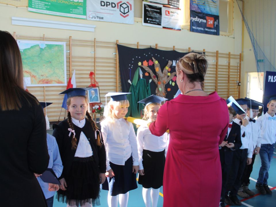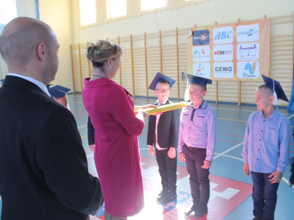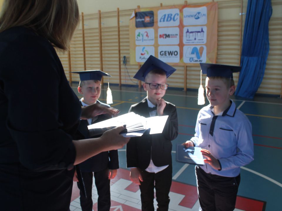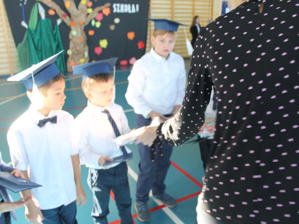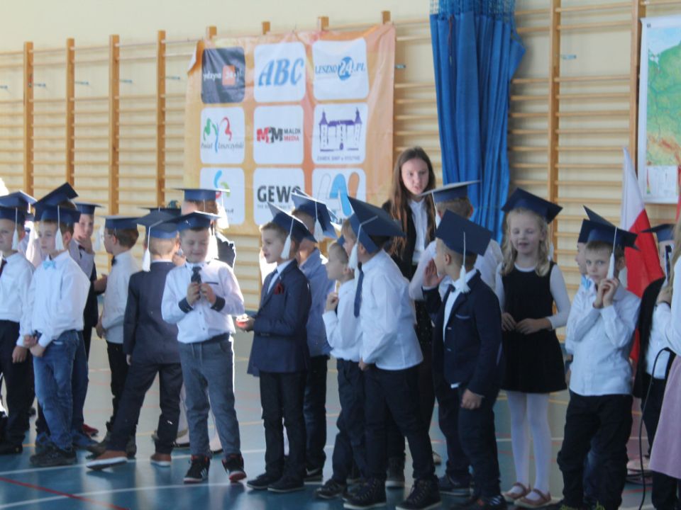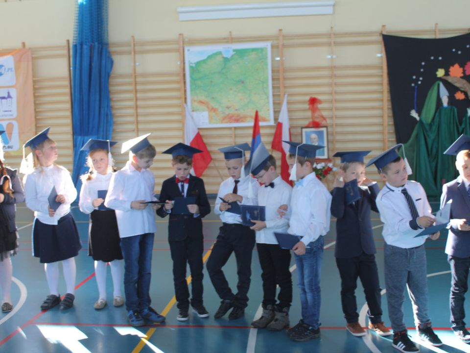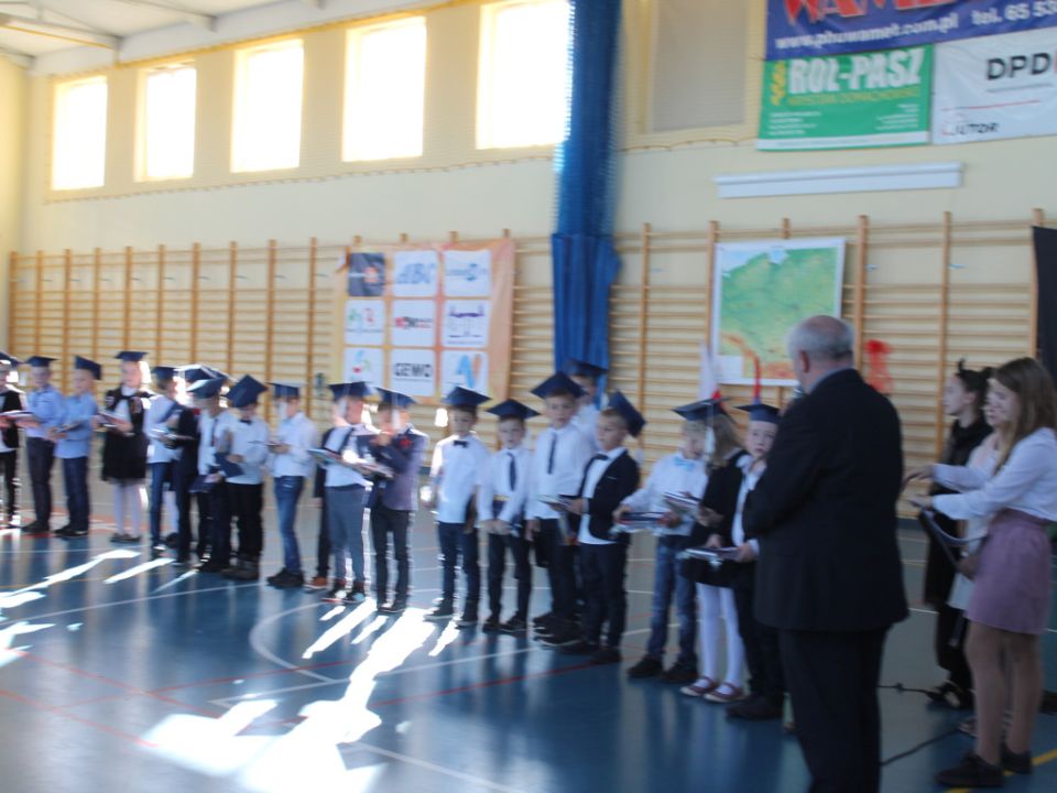 Po programie artystycznym Dyrektor Szkoły Wojciech Jędrzejczak uroczyście pasował uczniów. Dzieci otrzymały również pamiątkowe dyplomy. Na zakończenie Burmistrz Kornel Malcherek podarował dzieciom słodkie upominki.
