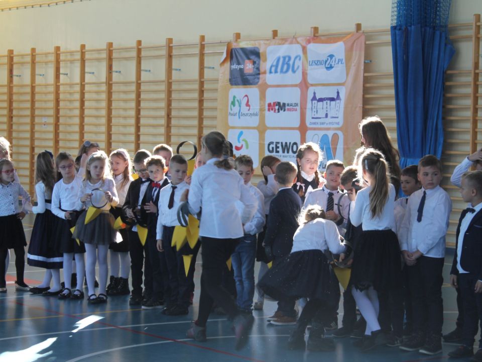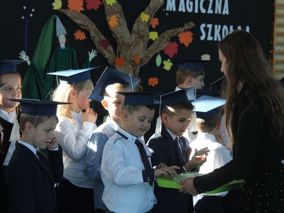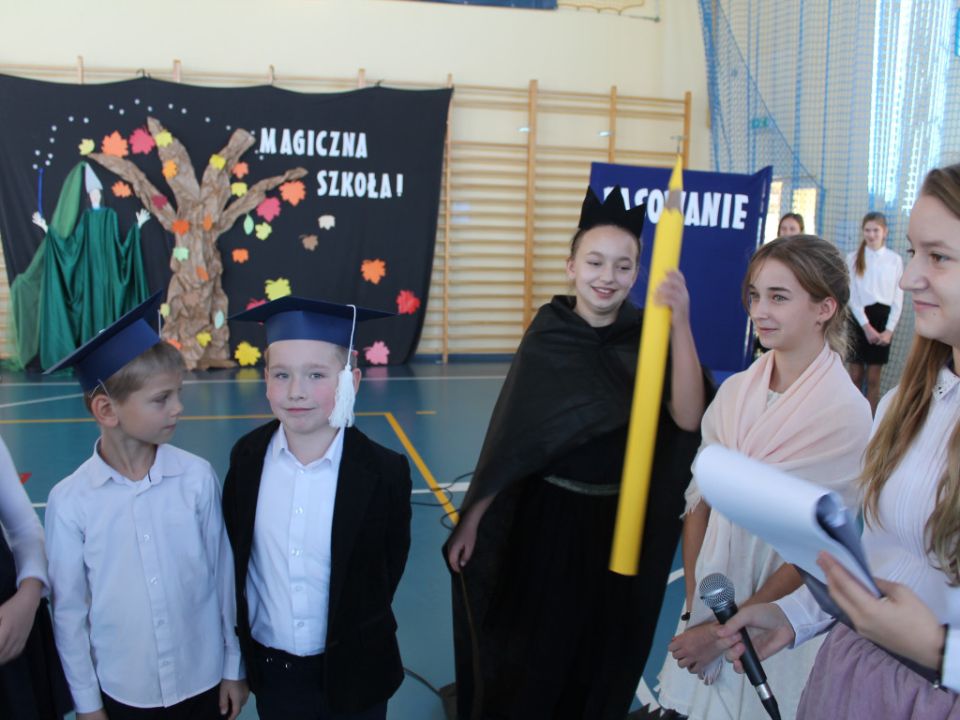 Część artystyczną, pt. „Magiczna szkoła” przygotowały wychowawczynie klas I – panie Katarzyna Sikorska oraz Joanna Jędraszyk. Pierwszaki śpiewająco weszli na scenę, gdzie czekały na nich wyzwania. Starsze koleżanki z klasy VI wcieliły się w prowadzącą i wróżki, a ich pomocnikami były uczennice klasy III. Dzieci stały się żółtodziobami i musiały wykonać zadania, udowadniające, że nadają się na uczniów szkoły podstawowej. Jak się okazało, poszło im doskonale.