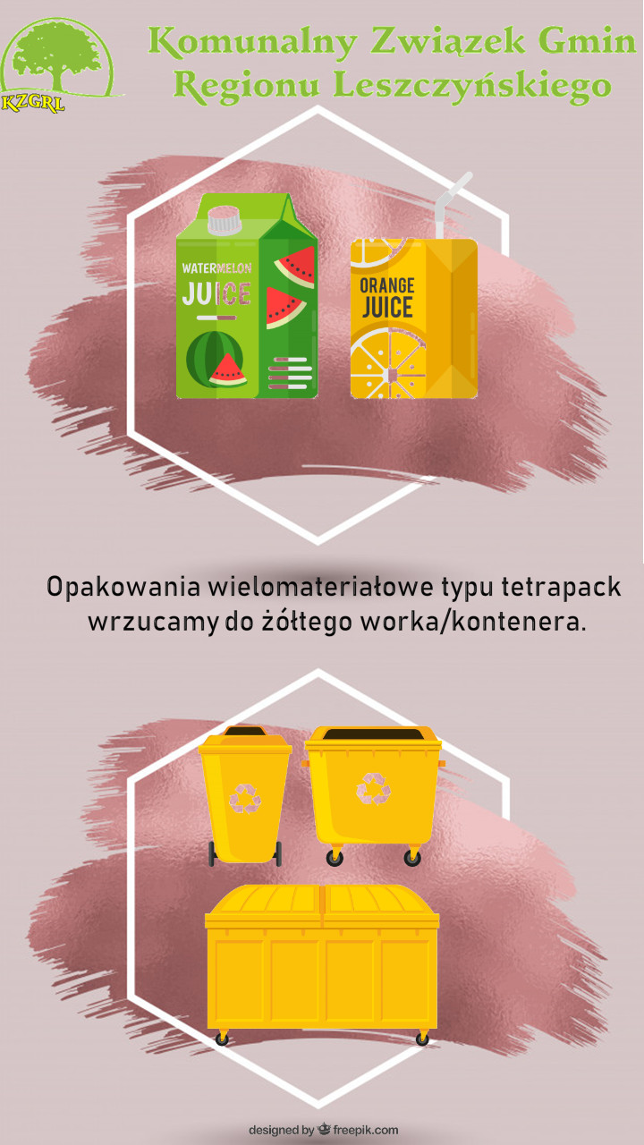 Z uwagi na powyższe na terenie działania Komunalnego Związku Gmin Regionu Leszczyńskiego zgodnie z umową zawartą przez KZGRL, która obowiązuje do końca 2019 roku, nie jest błędem wyrzucanie opakowań wielomateriałowych tzw. Tetrapack do niebieskiego worka/kontenera, gdyż taka właśnie zasada obowiązywała mieszkańców KZGRL na mocy zawartej umowy między KZGRL a firmami odbierającymi odpady oraz ZZO. Mając na uwadze powyższe wszystkie materiały edukacyjne, które zamieszczone są na stronach internetowych i stworzone zostały na potrzeby edukacji ekologicznej zgodnie z obowiązującymi zasadami są nadal aktualne, a materiały edukacyjne które powstały i powstawać będą po ogłoszeniu powyższego Rozporządzenia modyfikowane są o zmianę zasad postępowania z odpadami typu Tetrapack zachęcając mieszkańców aby wyrzucać je do żółtego worka/kontenera. Jednocześnie w ramach prowadzonych działań edukacyjnych KZGRL informuje mieszkańców o nadchodzących zmianach i okresie przejściowym trwającym do końca obowiązywania umowy. Dopuszcza się zatem możliwość wyrzucania odpadów wielomateriałowych typu Tetrapack za równo do niebieskiego worka/kontenera jak i żółtego worka/kontenera.