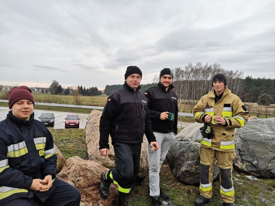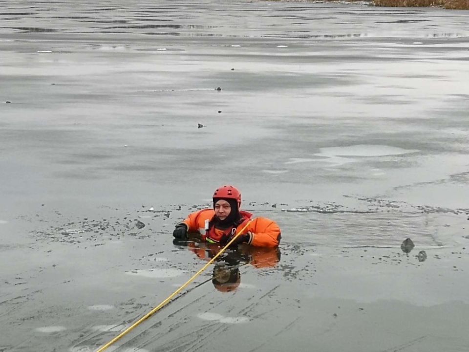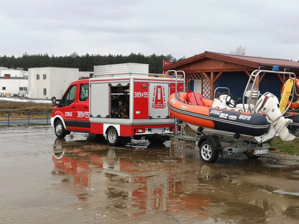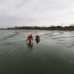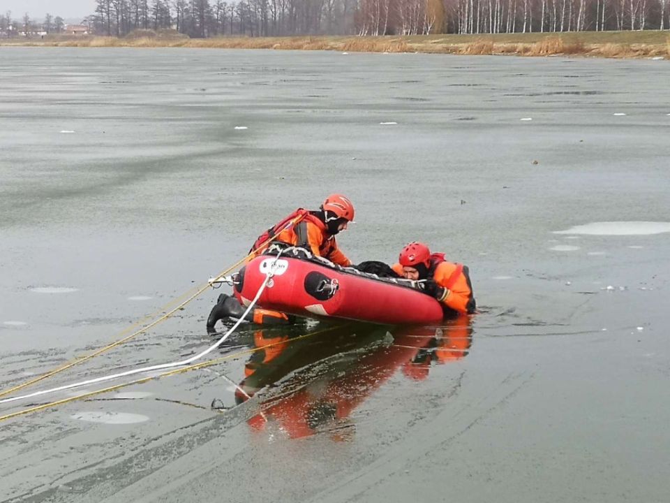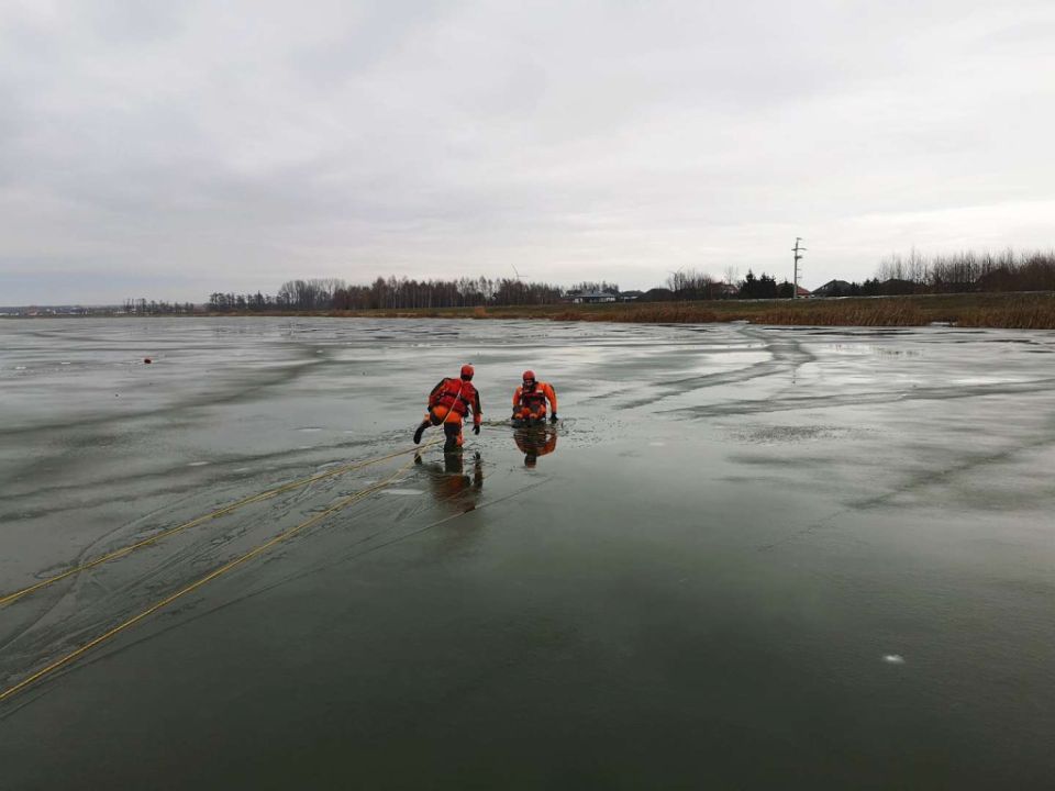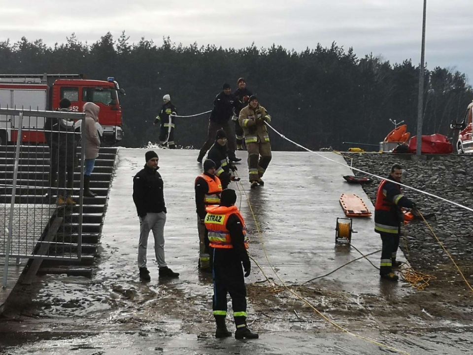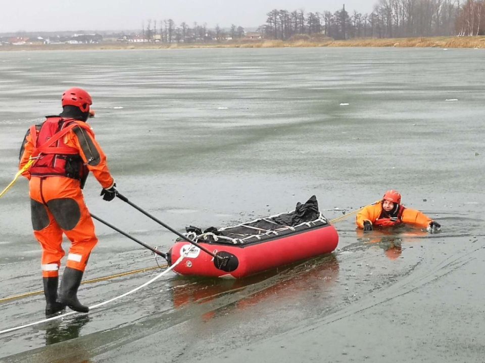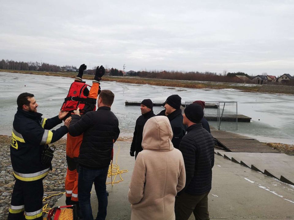 Strażacy z OSP w Rydzynie ćwiczyli na lodzie na zbiorniku Rydzyna w Dąbczu. Zajęcia polegały na wyciąganiu z wody osoby poszkodowanej, pod którą załamał się lód.