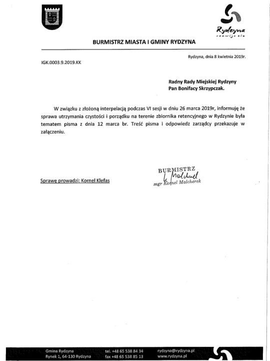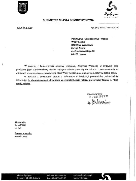 Poniżej pisma Gminy Rydzyna oraz Wód Polskich