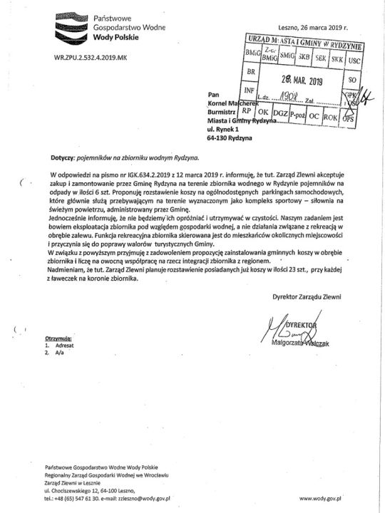 W odpowiedzi PGW Wody Polskie Dyrektor Zarządu Zlewni, Małgorzata Walczak proponuje rozstawienie koszy na ogólnie dostępnych parkingach, które głównie służą przebywającym na terenie wyznaczonym jako kompleks sportowy, siłownia na świeżym powietrzu administrowanym przez gminę Rydzyna. Jednocześnie informuje, że nie będzie ich opróżniać i utrzymywać w czystości pojemników na śmieci.
