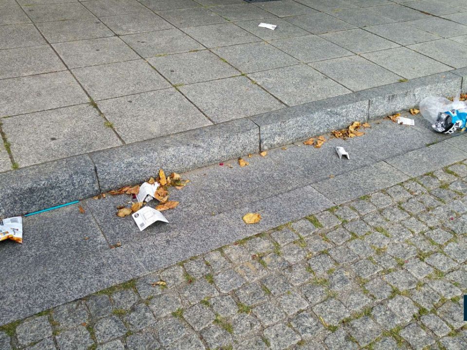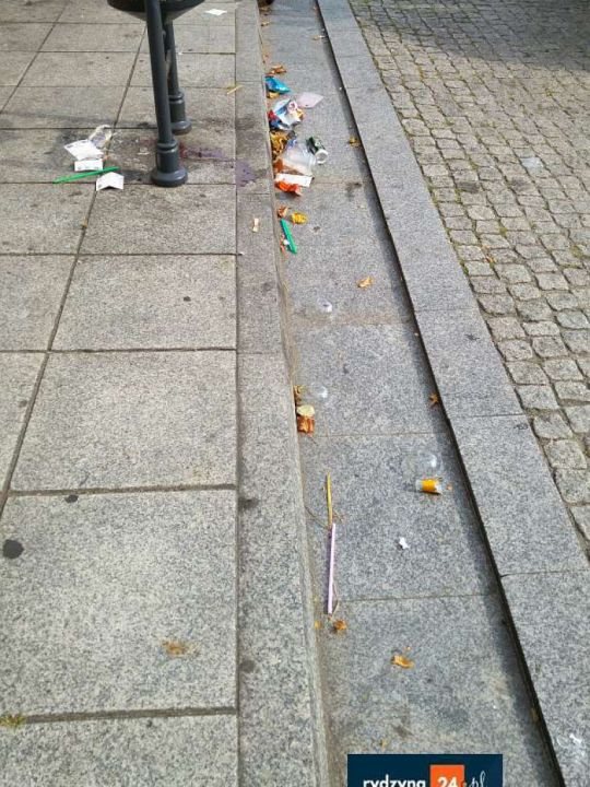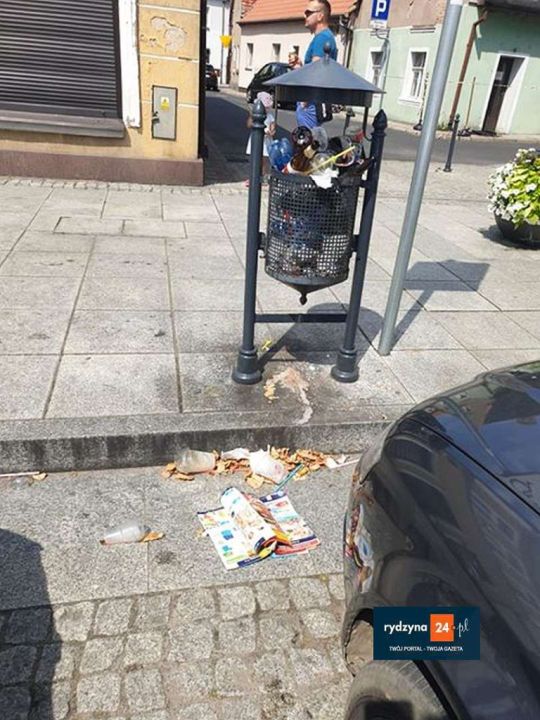 „Wybierając się na spacer, przechodzimy przez Rynek w Rydzynie tu taka niespodzianka” – piszą, poruszając temat śmieci pozostawionych w centrum miasteczka.