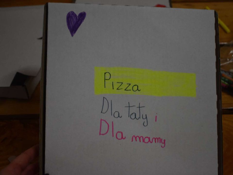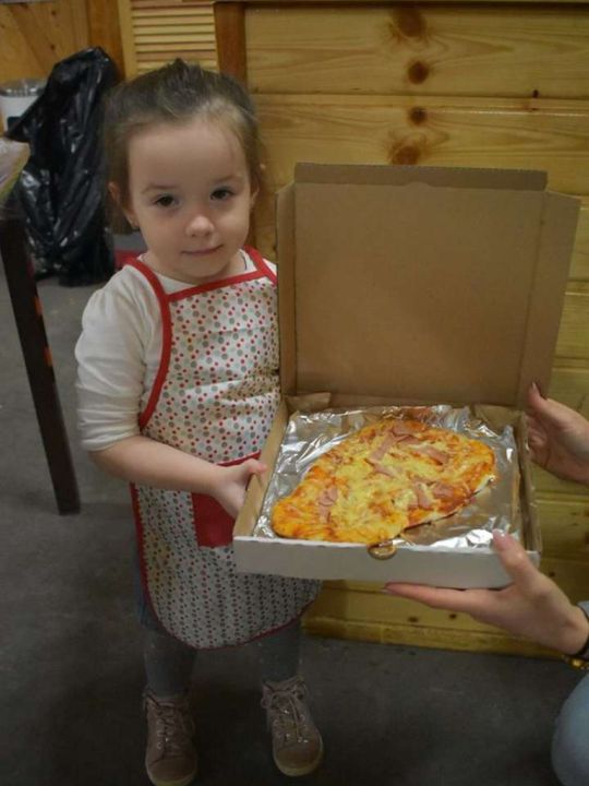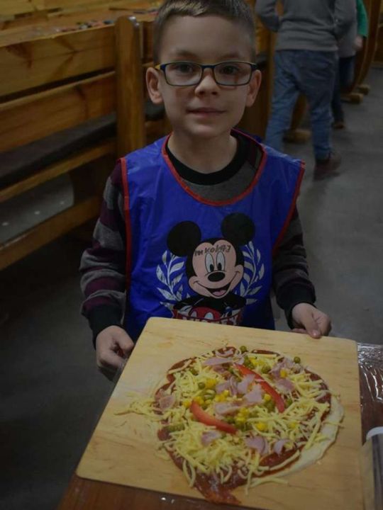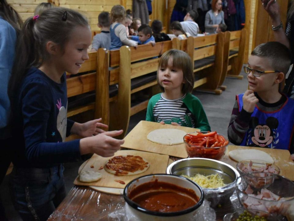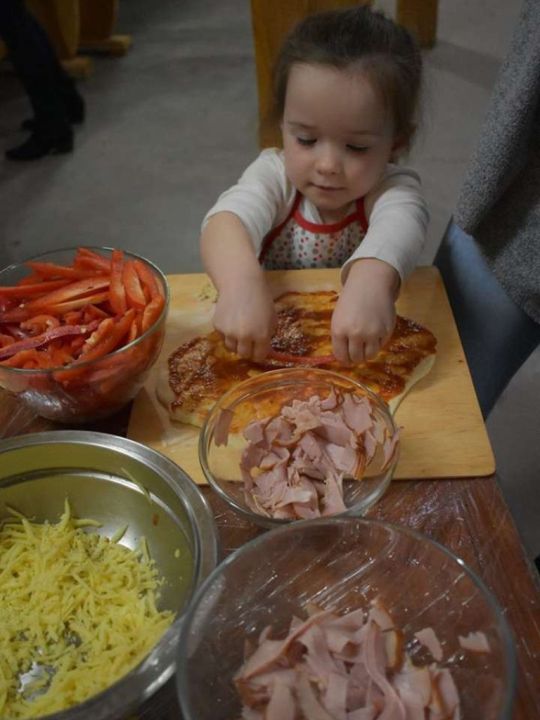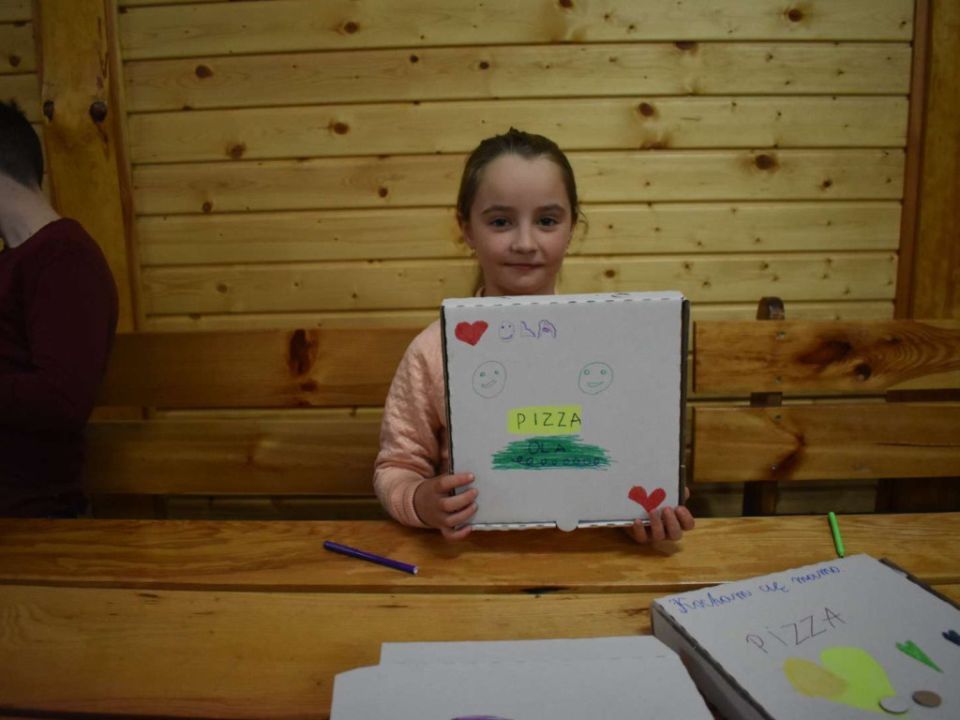 Podczas spotkania dzieci wałkowały ciasto oraz nakładały ulubione dodatki. W trakcie wypiekania pizzy uczestnicy dekorowali opakowania w których zanieśli pizze rodzicom. Nie zabrakło również zabawy i gier planszowych.