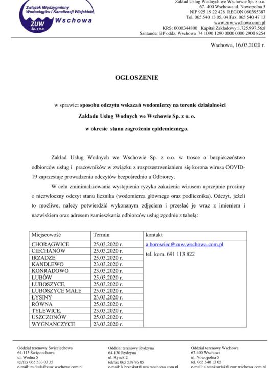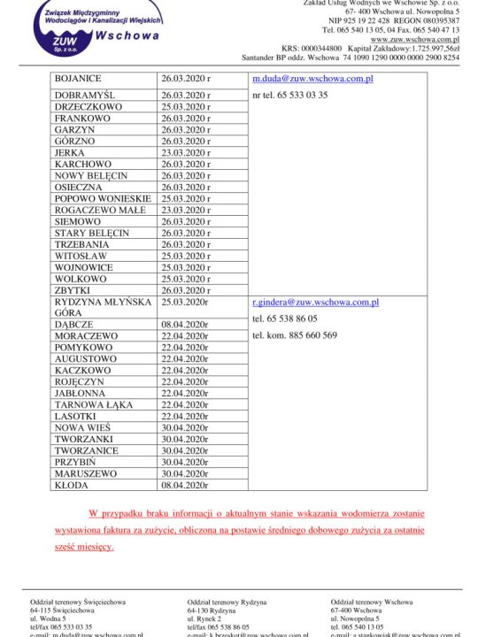 Sposób odczytu wodomierzy na terenie działalności ZUW we Wschowie Sp. z o. o. Wiadomości 2020-03-18 BRAK TREŚCI