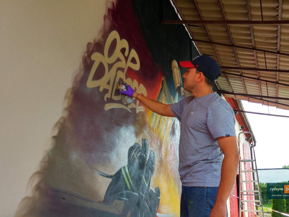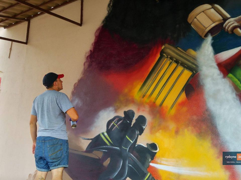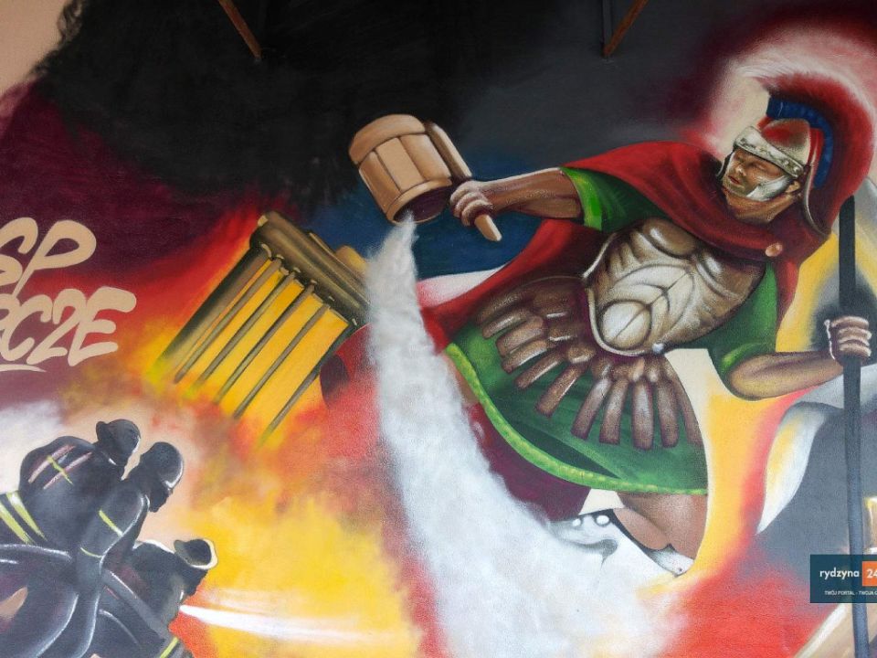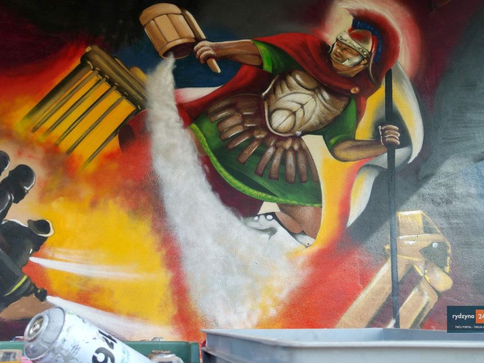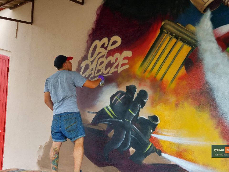 Na ścianie frontowej remizy w Dąbczu powstał mural przedstawiający św. Floriana.