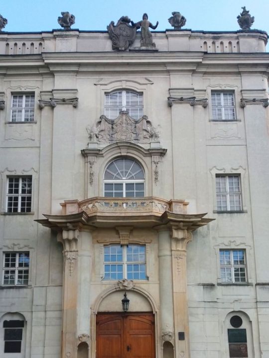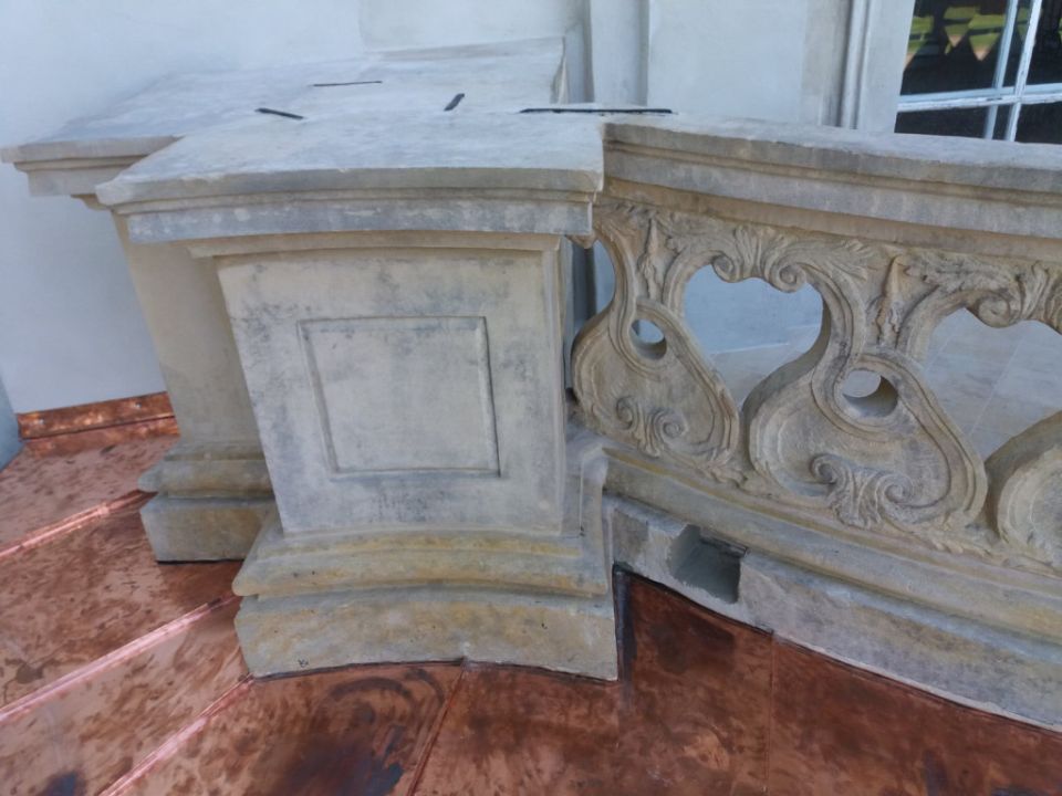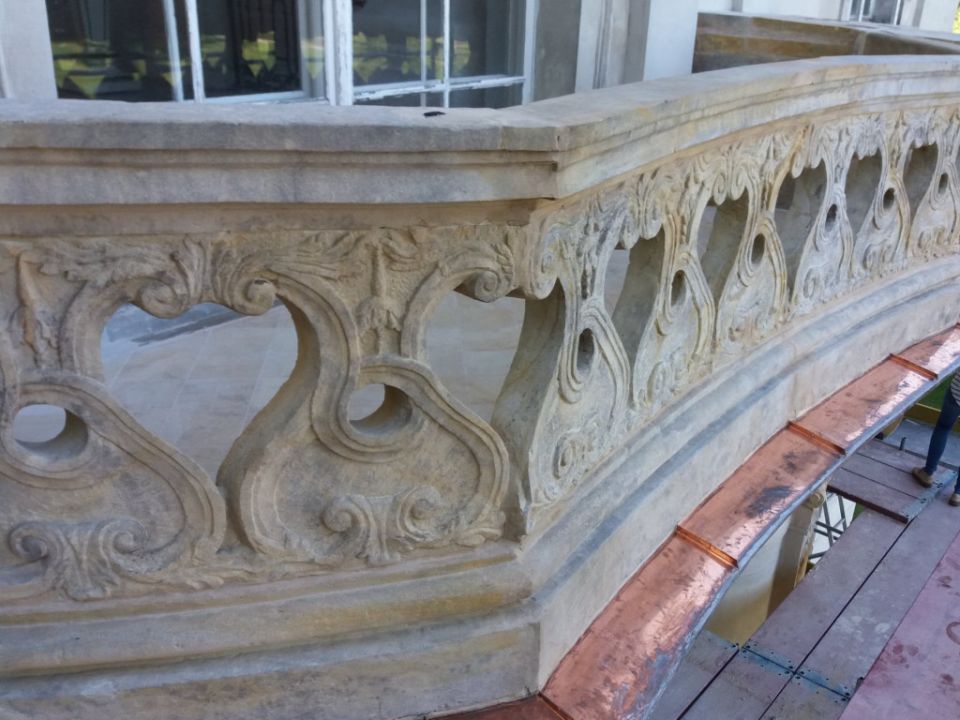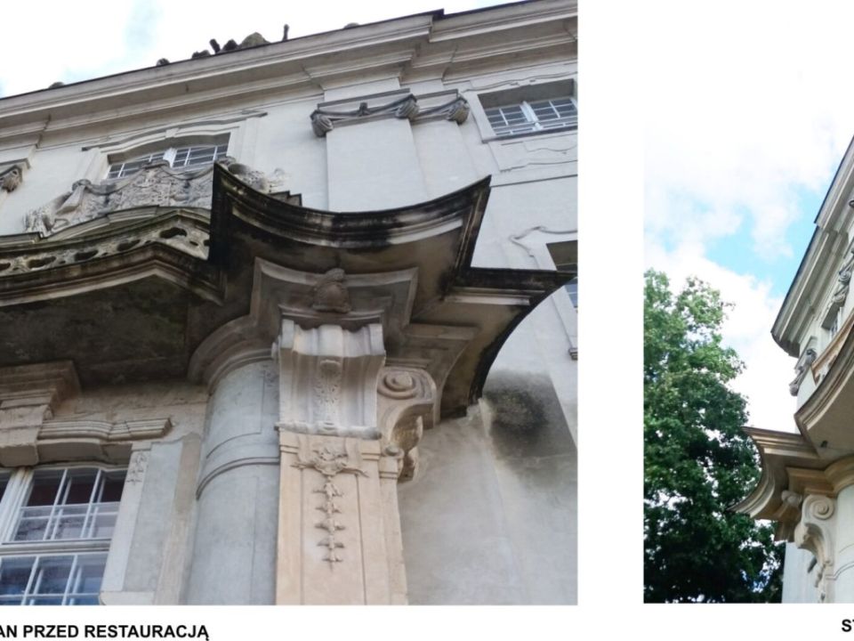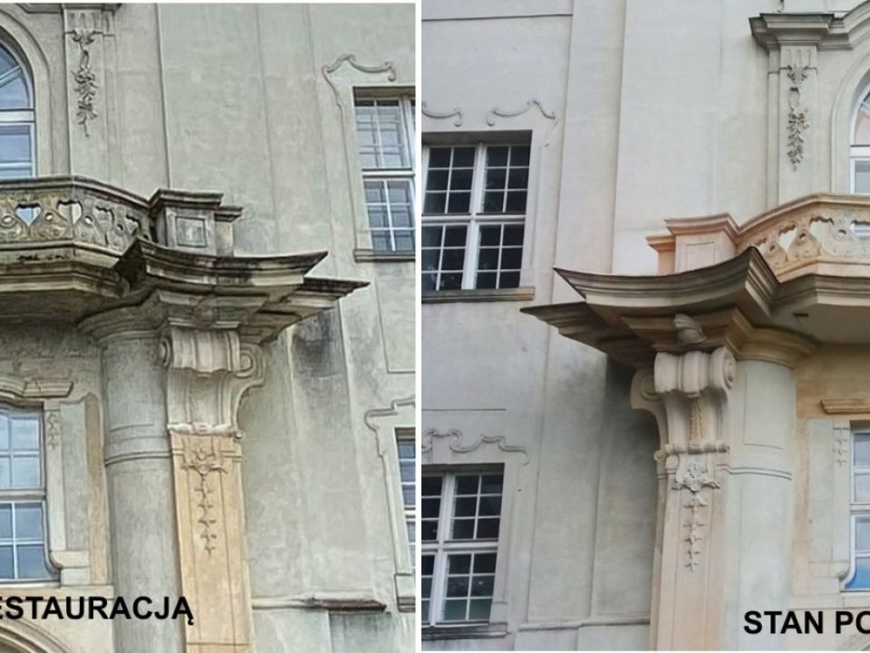 10.09. zlikwidowano rusztowanie znajdujące się w obrębie wejścia do budynku. Prace obejmowały zarówno oczyszczenie samego balkonu i jego najbliższego otoczenia, jak również naprawę balustrady, zerwanie starej posadzki i położenie nowej- z piaskowca z wcześniejszym wyizolowaniem podłoża. Ponadto dokonano naprawy całej płyty balkonowej wraz z zabudowaniem górnej powierzchni blachą miedzianą. Działanie to skutecznie zabezpieczy wpływanie wody pod płytę balkonową. Naprawiono też i częściowo zrekonstruowano uszkodzone elementy zdobnicze zlokalizowanych pod balkonem. Wymieniono też część tynków niemal całkowicie wypłukanych przez wodę opadową.