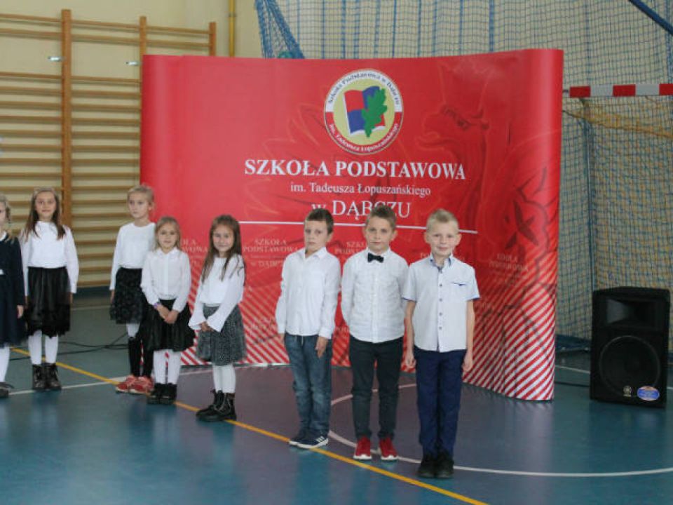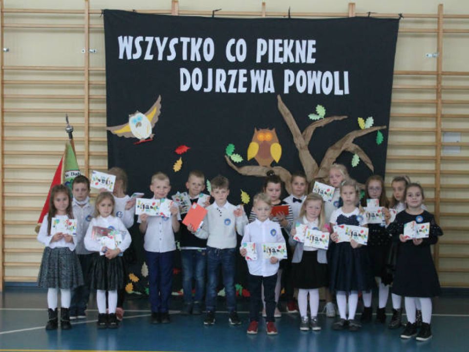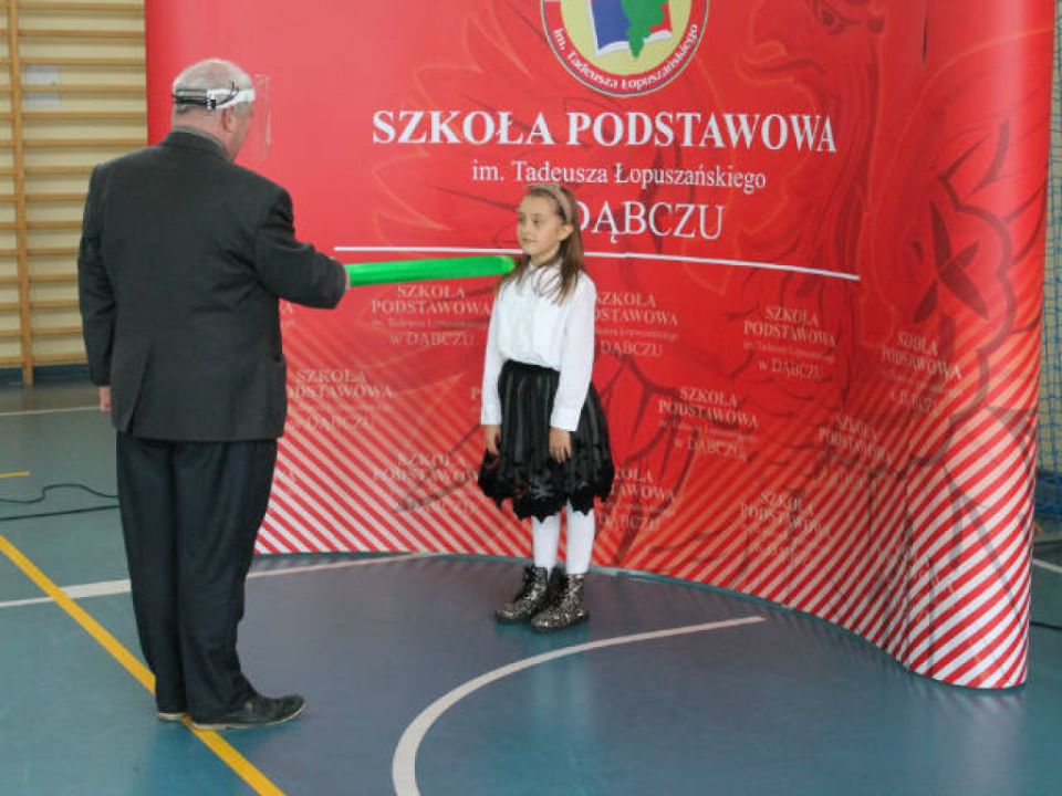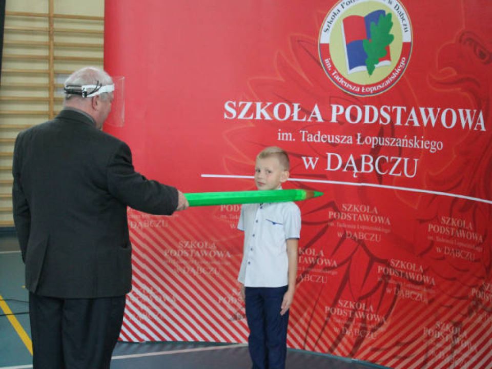 29.10. 2020 roku dzieci z klas pierwszych z Dąbcza zostały uroczyście pasowane na Pierwszoklasistów. Z uwagi na epidemię i związane z nią wymogi sanitarne, uroczystość miała zupełnie inną oprawę. Obecni na sali byli tylko uczniowie, ich wychowawcy oraz Dyrekcja Szkoły. Warunki te nie przeszkodziły jednak dzieciom, które pięknie zaprezentowały swoje aktorskie umiejętności. Po złożeniu ślubowania aktu pasowania dokonał Pan Dyrektor. Następnie dzieci otrzymały legitymacje szkolne i wiele upominków.