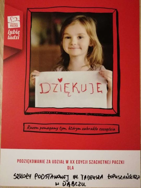 Po raz pierwszy rodzice, uczniowie i pracownicy Szkoły Podstawowej im. Tadeusza Łopuszańskiego w Dąbczu wzięli udział w dobroczynnej akcji „Szlachetna Paczka”. Wybrana została jedna z rodzin i według listy potrzeb przygotowano dla niej wyjątkową „paczkę” na święta. Potrzeby rodziny były różnorodne, ale udało się zrealizować je wszystkie.