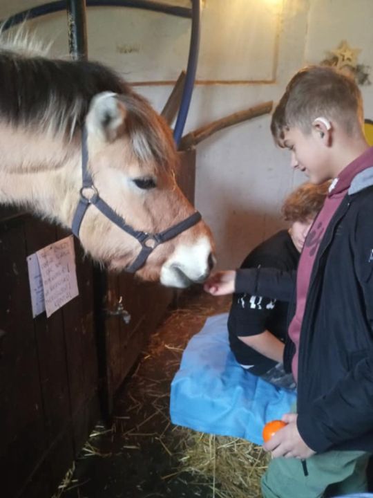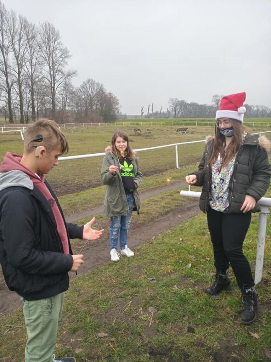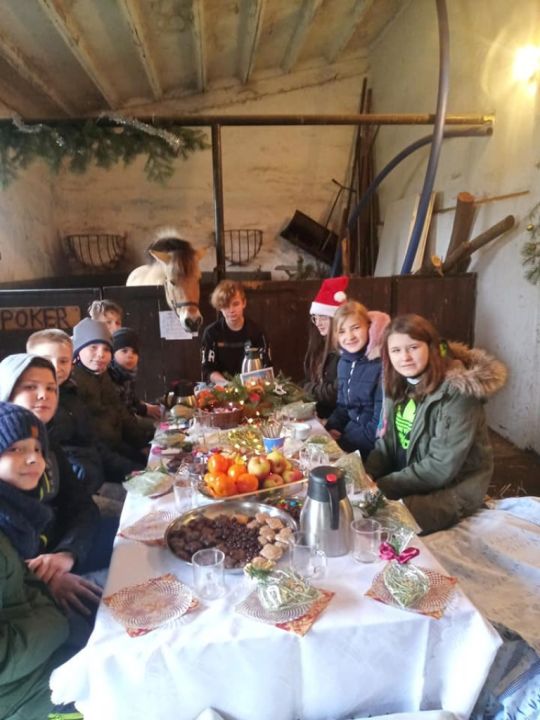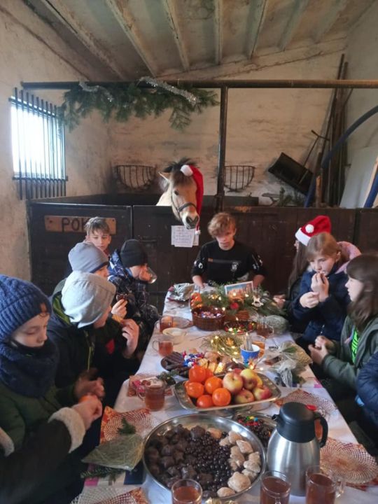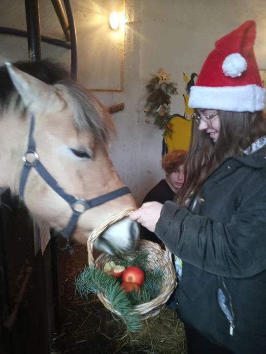 Uczniowie SOSW spotkali się w stajni u jej gospodarza – konia Pokera. Składali sobie życzenia, podzielili się opłatkiem z Pokerem. Był słodki poczęstunek, a każdy uczestnik otrzymał sianko, tradycyjnie wysadzane pod obrus w czasie wieczerzy wigilijnej. Dzieci spędzili czas świątecznie i radośnie.