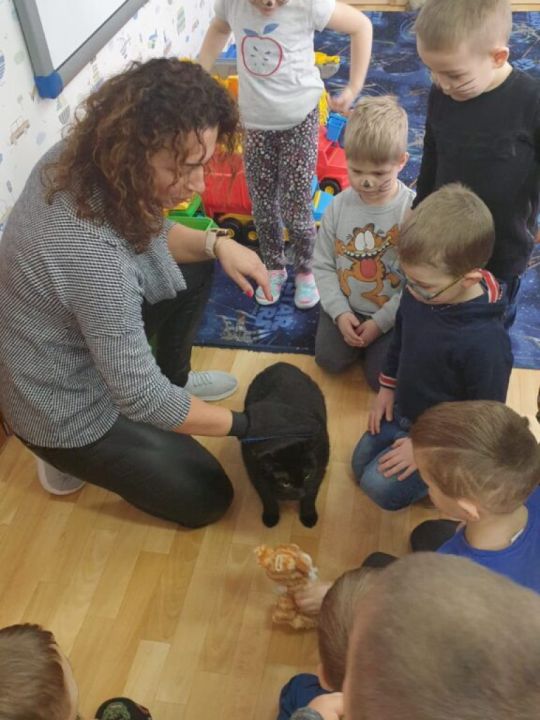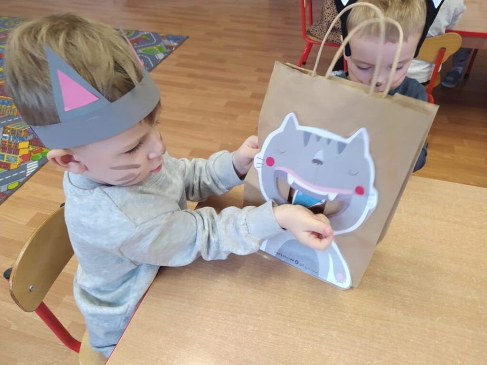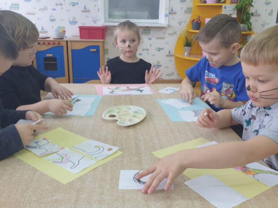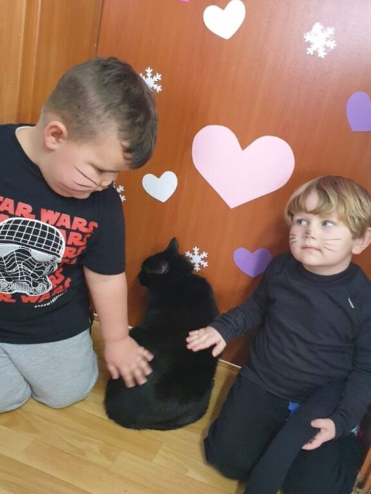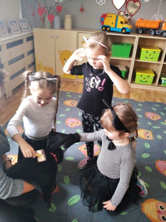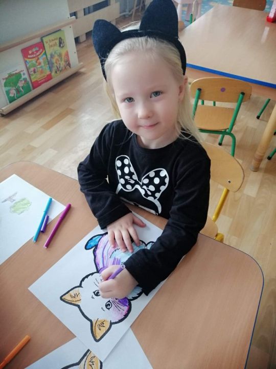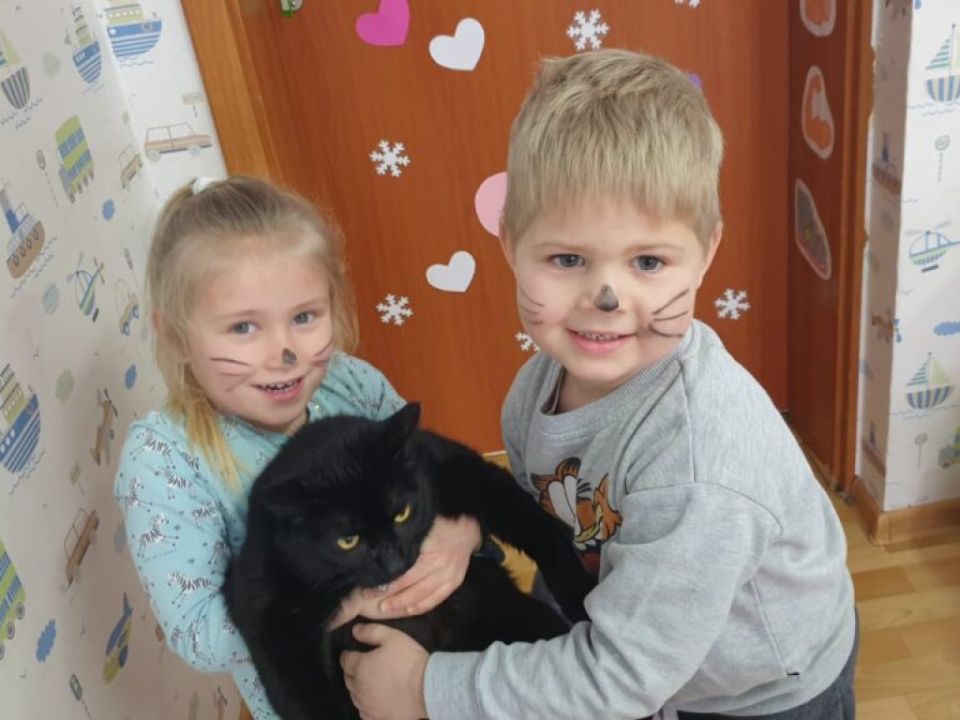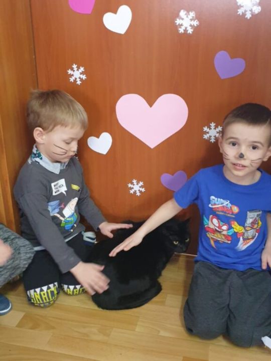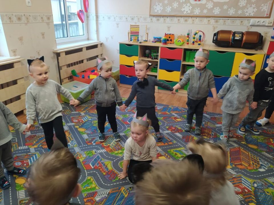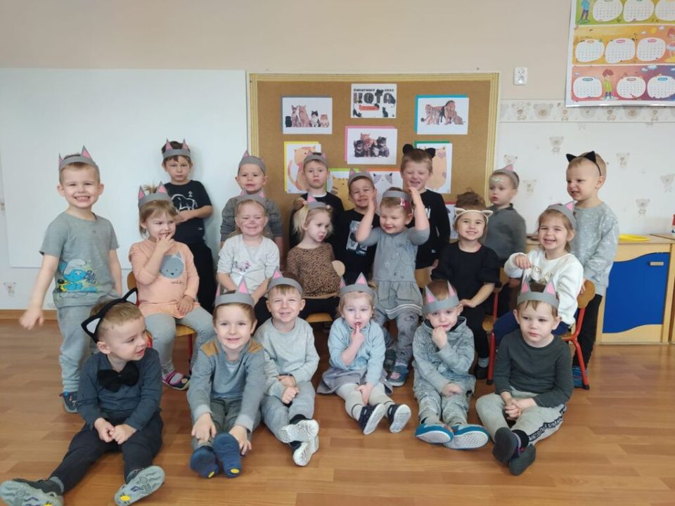 Spotkanie rozpoczęło się wspólnymi zabawami przy muzyce, dzieci z zainteresowaniem oglądały ilustracje różnych kotów, nadając im imiona, rozwiązywały zagadki, słuchały wiersza, „Kotek”, aktywnie uczestniczyły w zabawie w formie opowieści ruchowej miaucząc, robiąc koci grzbiet, mrucząc i chlipiąc mleczko.