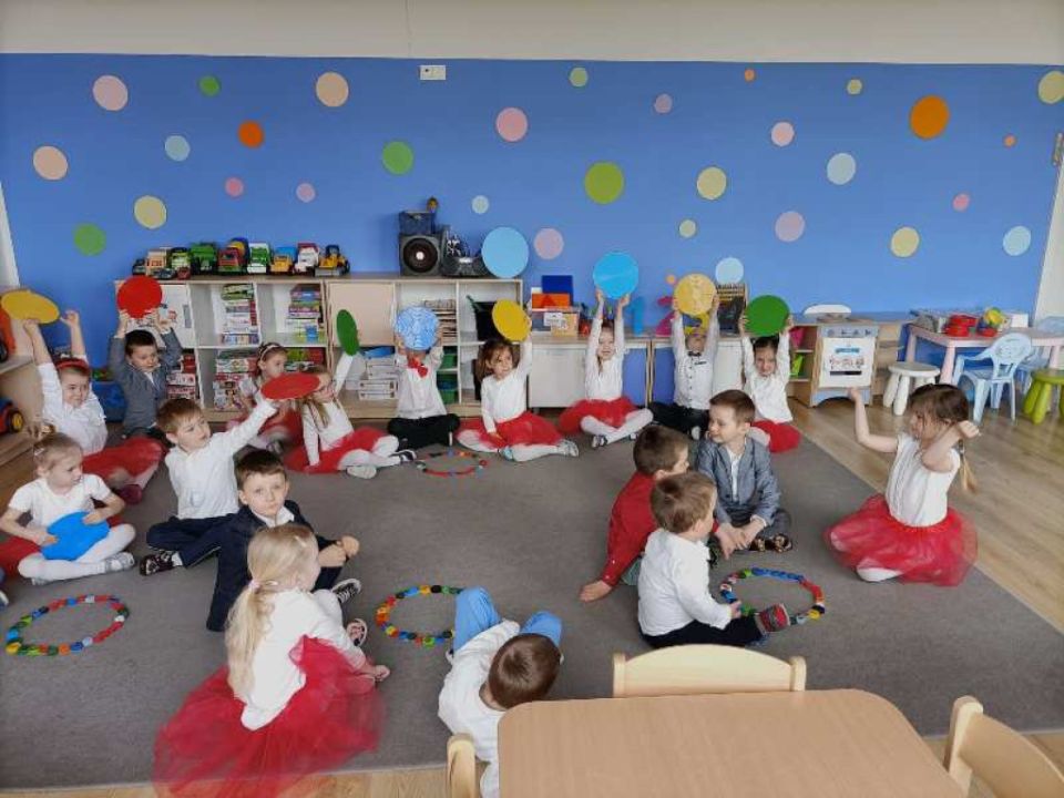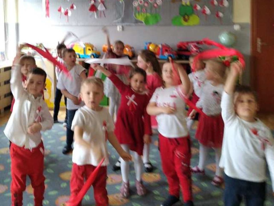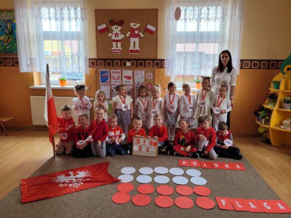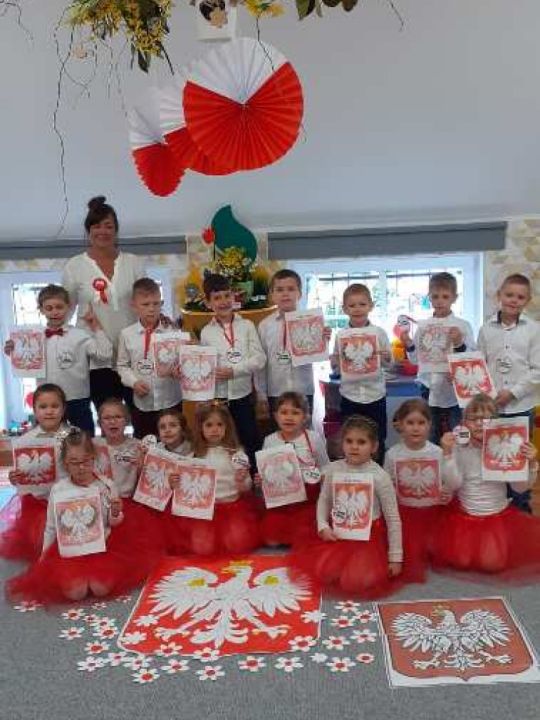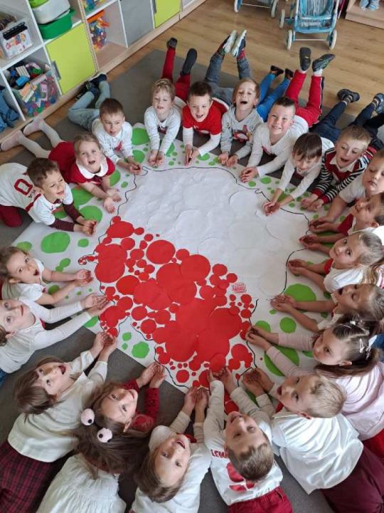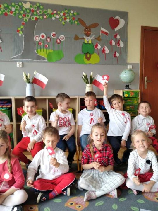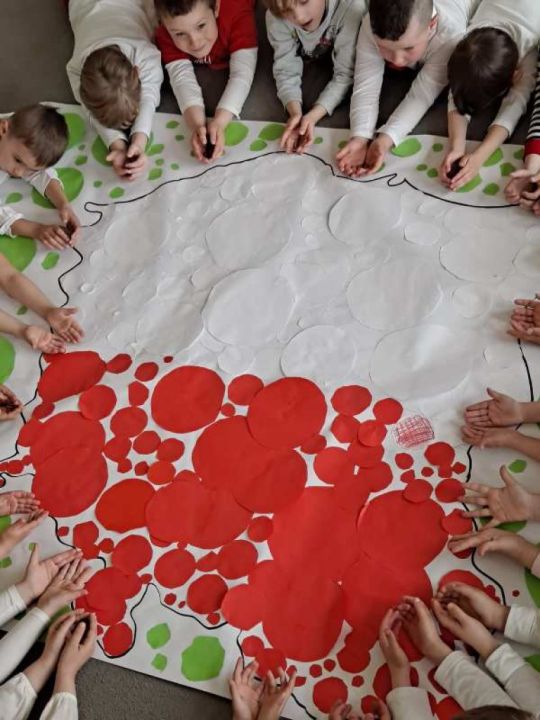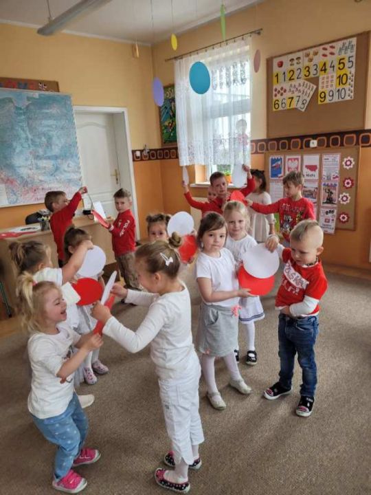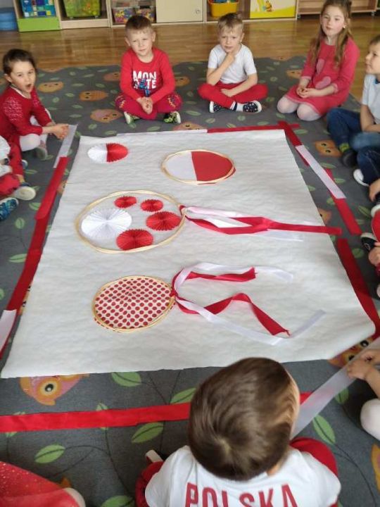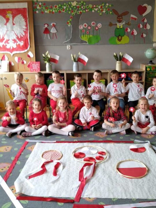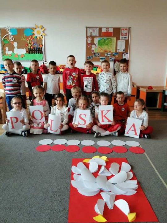 W przedszkolu było bardzo patriotycznie. Dzieci obchodziły dzień z kołem biało- czerwonym. Rozmawiały też o symbolach narodowych. Przedszkolacy wiedzą już o naszej Ojczyźnie bardzo dużo. Znają godło, hymn, kolory flagi polskiej, wiersze o Polsce oraz śpiewają patriotyczne piosenki. Dzieci potrafią wskazać Polskę na mapie oraz wymienić najważniejsze miasta i rzeki. Przy okazji przedszkolacy poznali nową figurę geometryczną- koło i podczas zabaw matematycznych utrwalali jej wygląd.