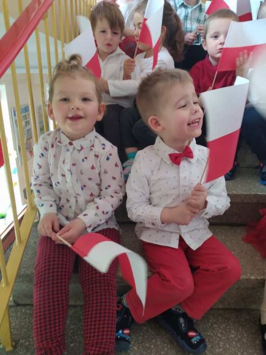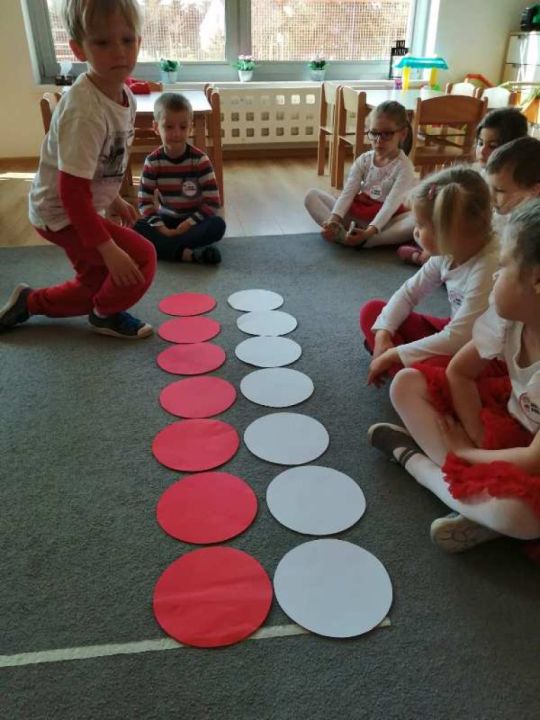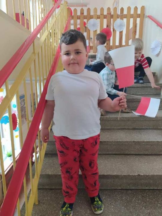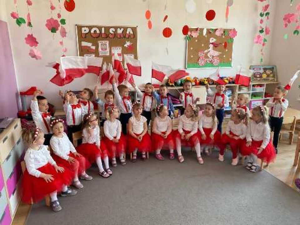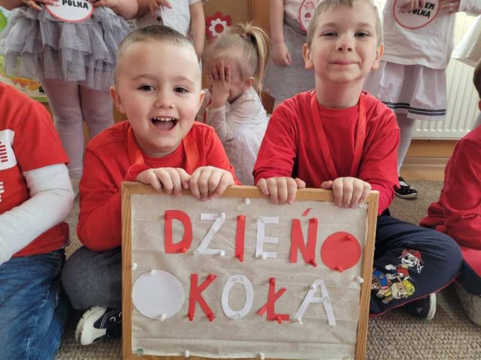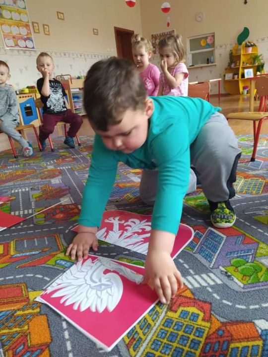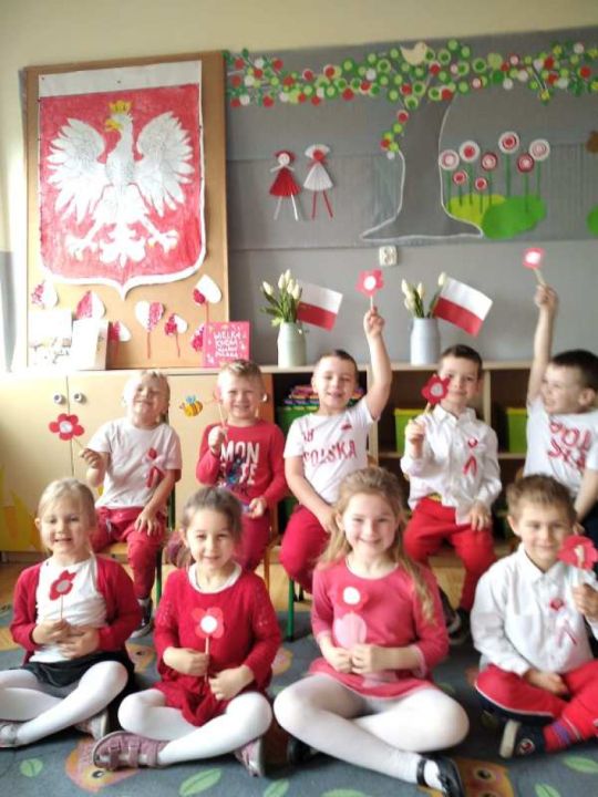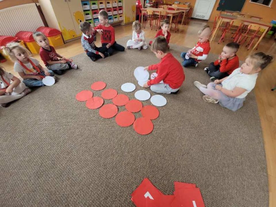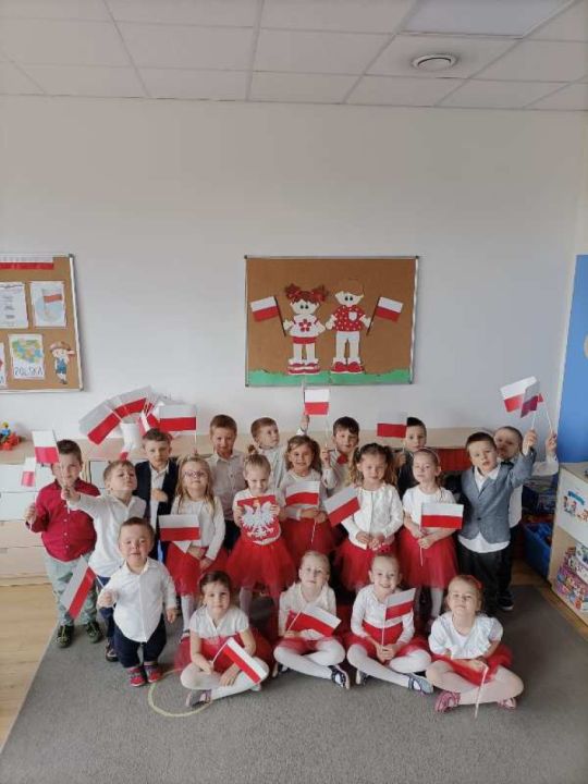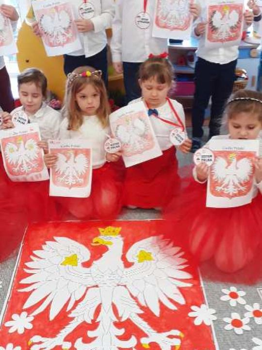 W przedszkolu było bardzo patriotycznie. Dzieci obchodziły dzień z kołem biało- czerwonym. Rozmawiały też o symbolach narodowych. Przedszkolacy wiedzą już o naszej Ojczyźnie bardzo dużo. Znają godło, hymn, kolory flagi polskiej, wiersze o Polsce oraz śpiewają patriotyczne piosenki. Dzieci potrafią wskazać Polskę na mapie oraz wymienić najważniejsze miasta i rzeki. Przy okazji przedszkolacy poznali nową figurę geometryczną- koło i podczas zabaw matematycznych utrwalali jej wygląd.