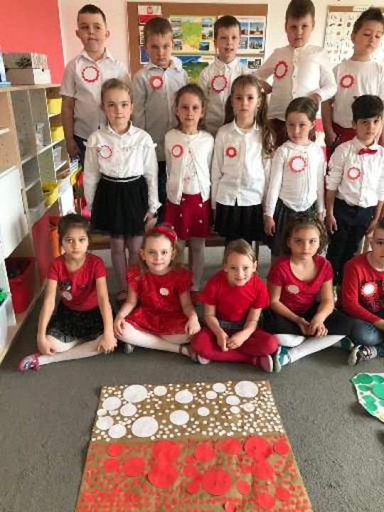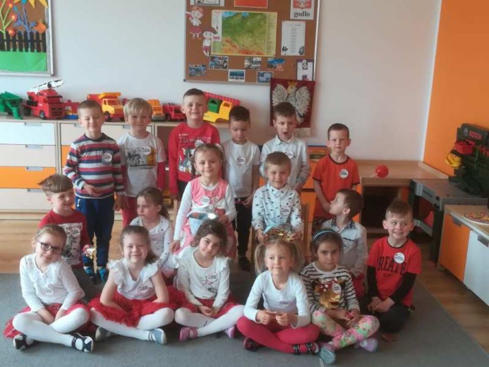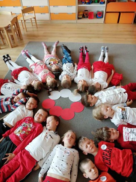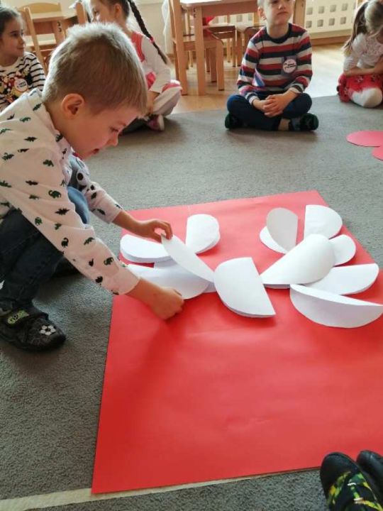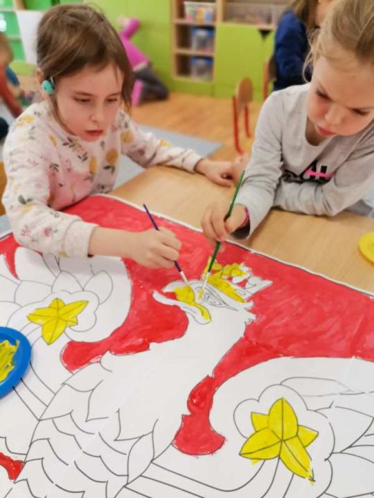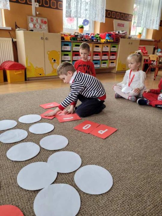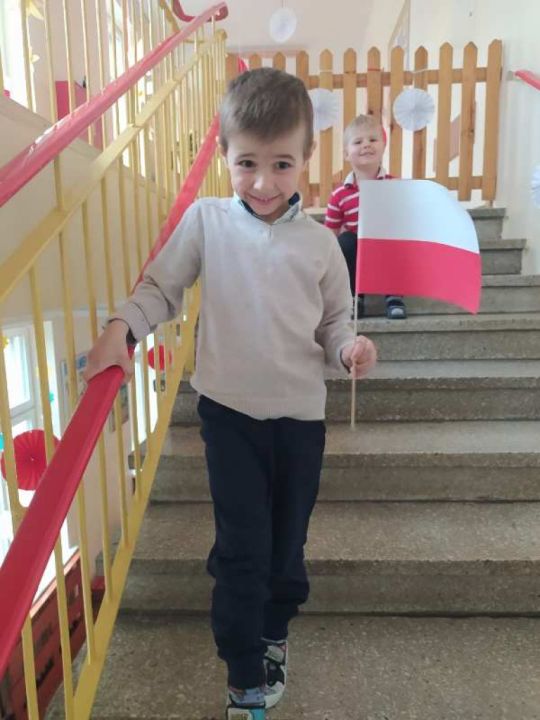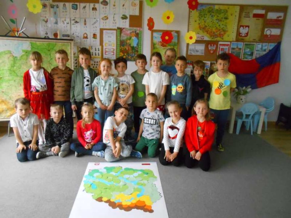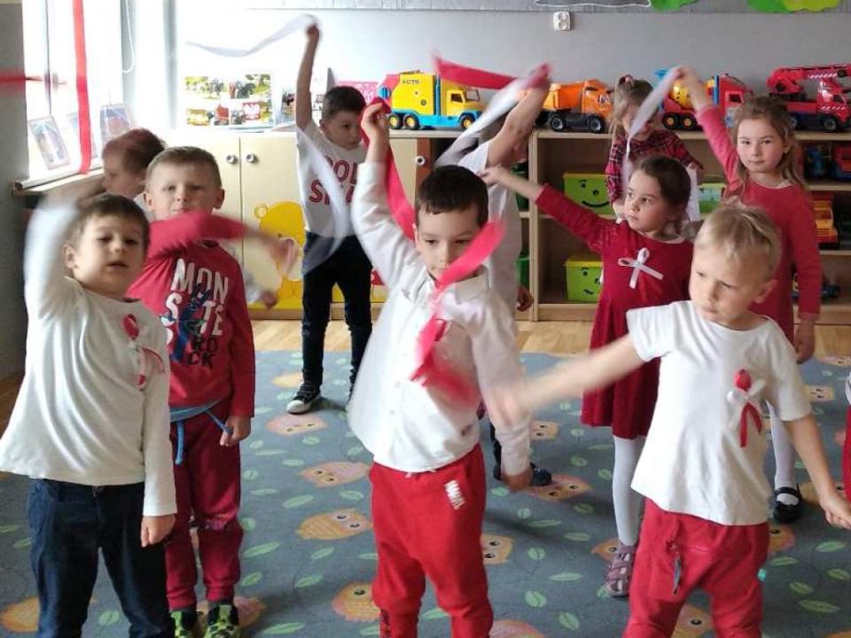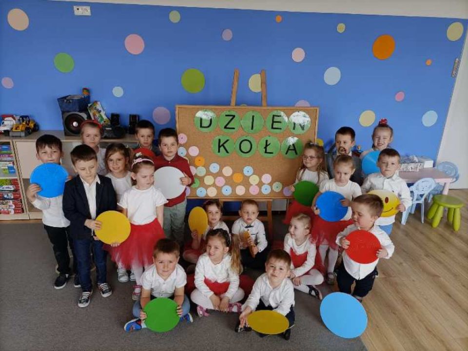 W przedszkolu było bardzo patriotycznie. Dzieci obchodziły dzień z kołem biało- czerwonym. Rozmawiały też o symbolach narodowych. Przedszkolacy wiedzą już o naszej Ojczyźnie bardzo dużo. Znają godło, hymn, kolory flagi polskiej, wiersze o Polsce oraz śpiewają patriotyczne piosenki. Dzieci potrafią wskazać Polskę na mapie oraz wymienić najważniejsze miasta i rzeki. Przy okazji przedszkolacy poznali nową figurę geometryczną- koło i podczas zabaw matematycznych utrwalali jej wygląd.