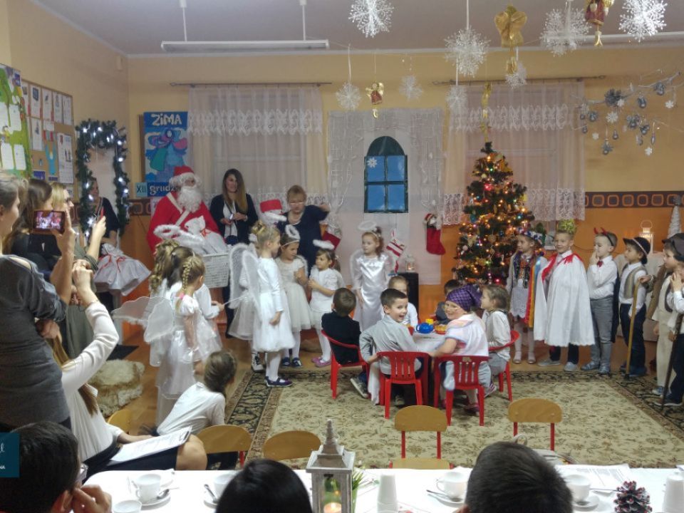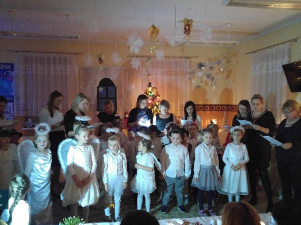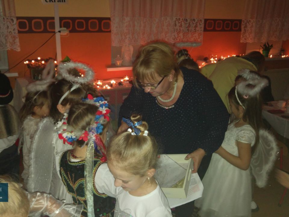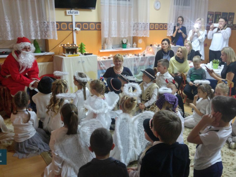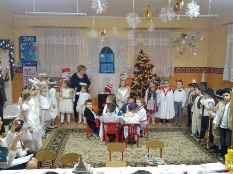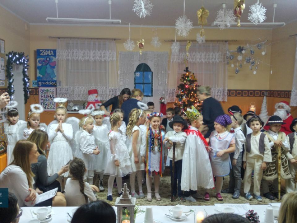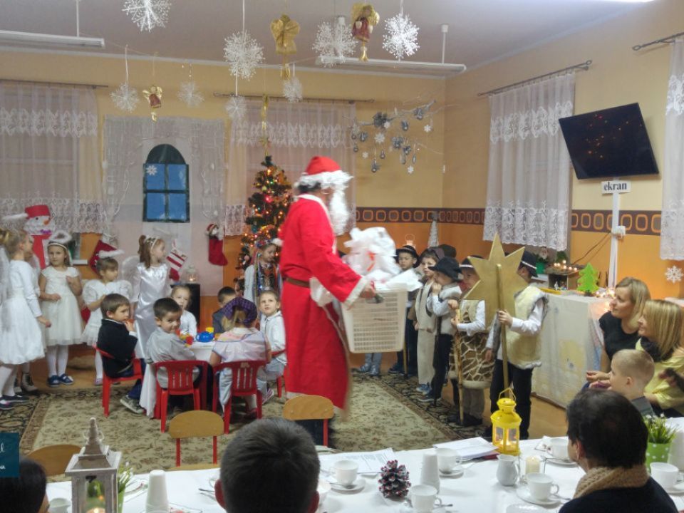 Wystrój sali, zapach  świerkowych gałązek  oraz  świątecznych pieników - pieczonych i  zdobionych przez dzieci,  melodie i wspólne śpiewanie kolęd,  dzielenie opłatkiem sprawiły, że wszystkim udzielił się ten "magiczny" świąteczny  nastrój. Po występie na wszystkie dzieci czekał  Gwiazdor, upominki  oraz słodki poczęstunek . Było uroczyście,  kolorowo i świątecznie.