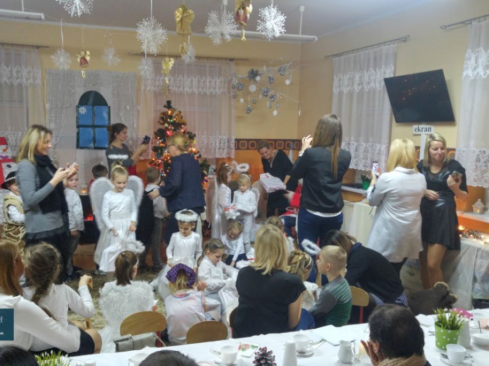 Wystrój sali, zapach świerkowych gałązek oraz świątecznych pieników - pieczonych i zdobionych przez dzieci, melodie i wspólne śpiewanie kolęd, dzielenie opłatkiem sprawiły, że wszystkim udzielił się ten "magiczny" świąteczny nastrój. Po występie na wszystkie dzieci czekał Gwiazdor, upominki oraz słodki poczęstunek . Było uroczyście, kolorowo i świątecznie. Niejednemu w oku zalśniła łza, gdy usłyszał słowa: ,,..niebo ziemi, niebu ziemia, wszyscy wszystkim ślą życzenia!".