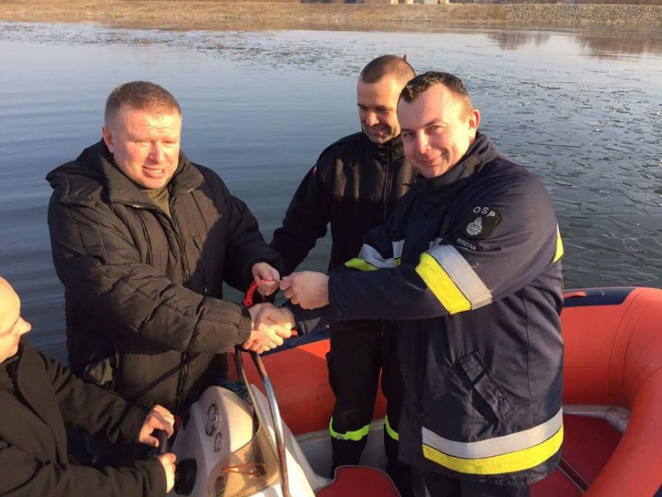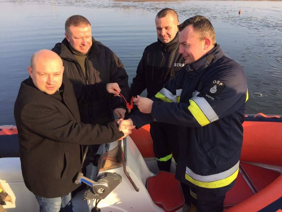 Ochotnicza Straż Pożarna z Rydzyny spotkała się przy zbiorniku w celu odebrania nowego silnika zaburtowego. Jest to prezent gwiazdkowy od Starostwa Powiatowego oraz Urzędu Miasta i Gminy Rydzyna.