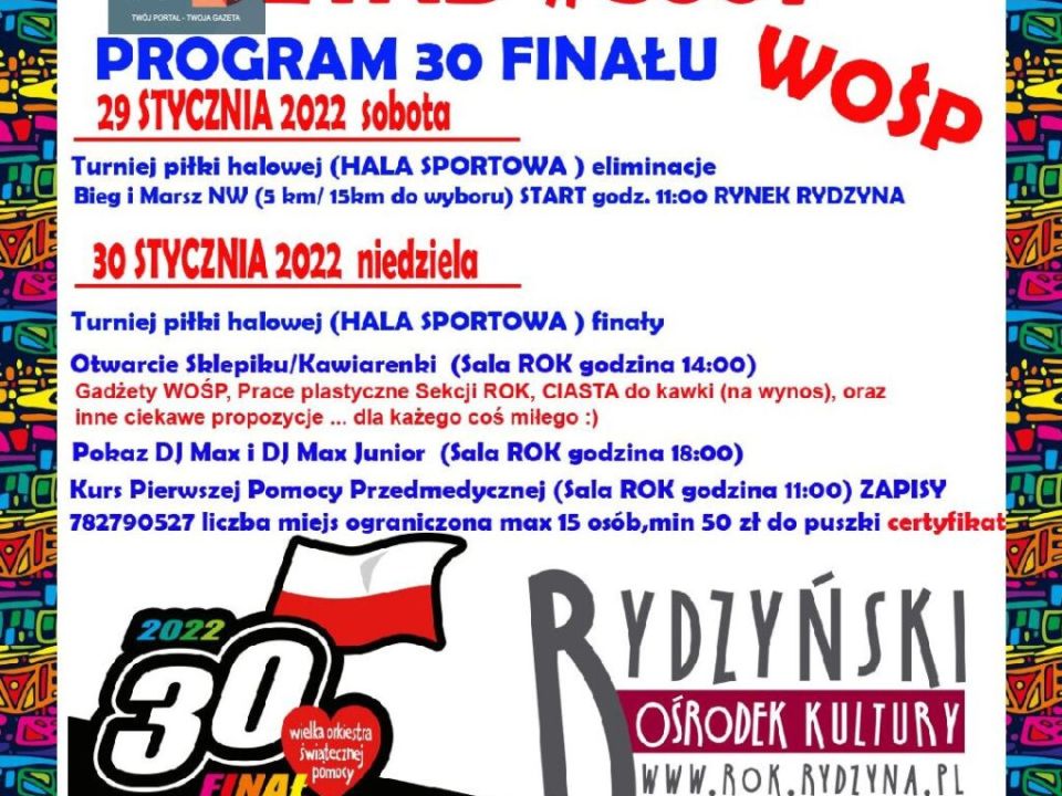 W sobotę odbędzie się bieg Charytatywny Bieg dla WOŚP od Serca…dla Serca, na który też serdecznie zapraszamy w hali sportowej w Rydzynie rozegrany zostanie turniej piłki halowej.