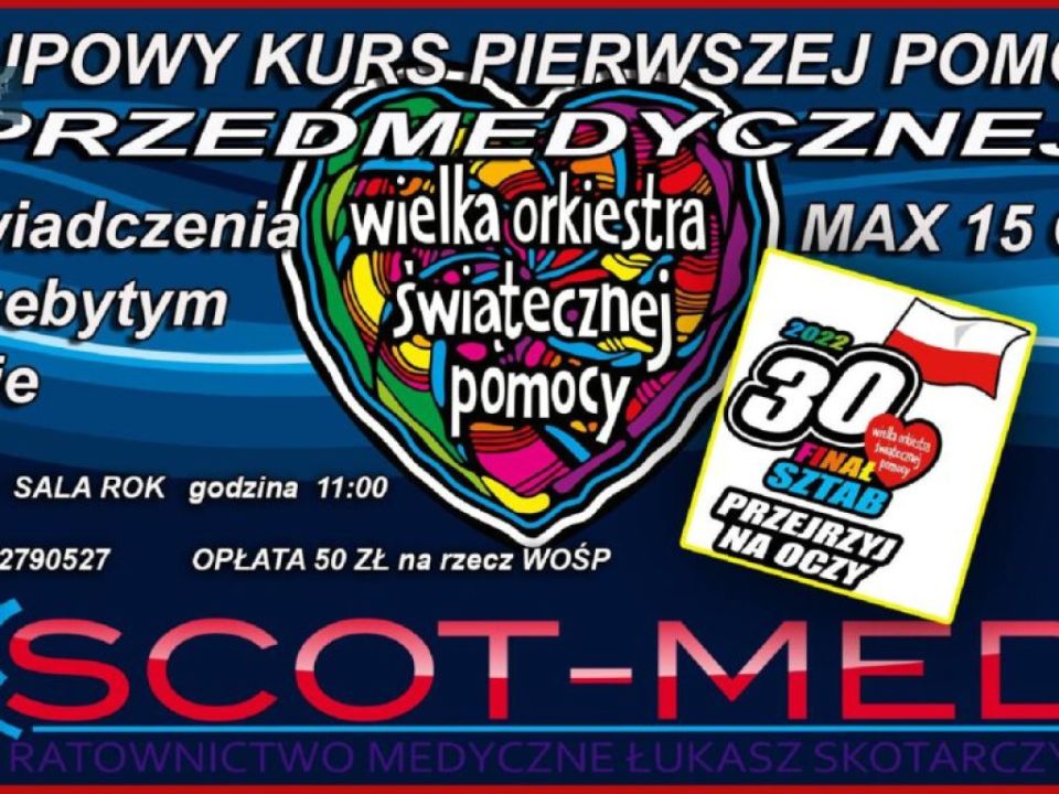 Kurs Pierwszej Pomocy Przedmedycznej odbędzie się 30 stycznia o godzinie 11:00 w sali ROK Obowiązują zapisy i informacje 782790527 Ilość miejsc ograniczona instruktor Łukasz Skotarczyk (zaświadczenie o ukończeniu kursu).